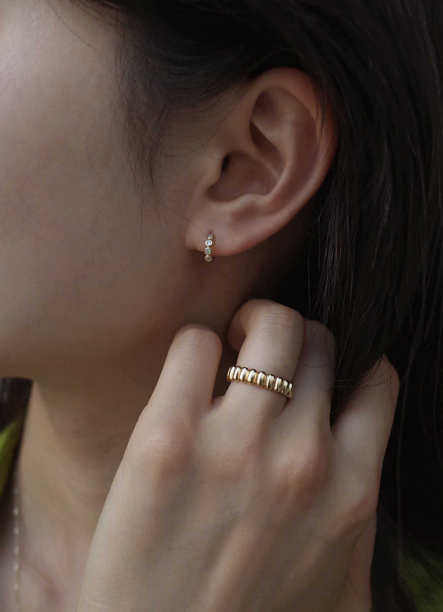 귀를 감싸는 아담한 사이즈의 원터치 이어링입니다. 베젤 방식으로 스톤이 세팅되어 머리카락 걸림이 없으며 심플하면서도 여성스러움이 느껴지는 세련된 무드의 제품입니다.