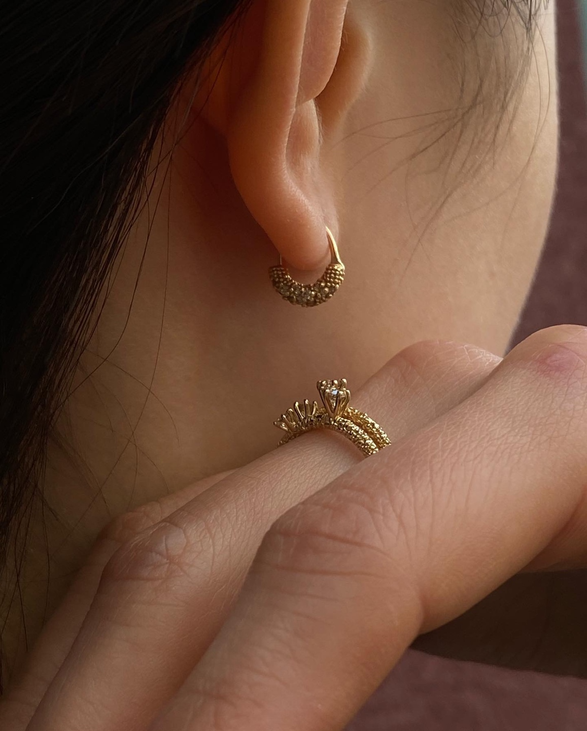 거칠고 울퉁불퉁한 돌 표면에 다이아가 촘촘하게 박힌 듯 섬세한 세공으로 제작된 완성도 높은 원터치 이어링입니다. 세밀하면서도 입체적인 표면과 반짝이는 다이아몬드의 조합으로 멀리서 보았을 때 글리터링한 착시 효과가 느껴지는 제품입니다.