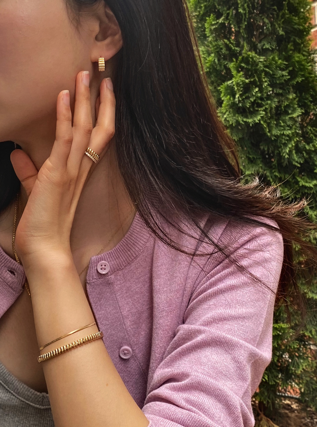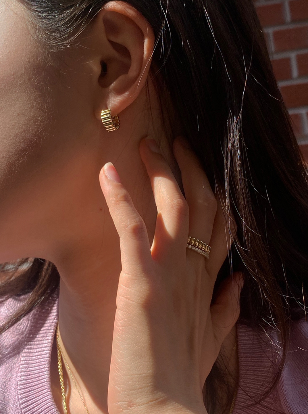 볼륨감있는 완만한 곡선 쉐입의 샬롯은 정교하게 다듬어진 패턴형 디자인으로 다양한 각도에서 아름다운 형태를 유지합니다. 샬롯 이어링은 와이드한 너비에 안쪽까지 속을 채워 견고함이 느껴지는 원터치 방식의 이어링입니다.