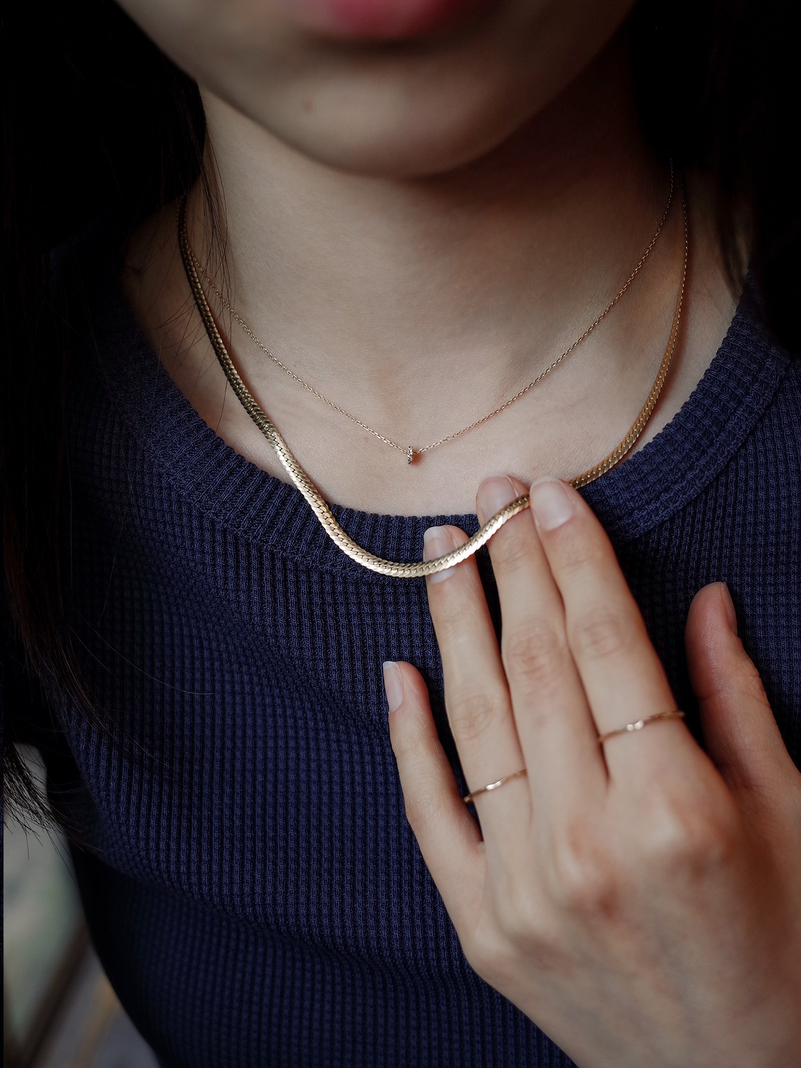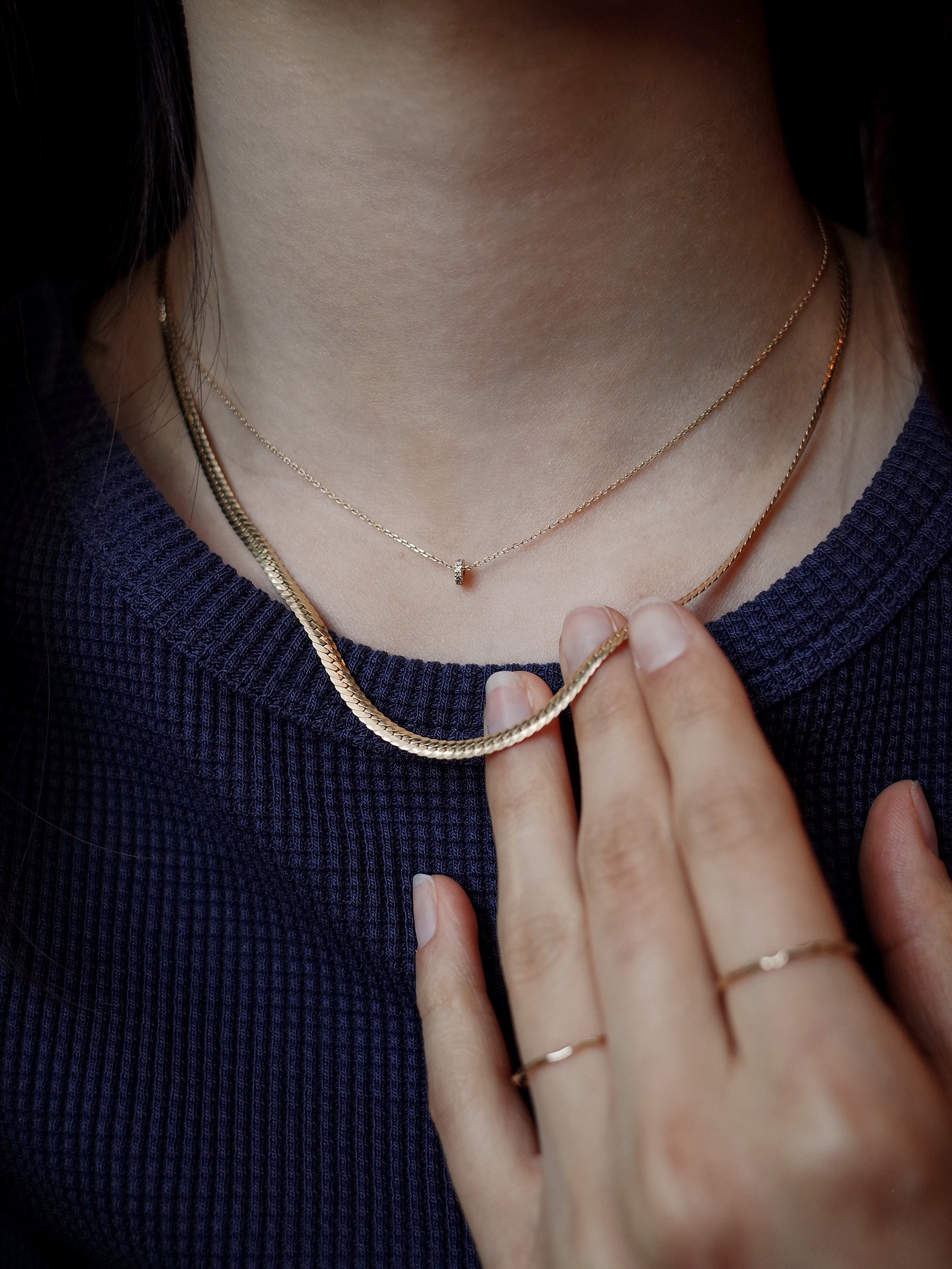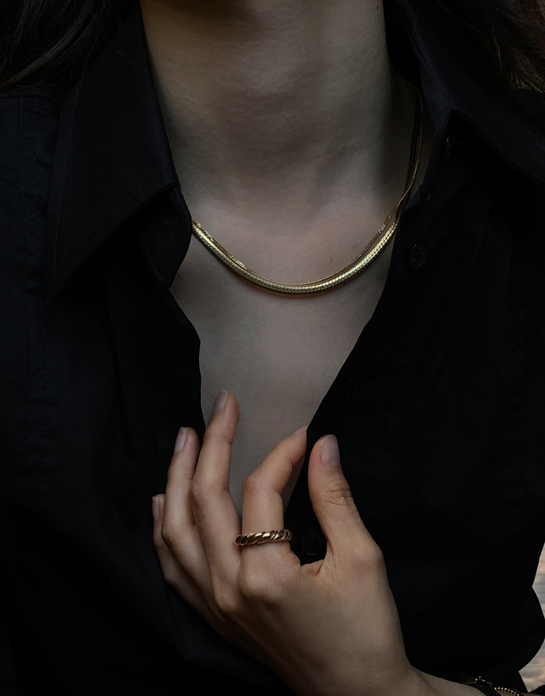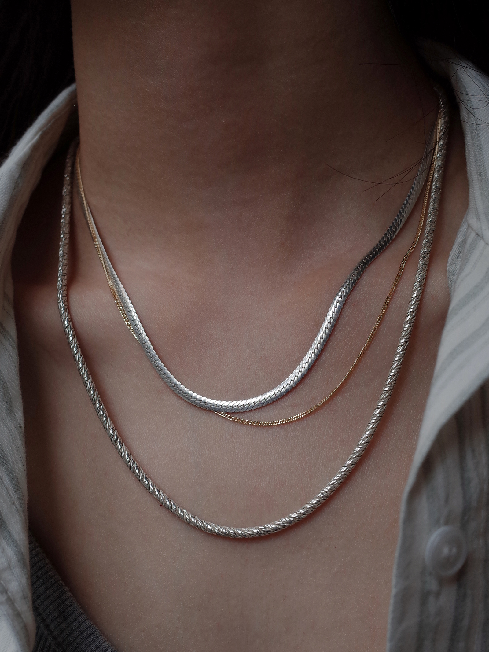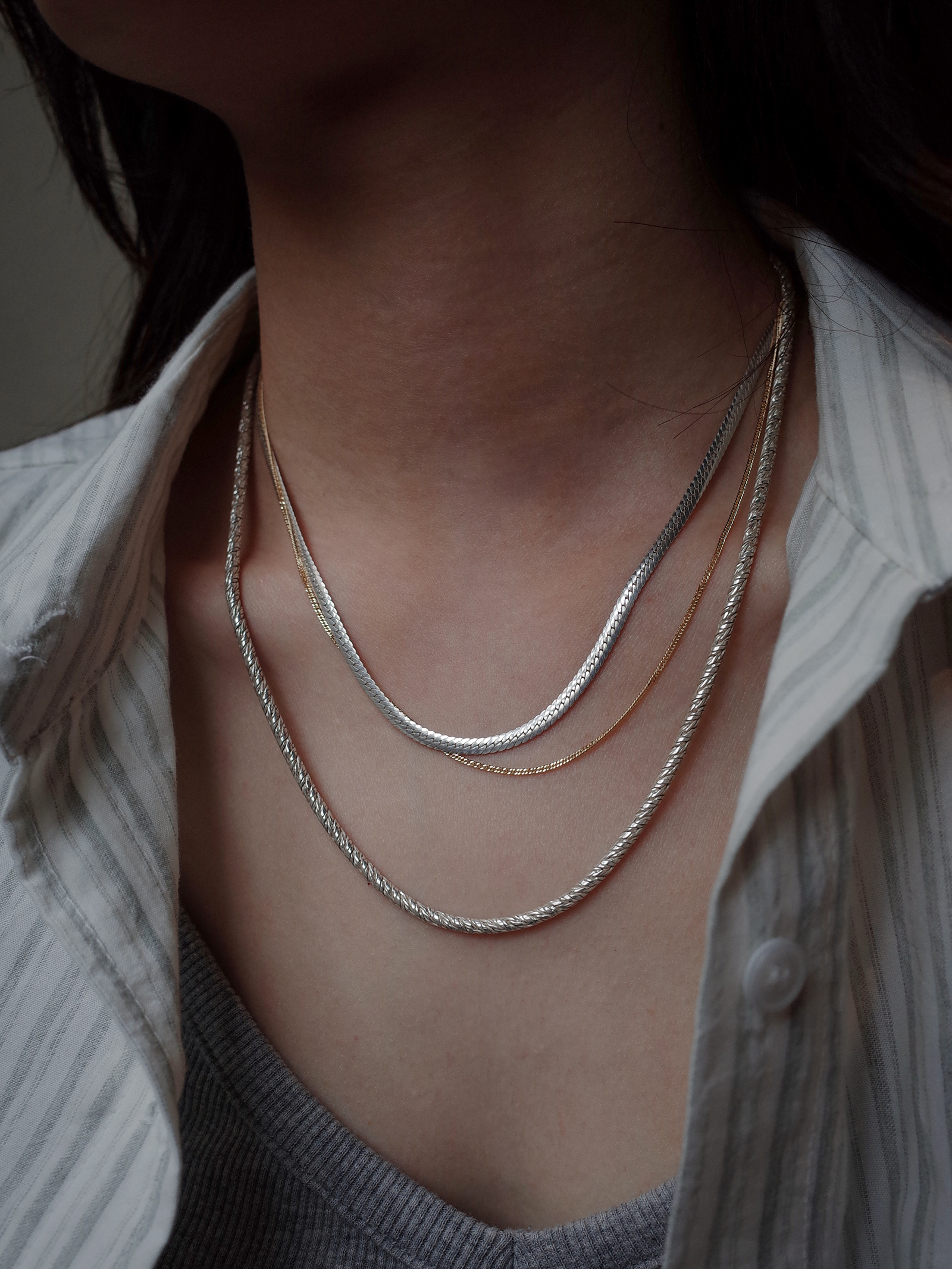 헤링본 무늬만으로 유니크함이 느껴지는 견고하고 단단한 짜임새의 헤링본 네크리스입니다. 두께감이 있으면서 광택감이 우수하여 단독 착용으로도 돋보이는 연출이 가능한 제품입니다.