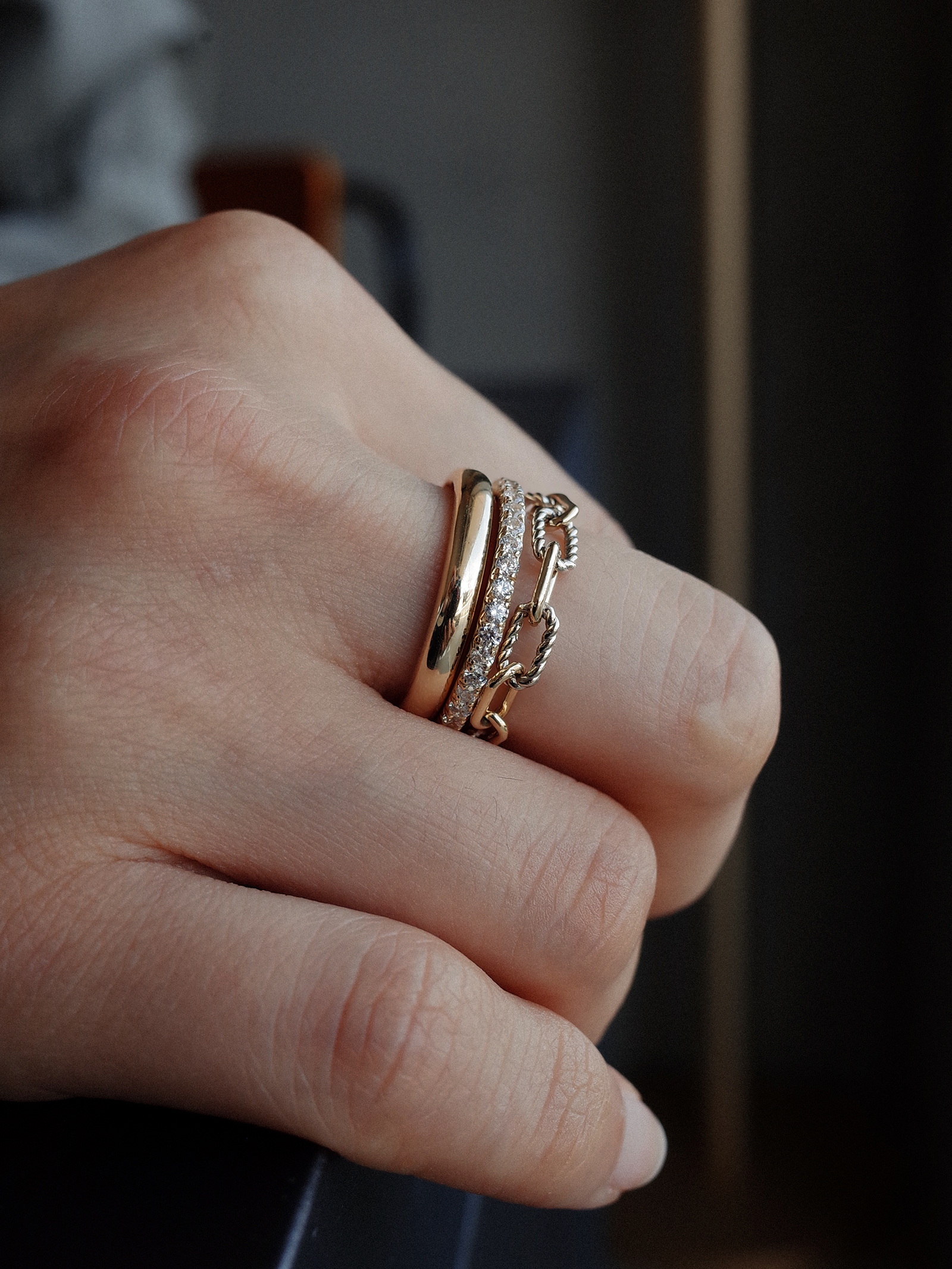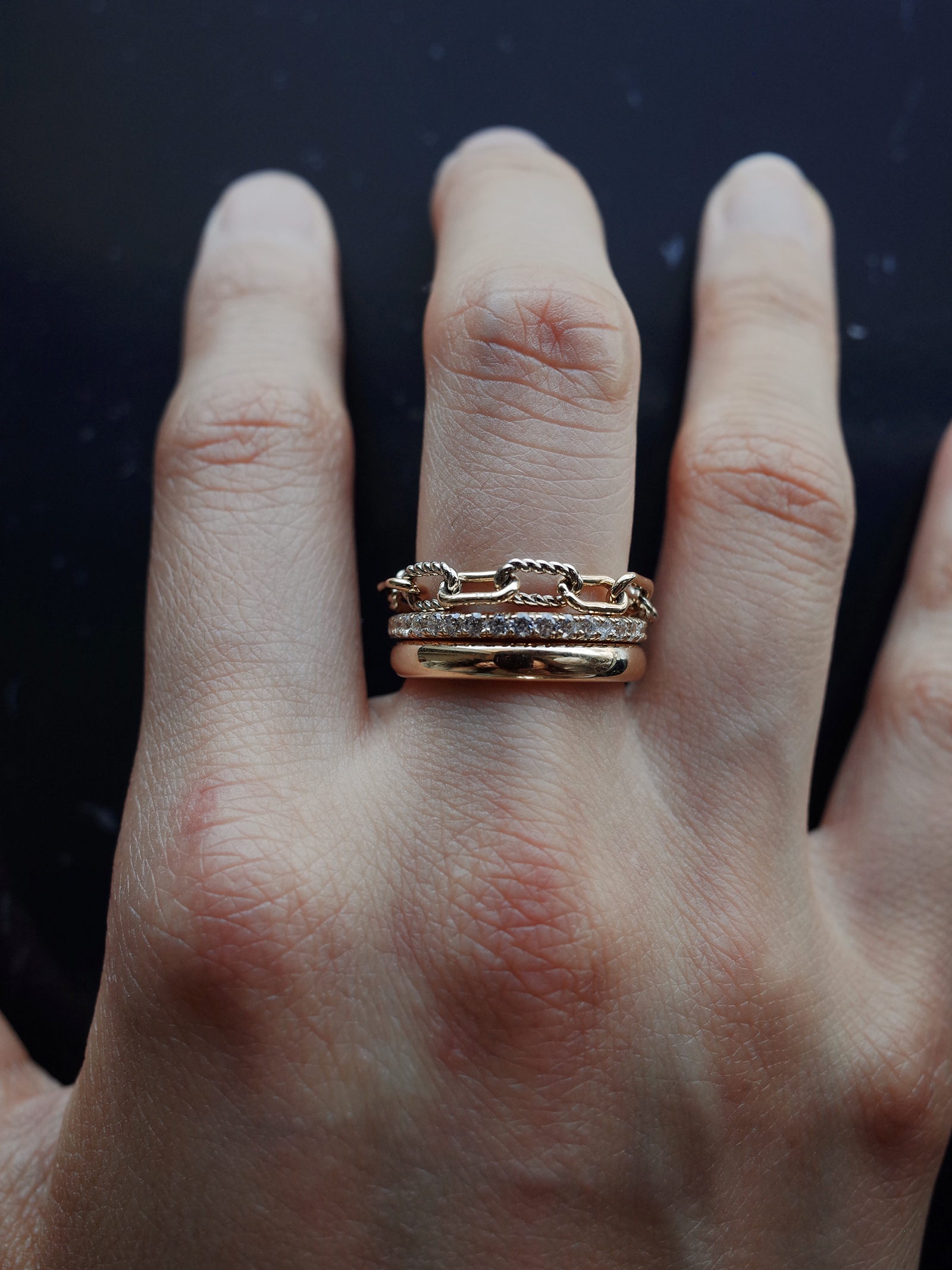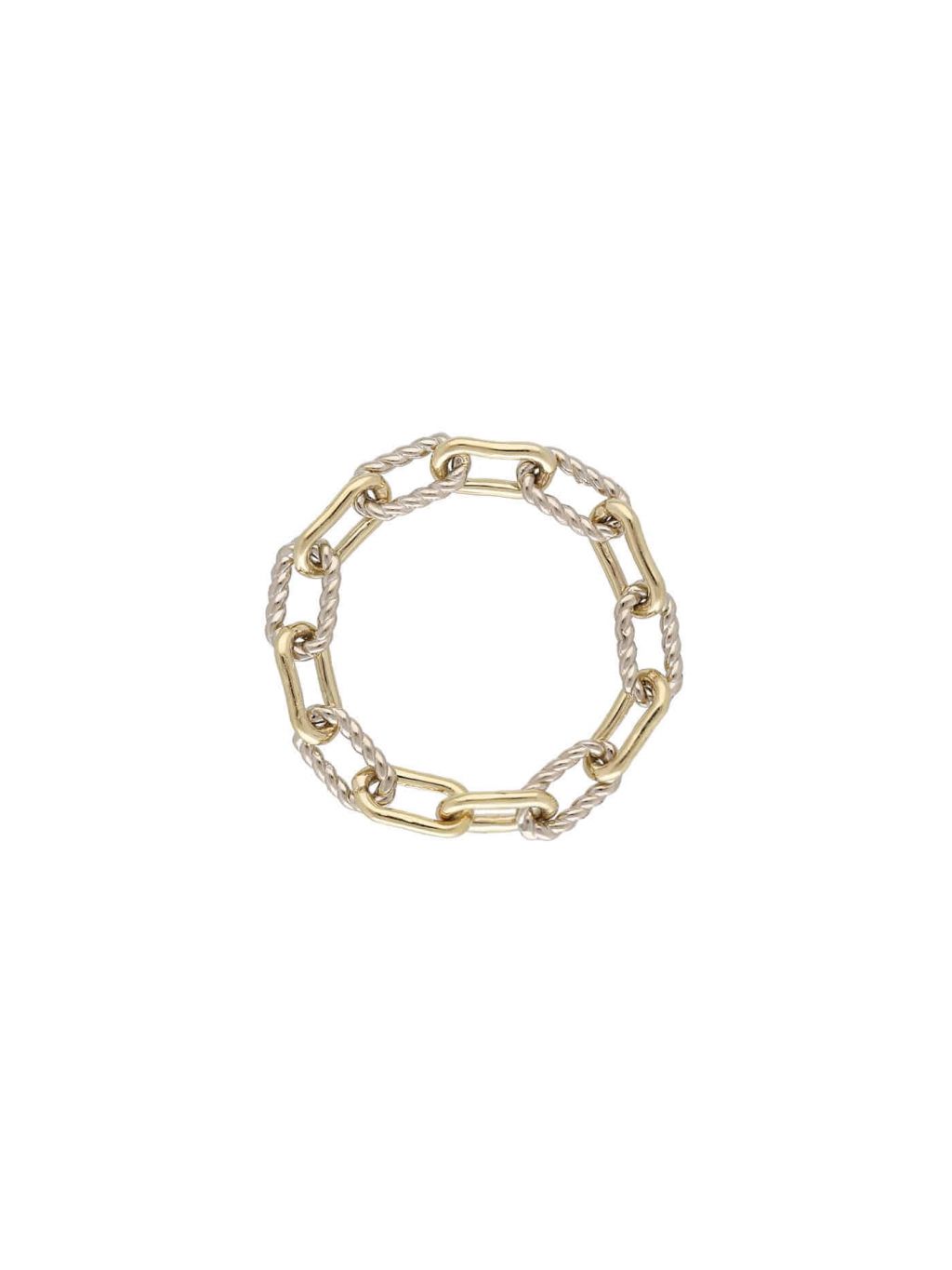 솔리드한 골드 유닛과 꼬인 매듭의 샴페인골드 유닛이 번걸아가며 연결된 매끈한 광택감의 라쏘 체인 링