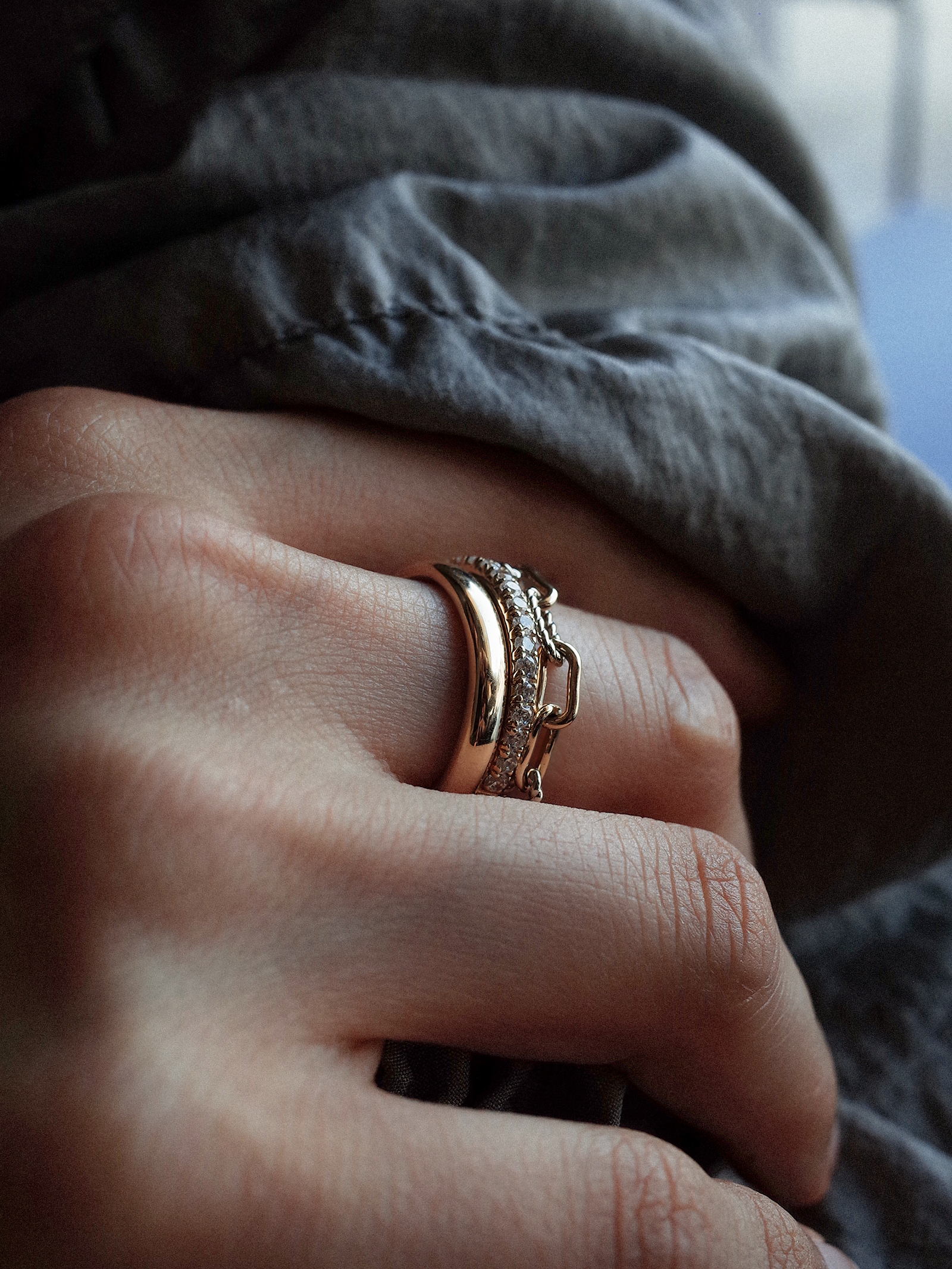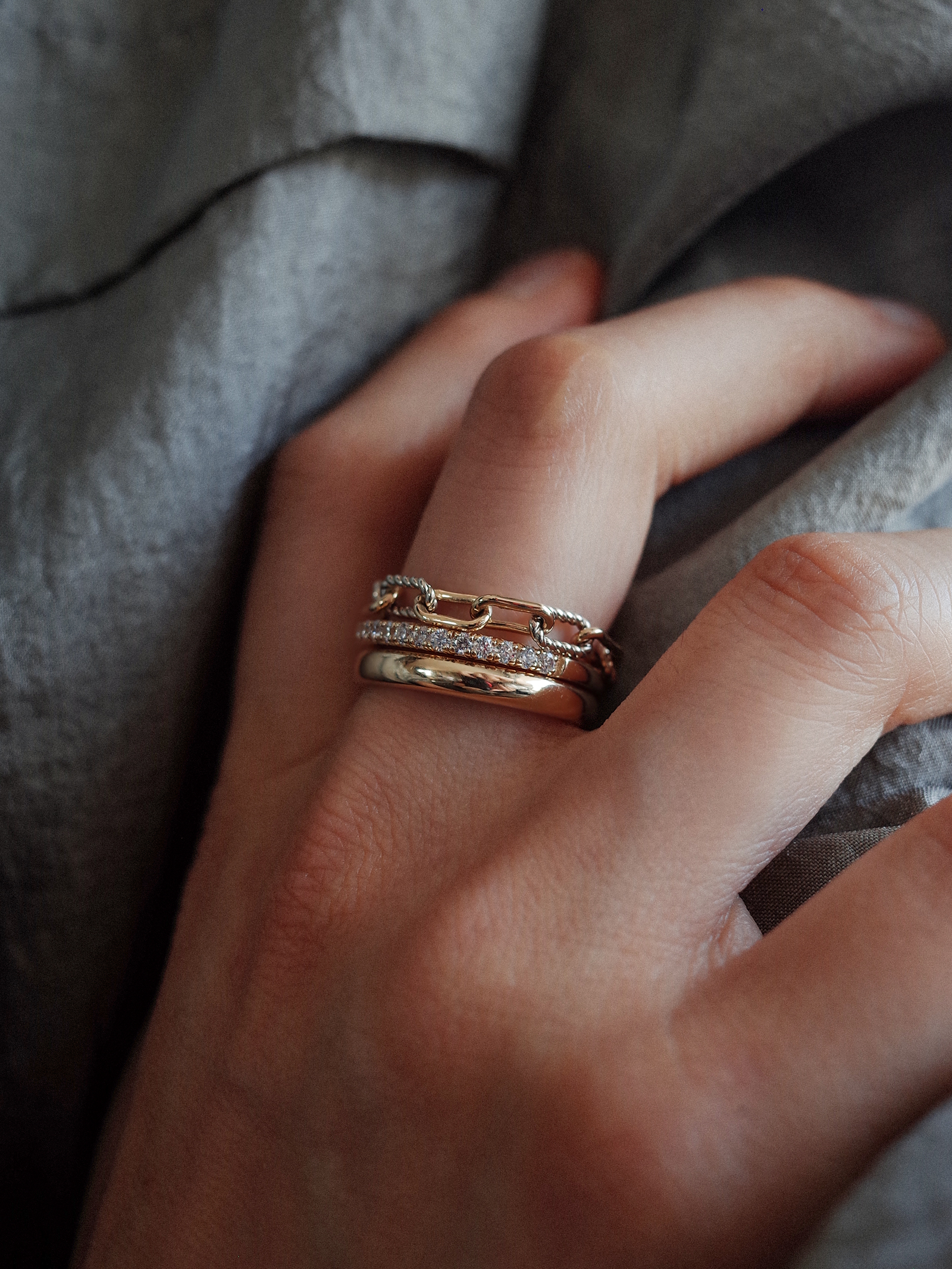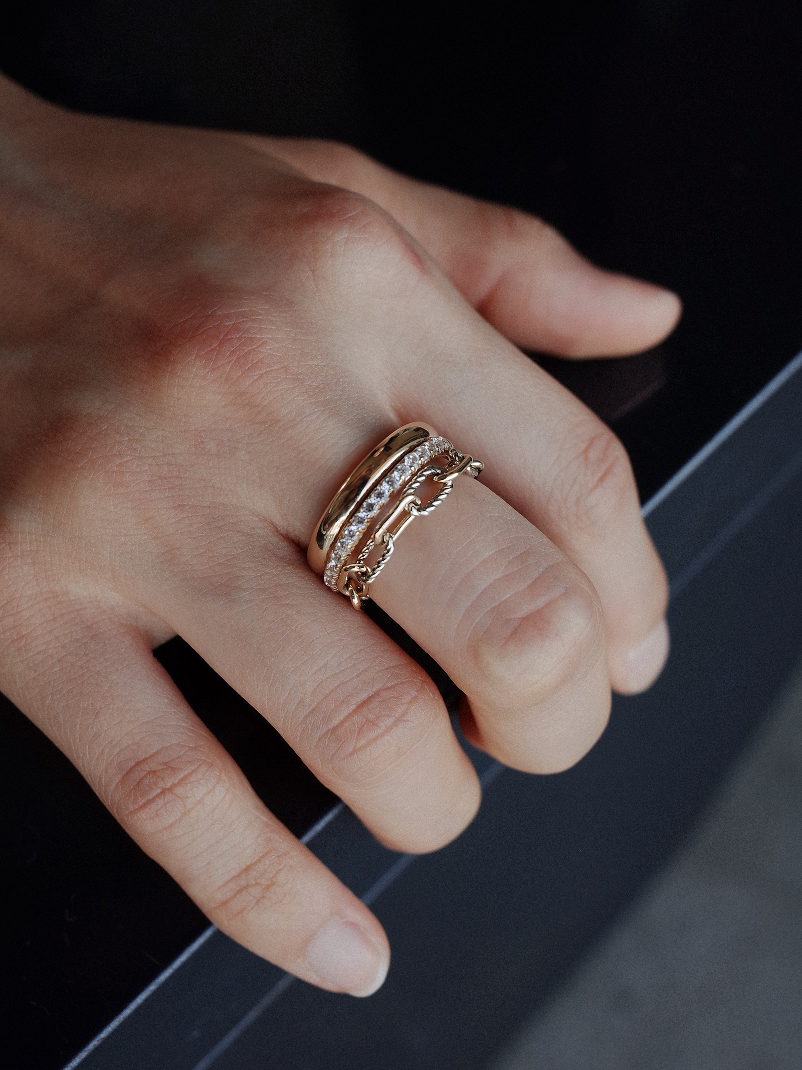 루쏘 체인 링은 서로 다른 유닛 디자인이 반복적으로 연결되어 있는 투톤 체인 링입니다. 일반적인 체인과 다른 까다로운 주물 공정을 거친 제품으로 유닛 하나 하나가 매우 견고하고 튼튼한 것이 특징입니다. 고급스러움과 유니크함이 동시에 느껴지며 단독 착용만으로도 돋보이는 연출이 가능한 제품입니다.