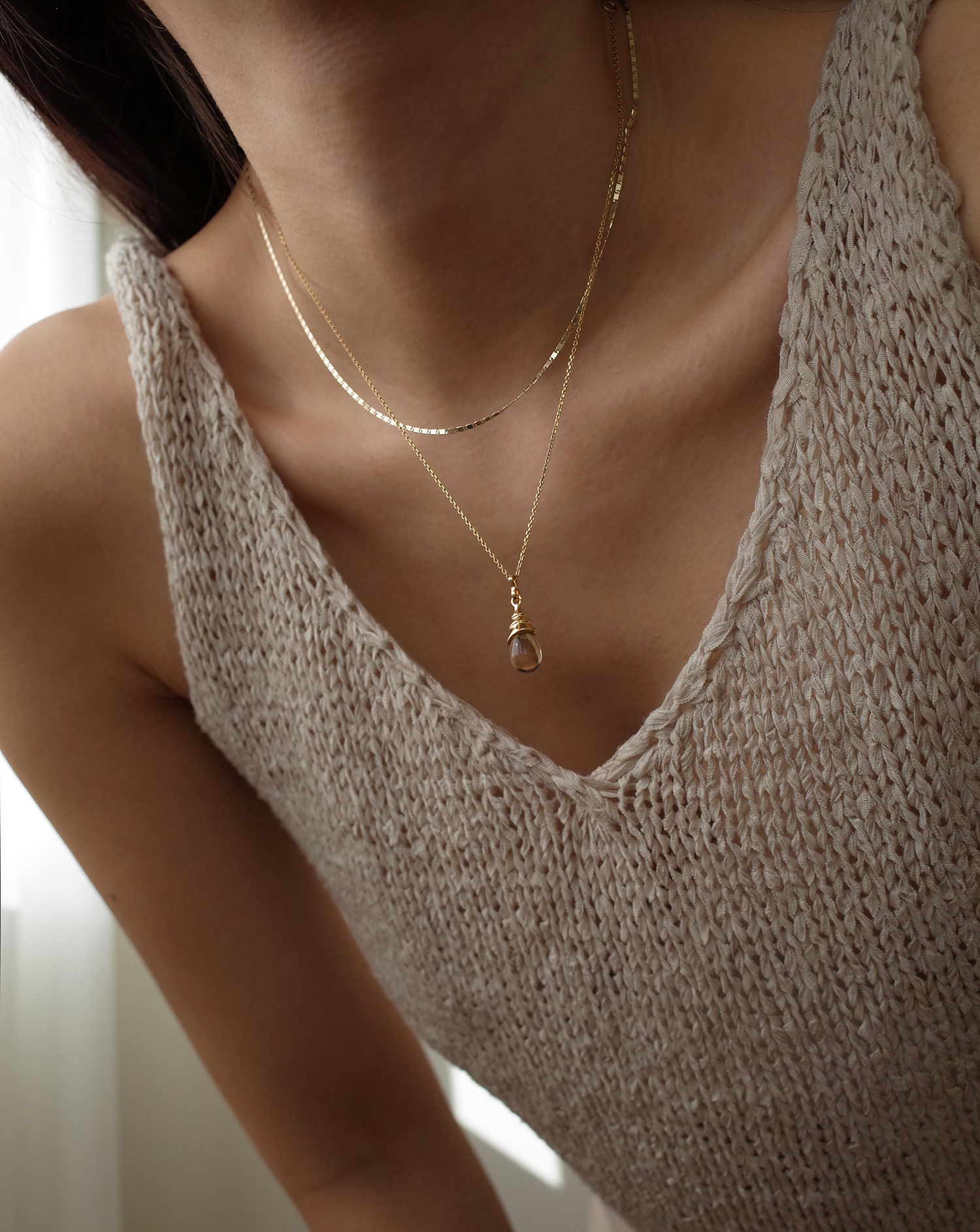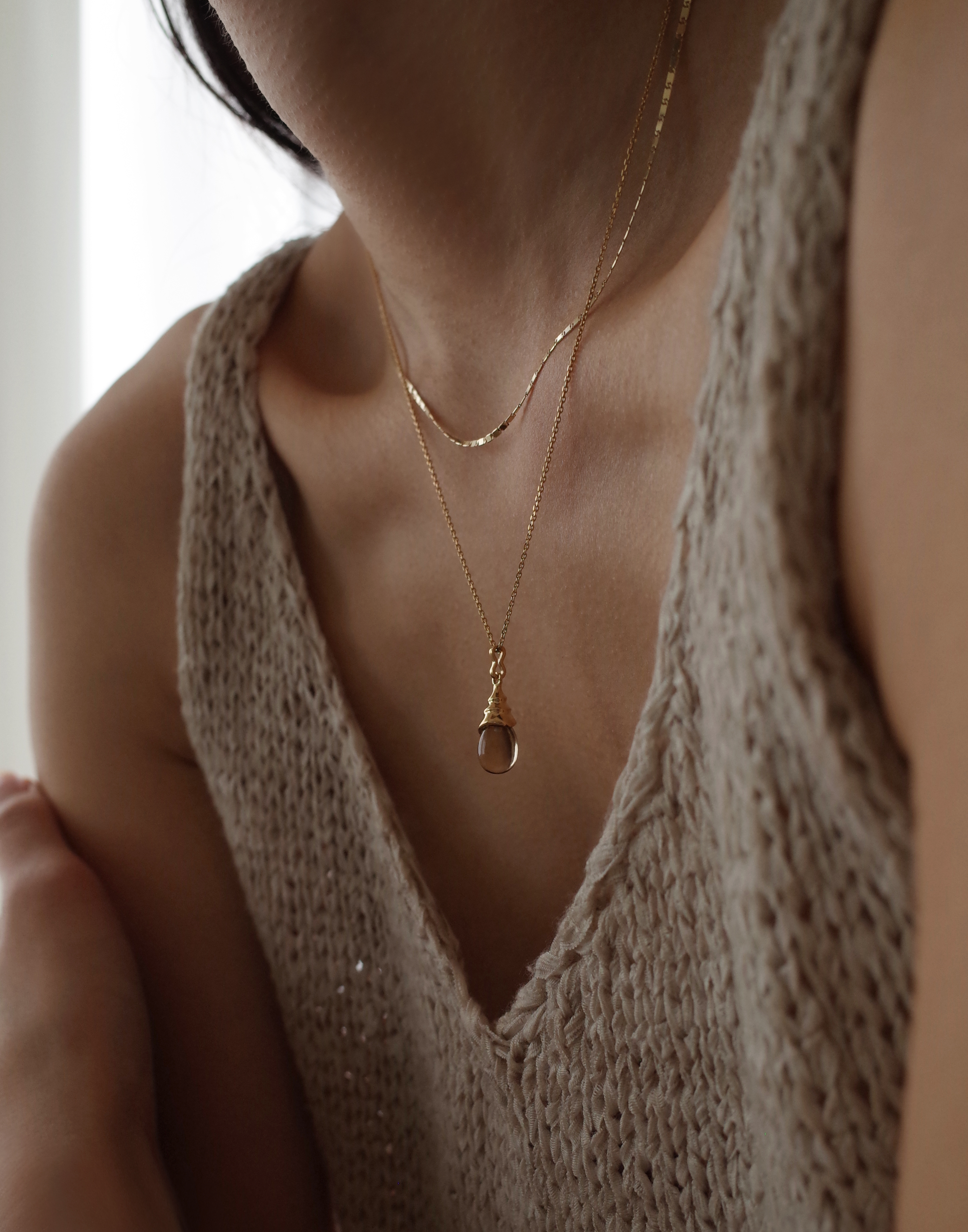 오랜 세월의 흔적이 담긴 팔레르모의 건축 양식에서 영감을 받아 제작한 팬던트 네크리스입니다. 전체적인 흐름이 자연스레 연결되는 곡선 쉐입 디자인으로 체인이 통과되는 유닛에 포인트를 주어 옆면에서도 아름다운 외형을 자랑합니다. 클리어한 백수정과 연기가 자욱한 듯 반투명한 연수정 두 가지 원석으로 준비되었습니다.