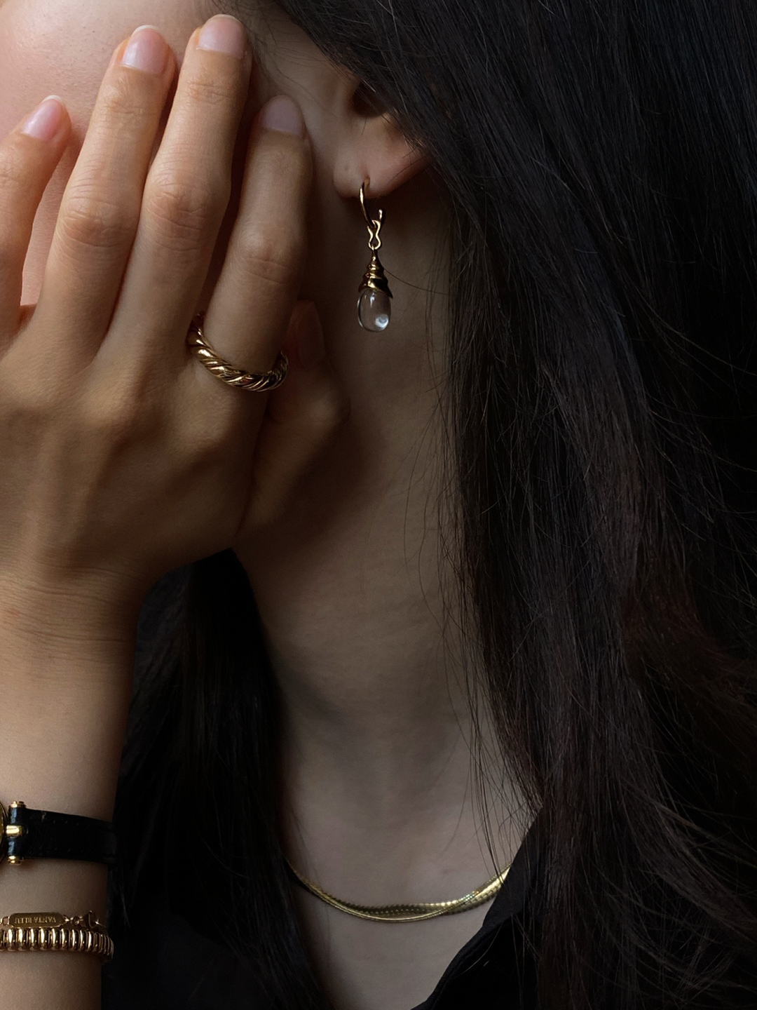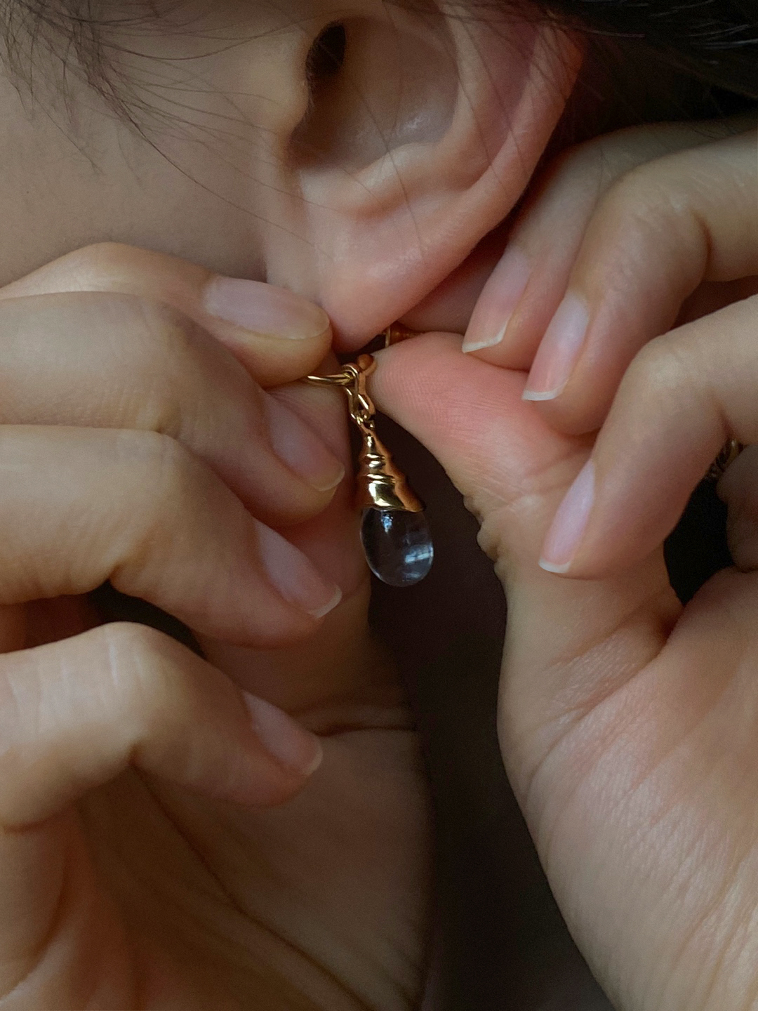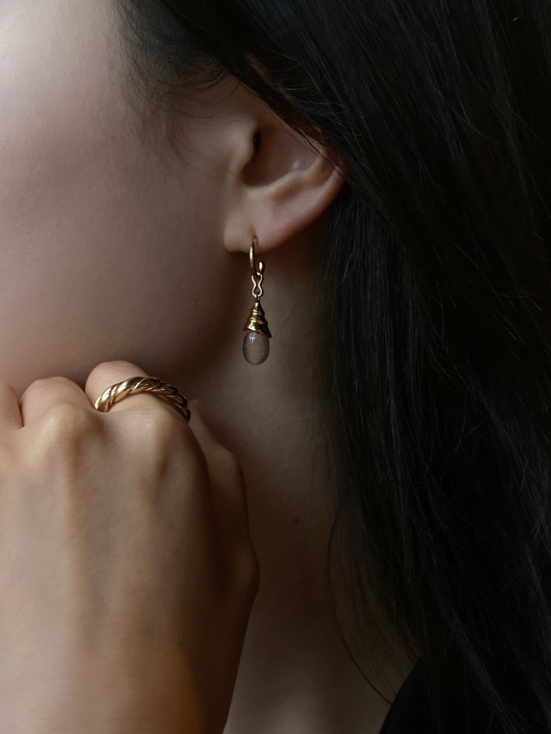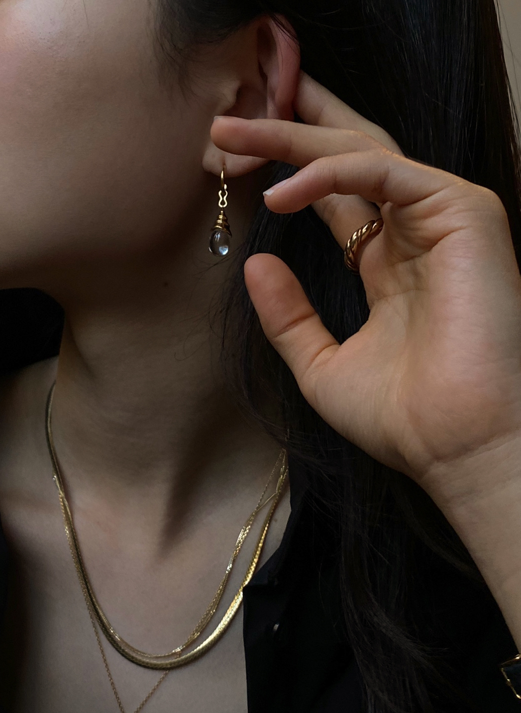 오랜 세월의 흔적이 담긴 팔레르모의 건축 양식에서 영감을 받아 제작한 스터드 방식의 드롭 이어링입니다. 전체적인 흐름이 자연스레 연결되는 곡선 쉐입 디자인으로 후프와 참 사이를 연결해주는 유닛에 포인트를 주어 정면에서 더욱 아름다운 외형을 자랑합니다. 클리어한 백수정과 연기가 자욱한 듯 반투명한 연수정 두 가지 원석으로 준비되었습니다.