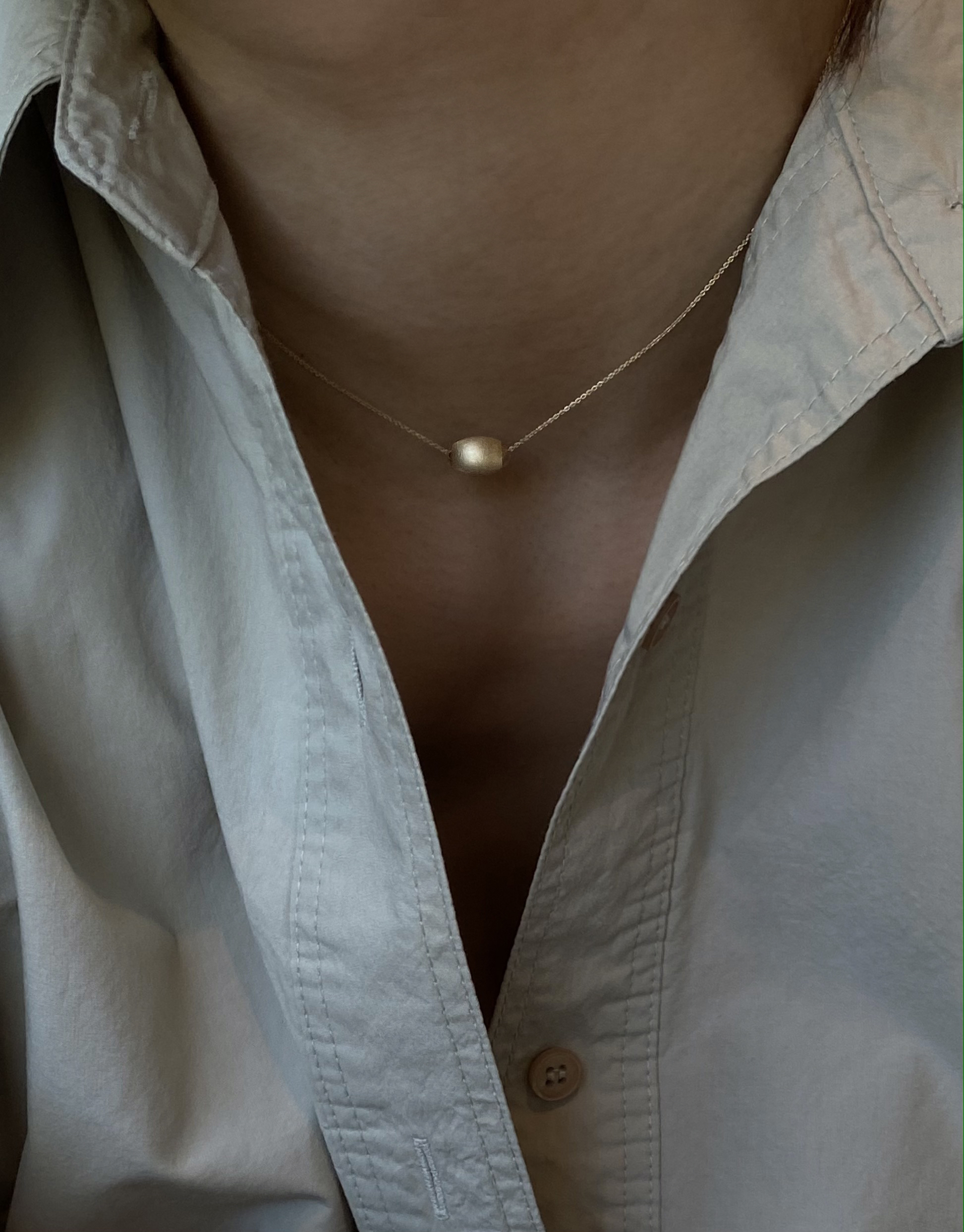 솔레네는 무광 표면에 옅은 스트라이프 패턴이 섬세하게 새겨진 이탈리아 수입 볼 네크리스입니다. 쇄골 중심에 타원 볼이 떠있는 듯 시선이 집중되도록 무광 체인에 볼이 통과되는 형태로 제작하였으며, 단조로운 외형에 쉬머한 텍스쳐로 시크하면서도 페미닌한 분위기를 자아내는 제품입니다.