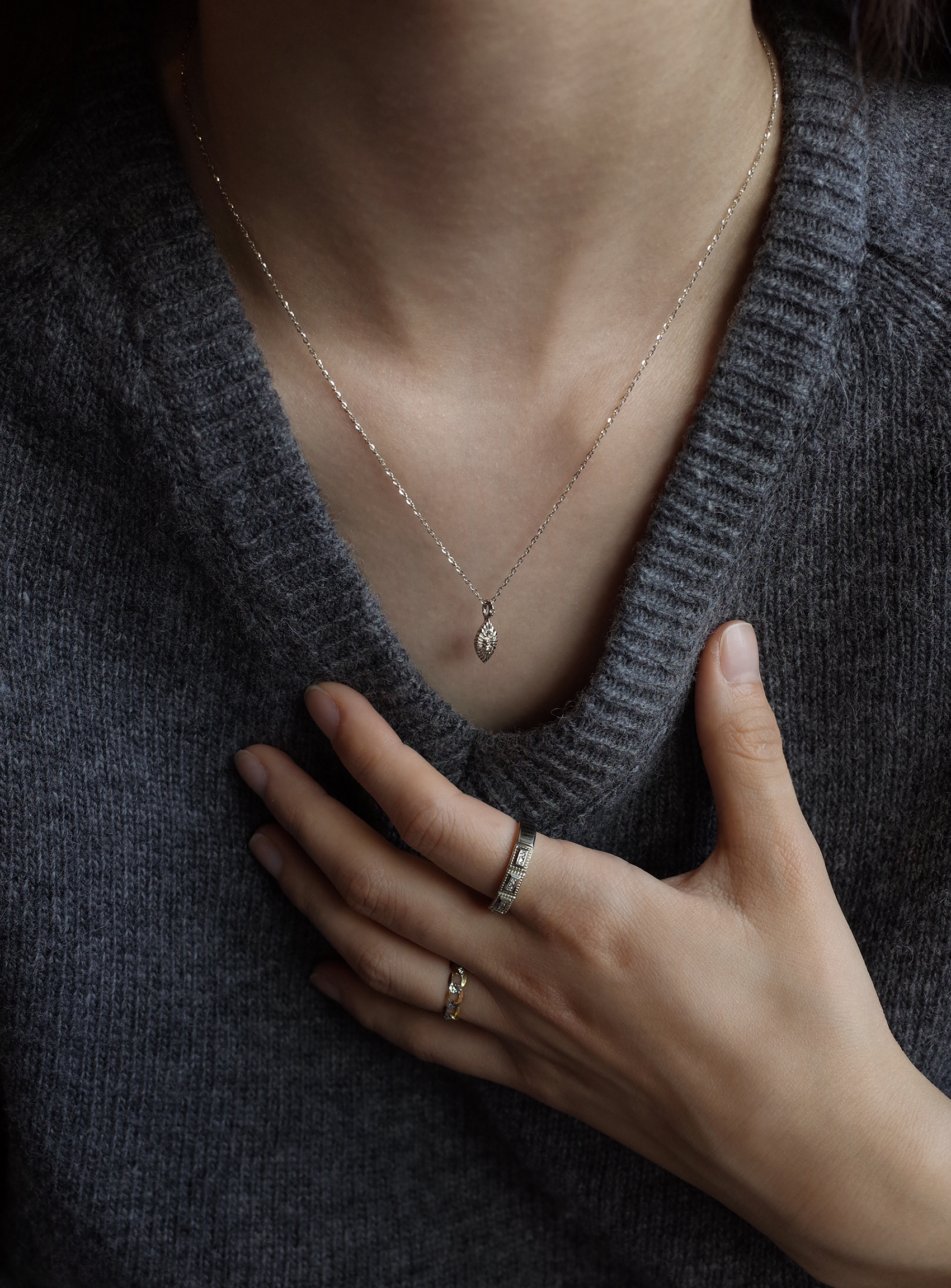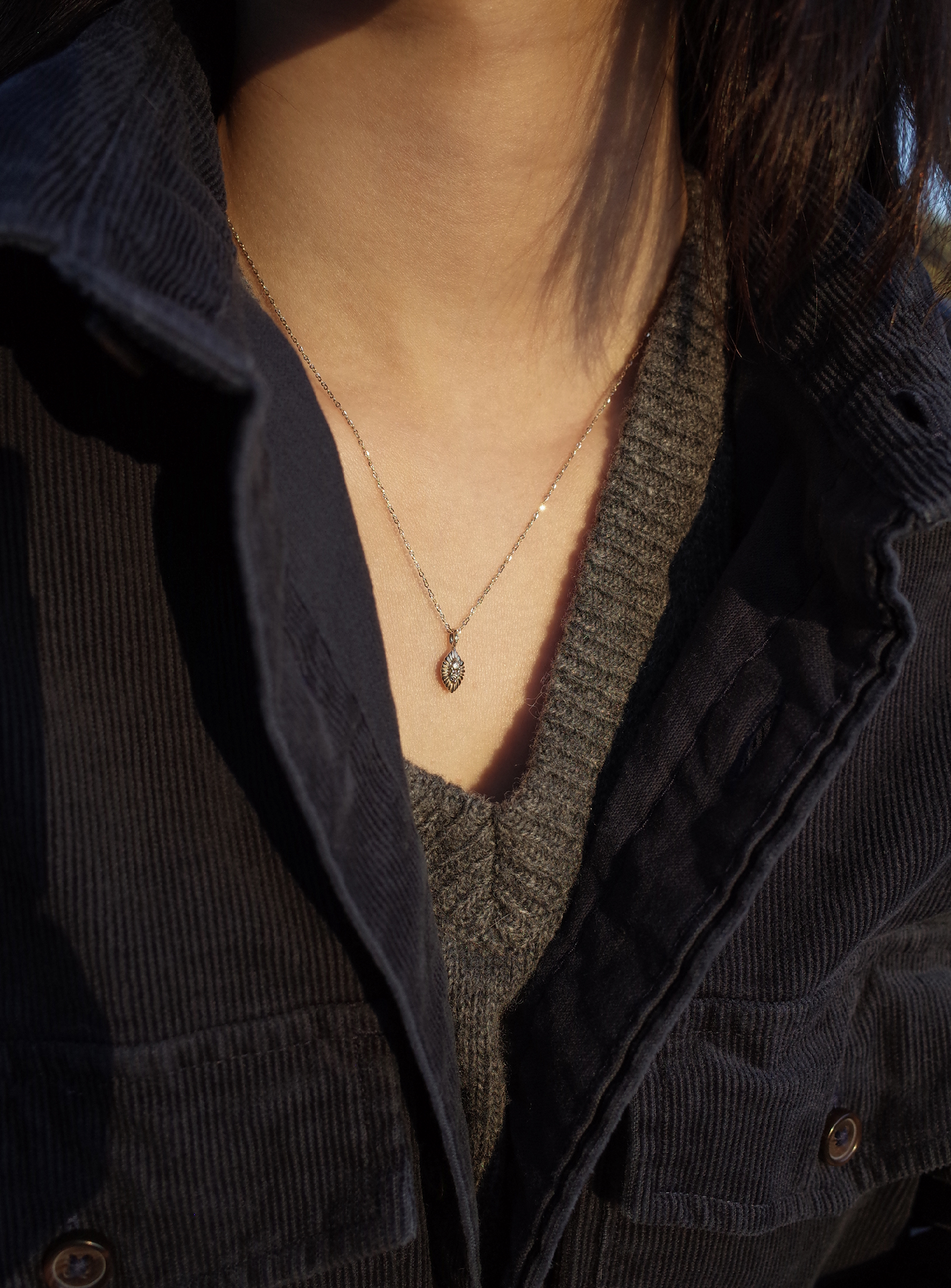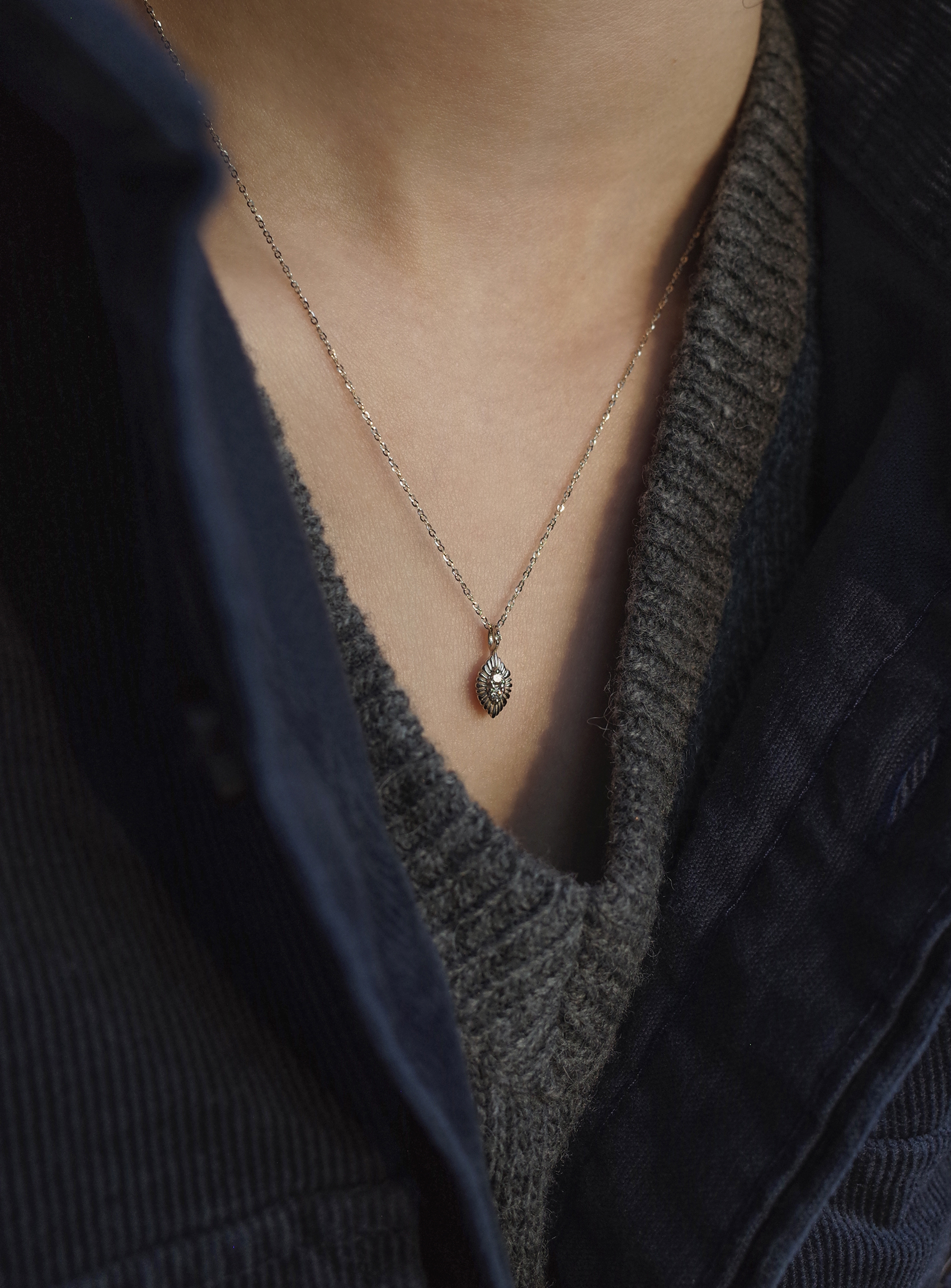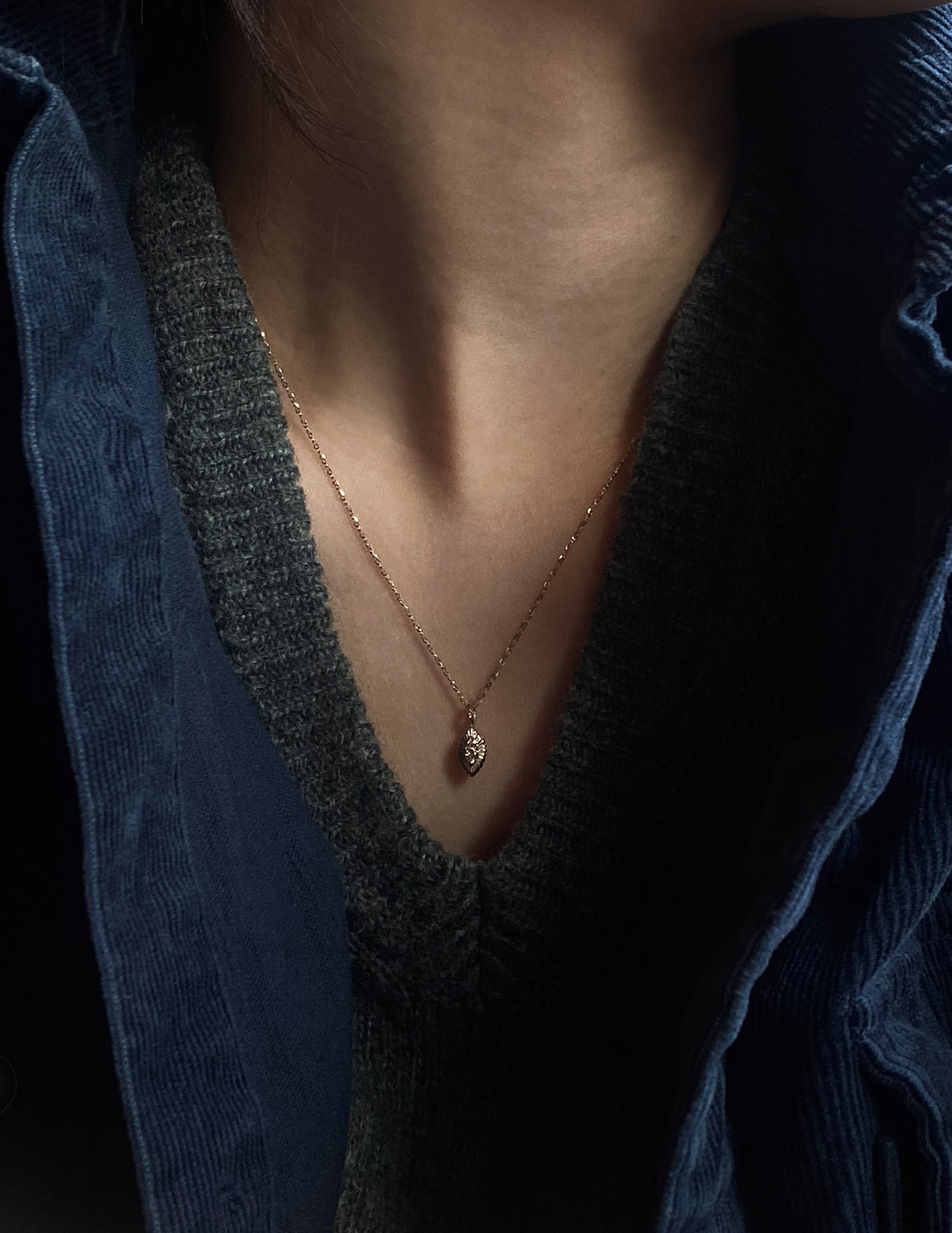 중심부와 고리 중앙에 샴페인 다이아가 세팅된 잎사귀 형상 팬던트와 글리터링한 체인 조화가 아름다운 네크리스입니다. 팬던트 뒷면은 볼륨감있는 곡선 형태로 다양한 방향에서 여성스러운 라인이 돋보이는 제품입니다. 빈티지한 분위기와 잘 어울리는 따뜻한 샴페인 골드 컬러로 제작되었습니다.
