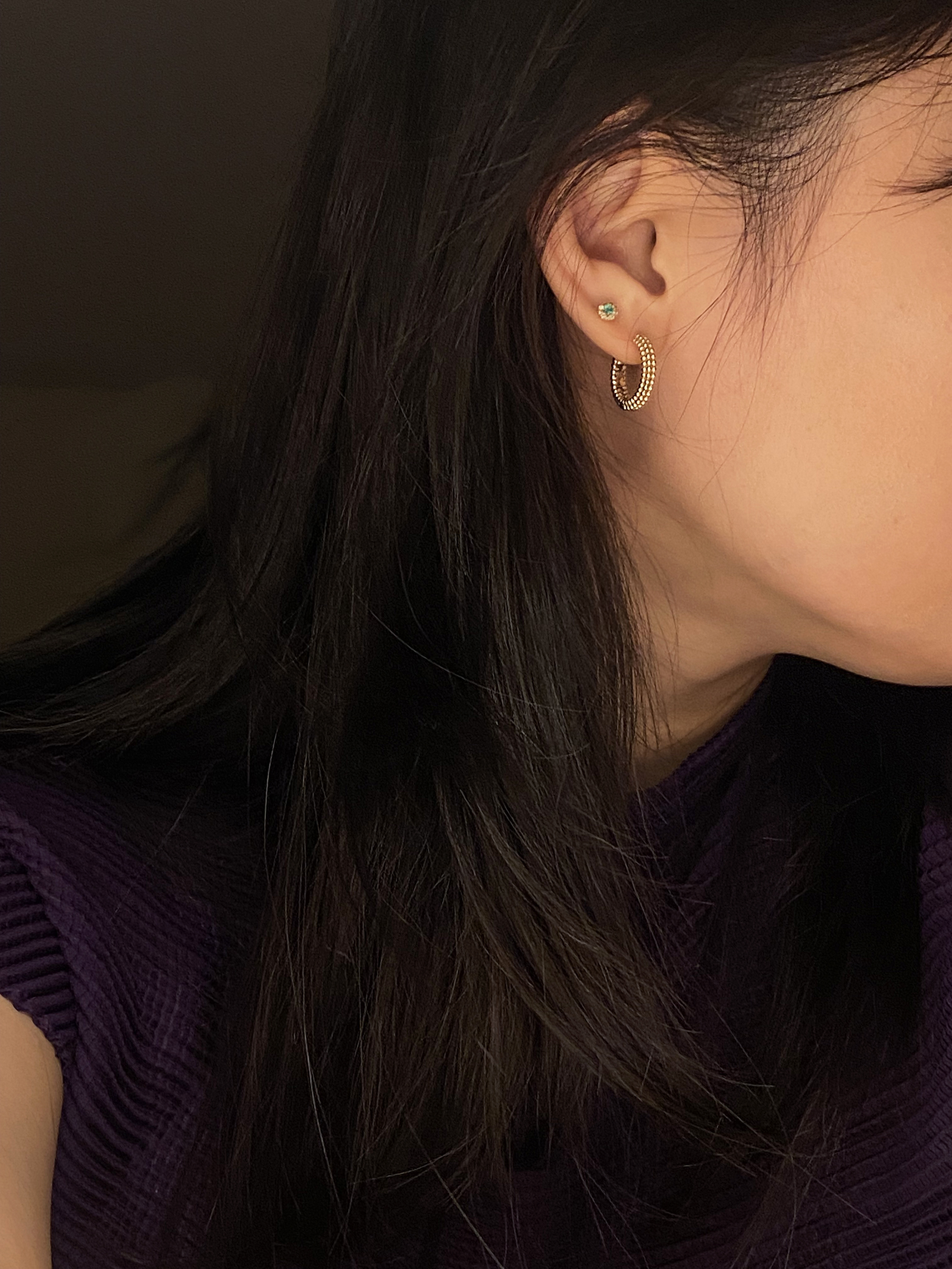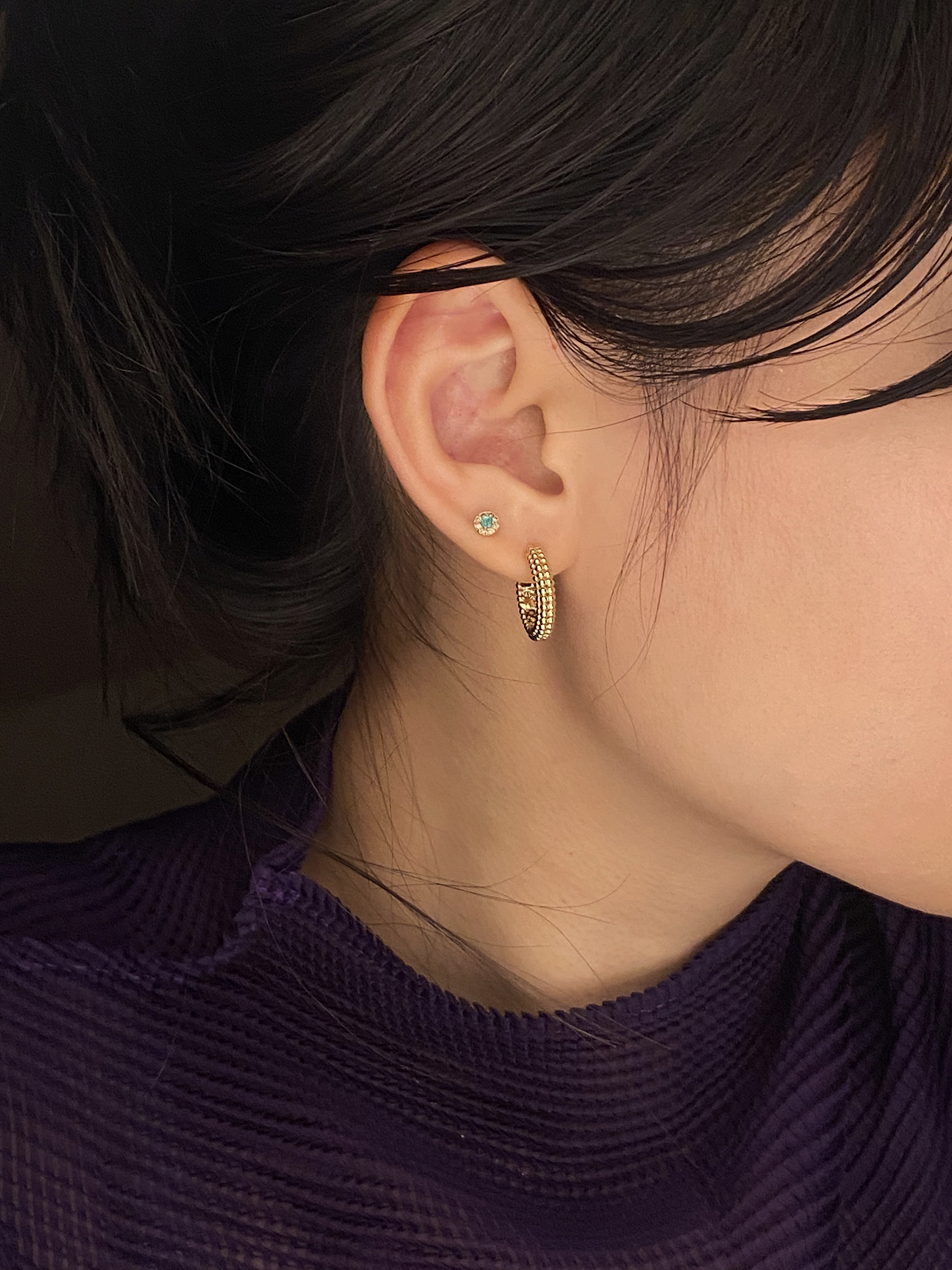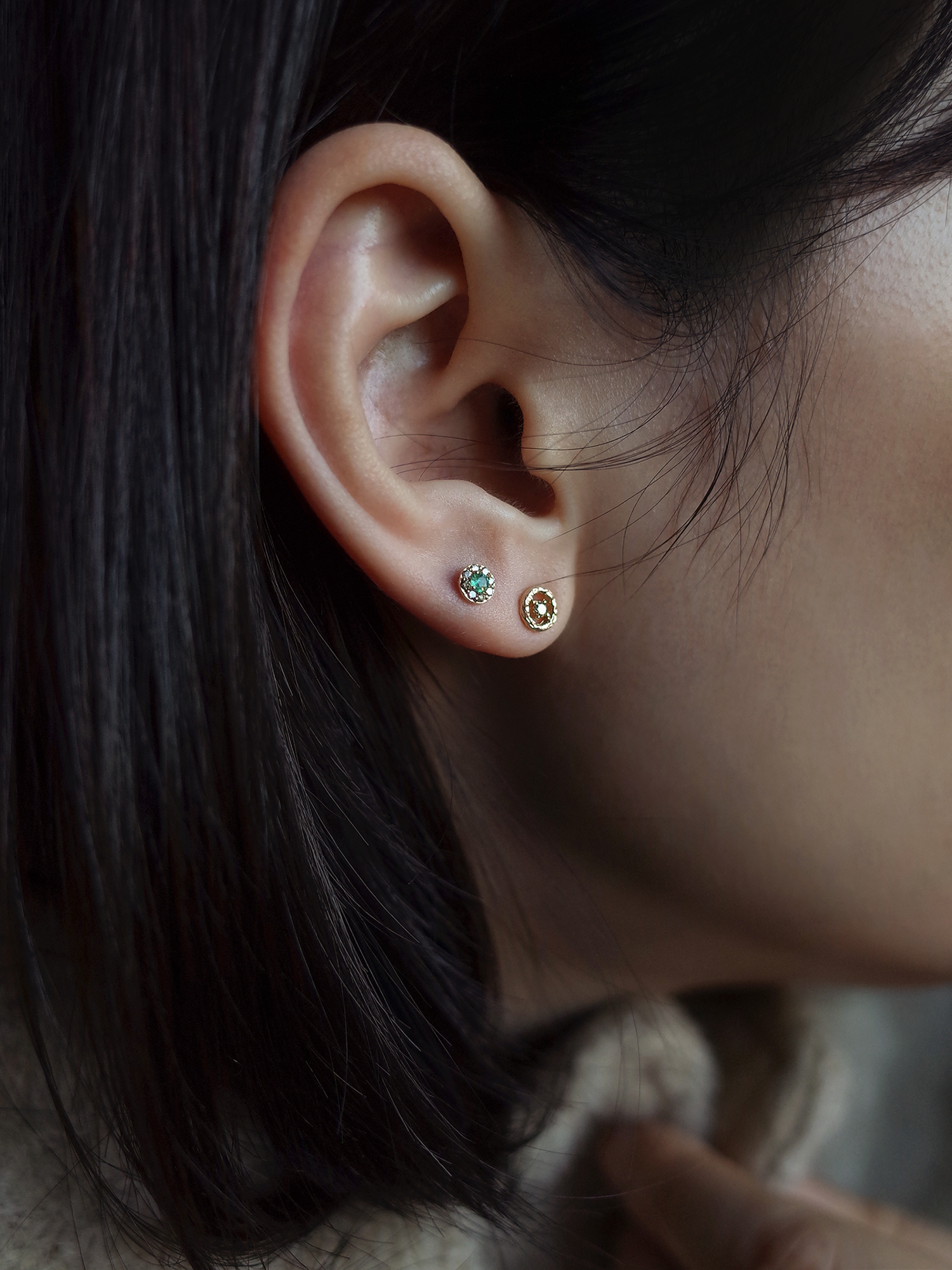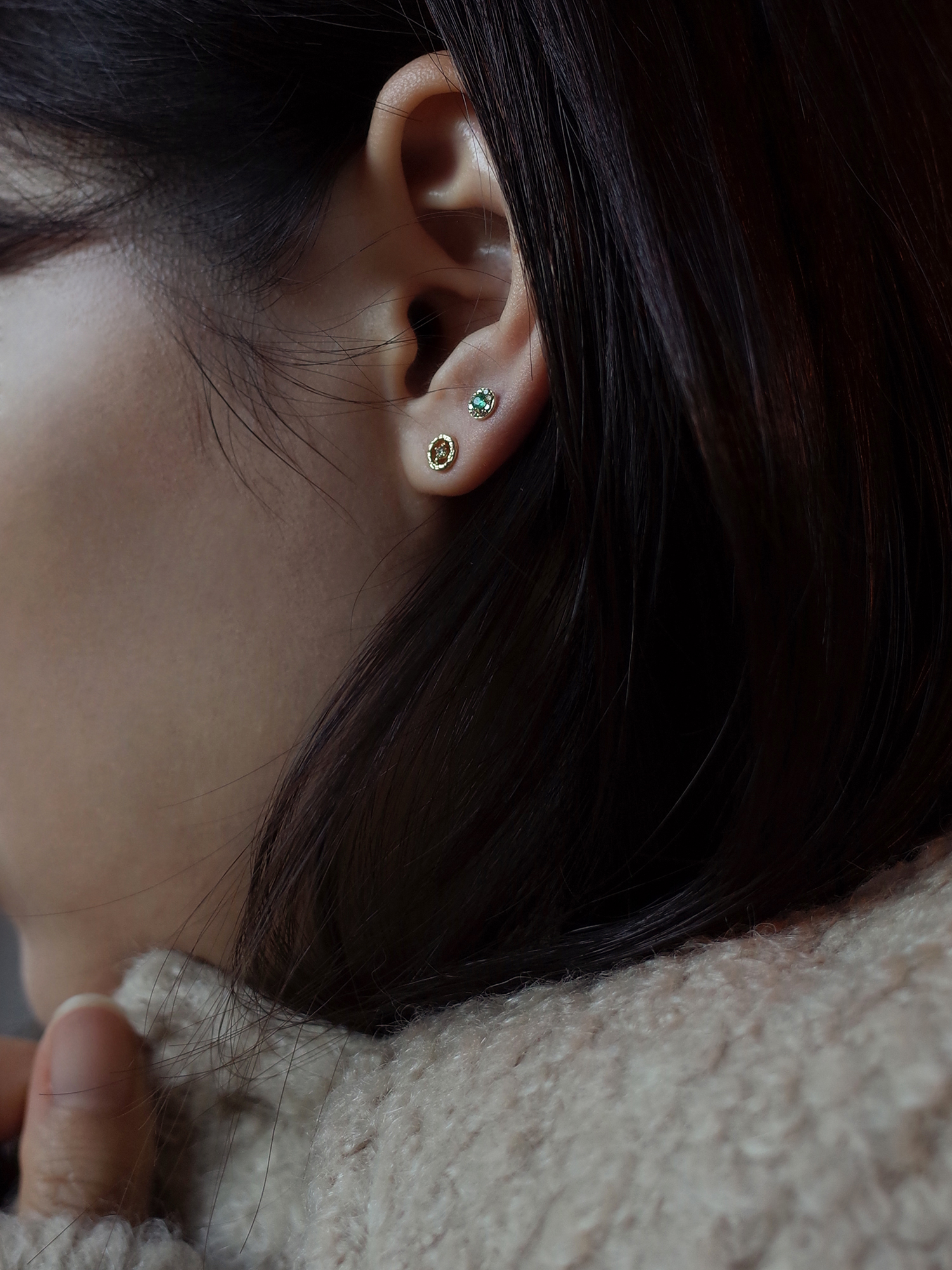 중앙에 원색의 에메랄드와 은은한 샴페인 다이아가 둘러쌓인 형태로 세팅된 아담한 사이즈의 피어싱입니다. 미세하게 아로진 형태로 제작하여 착용 시 봉긋하게 올라와 더욱 매력적으로 연출됩니다.