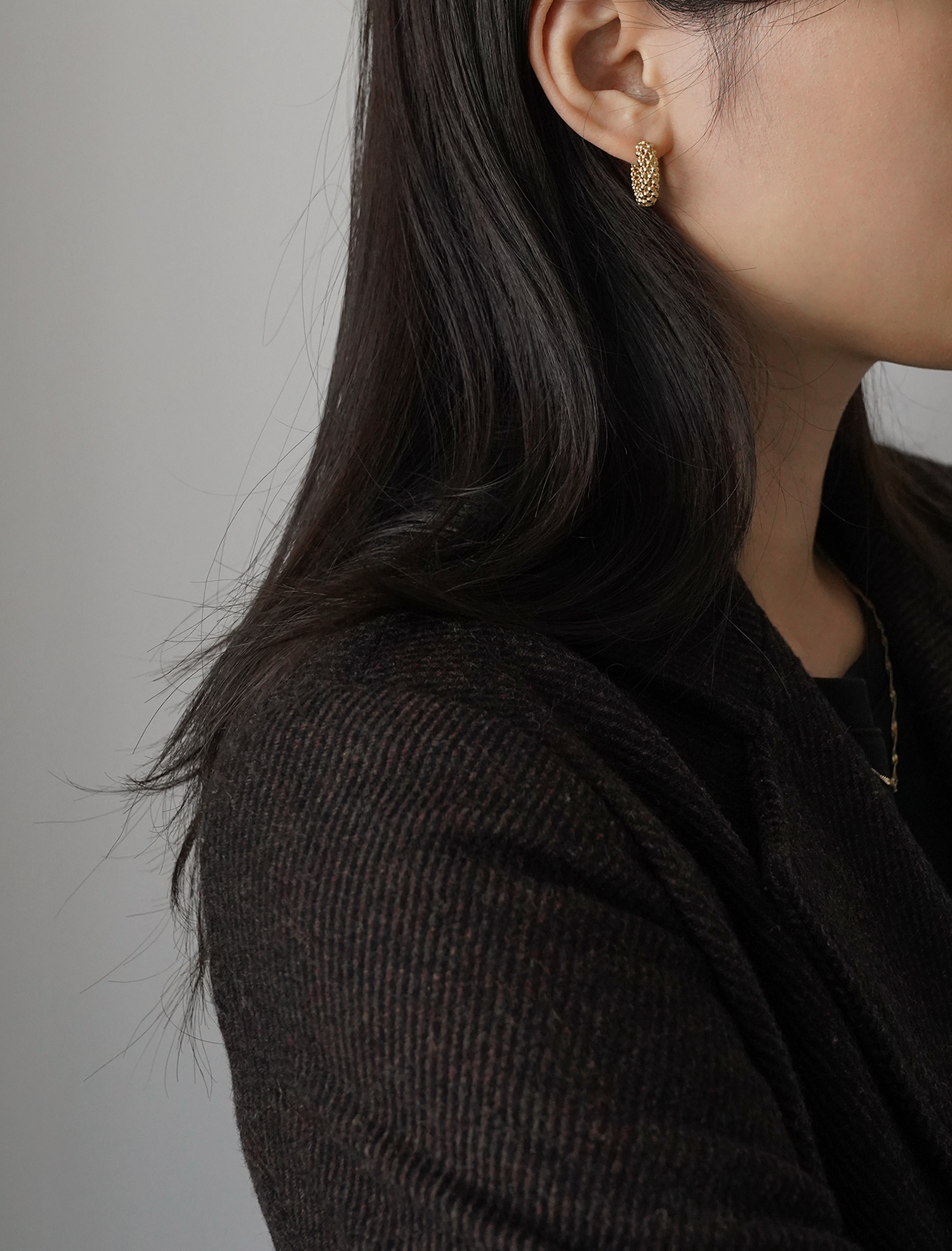 입체적인 도트 무늬가 격자로 배치되어 패턴처럼 반복되는 원터치 방식의 후프 이어링입니다. 볼드 이어링의 무게감으로 인한 피로감과 귀 늘어짐을 방지하기 위해 외형은 볼드한 형태를 유지하면서 격자 사이가 뚫린 형태로 제작되어 존재감있는 연출이 가능합니다.
