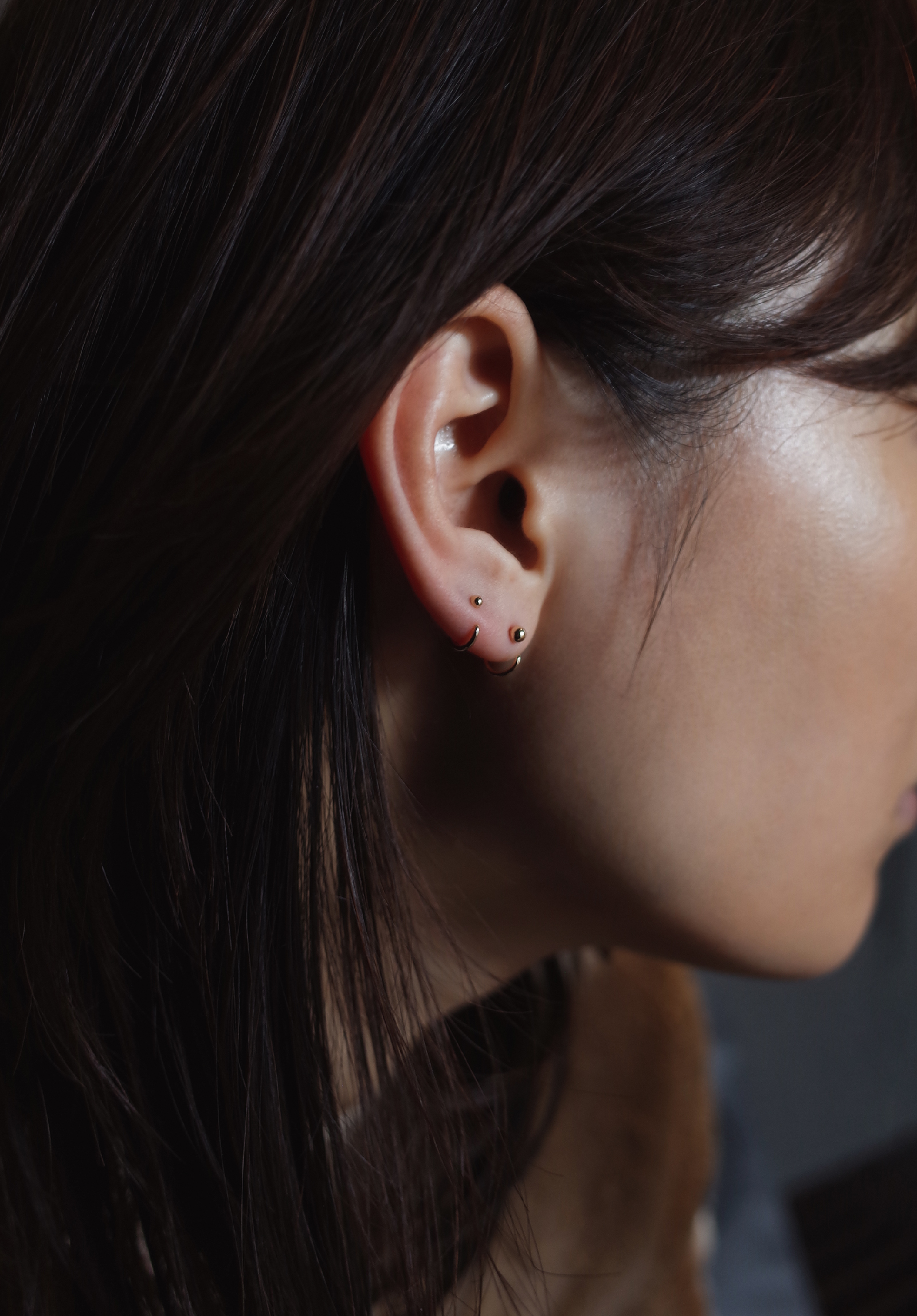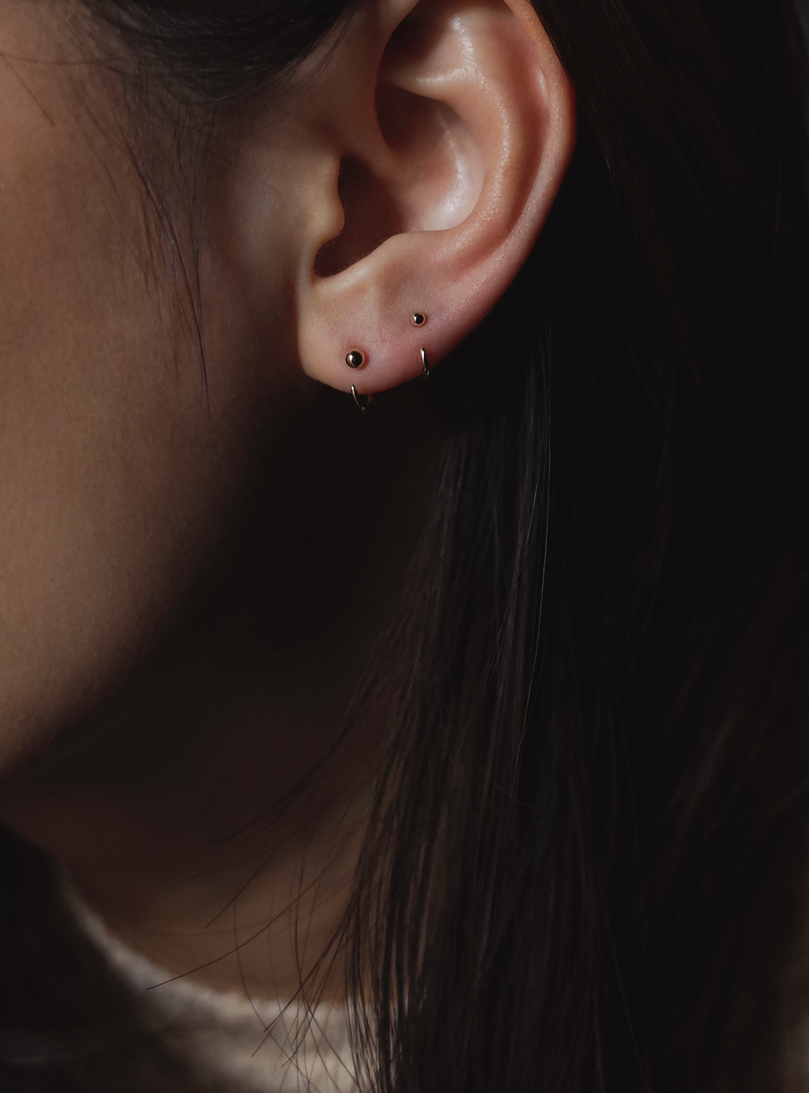 * 별도의 마감없이 곡선의 갈고리 바를 부드럽게 돌린 후 귓볼에 맞게 살짝 힘을 주어 고정하는 방식입니다. 일자 침은 평균 길이로 흔들림없이 핏하게 귓볼을 감싸며 안정감있게 안착됩니다.