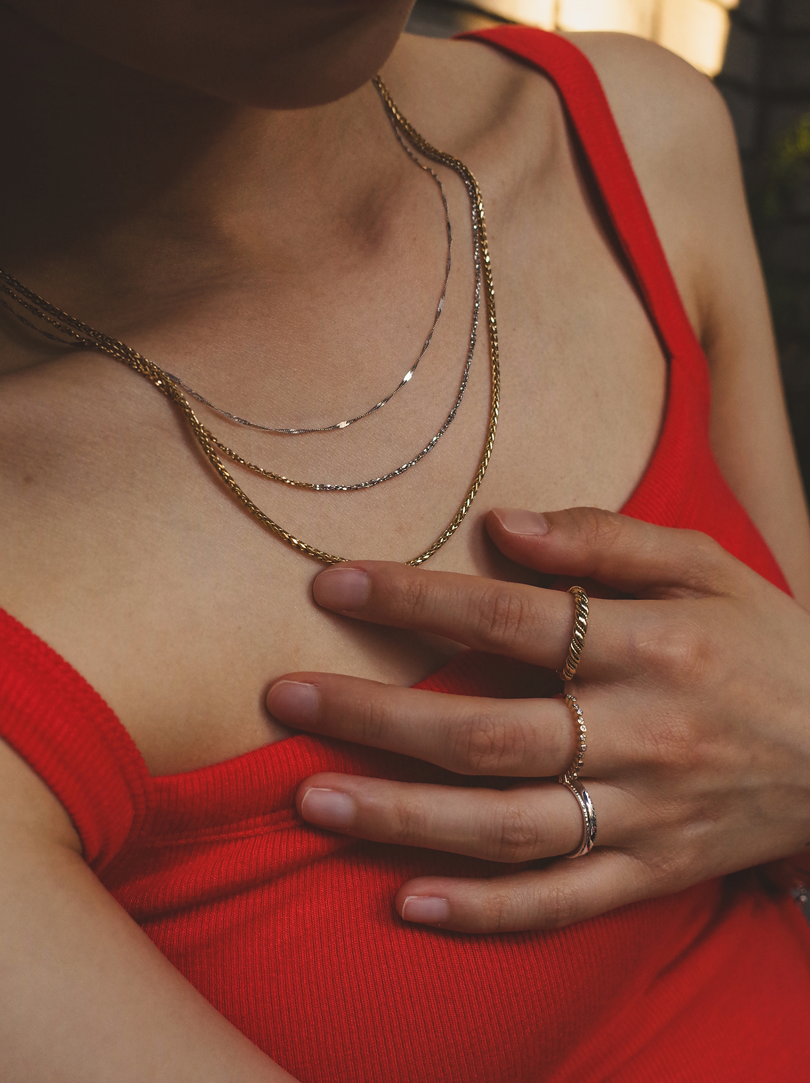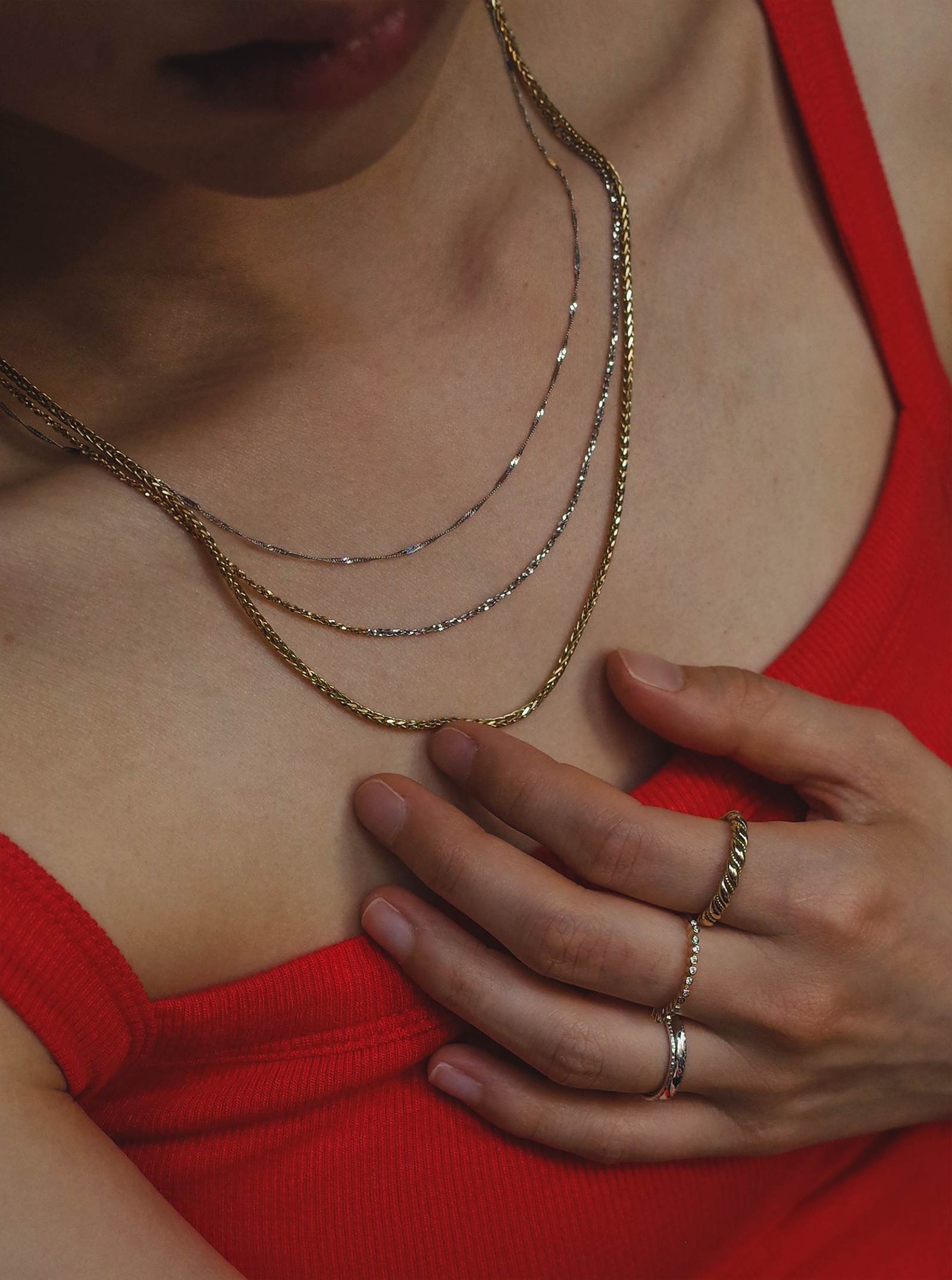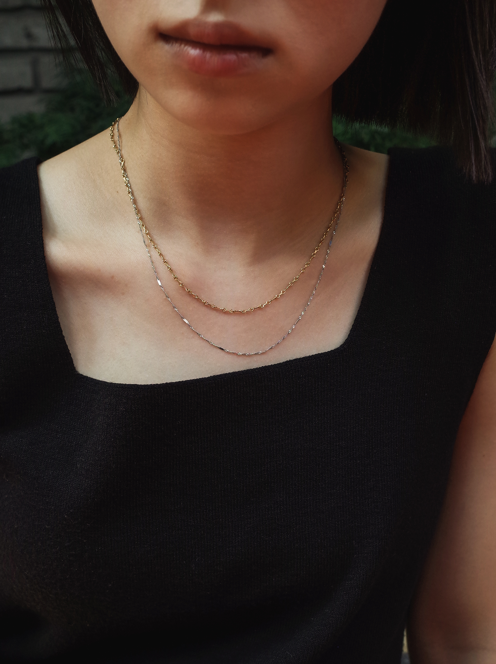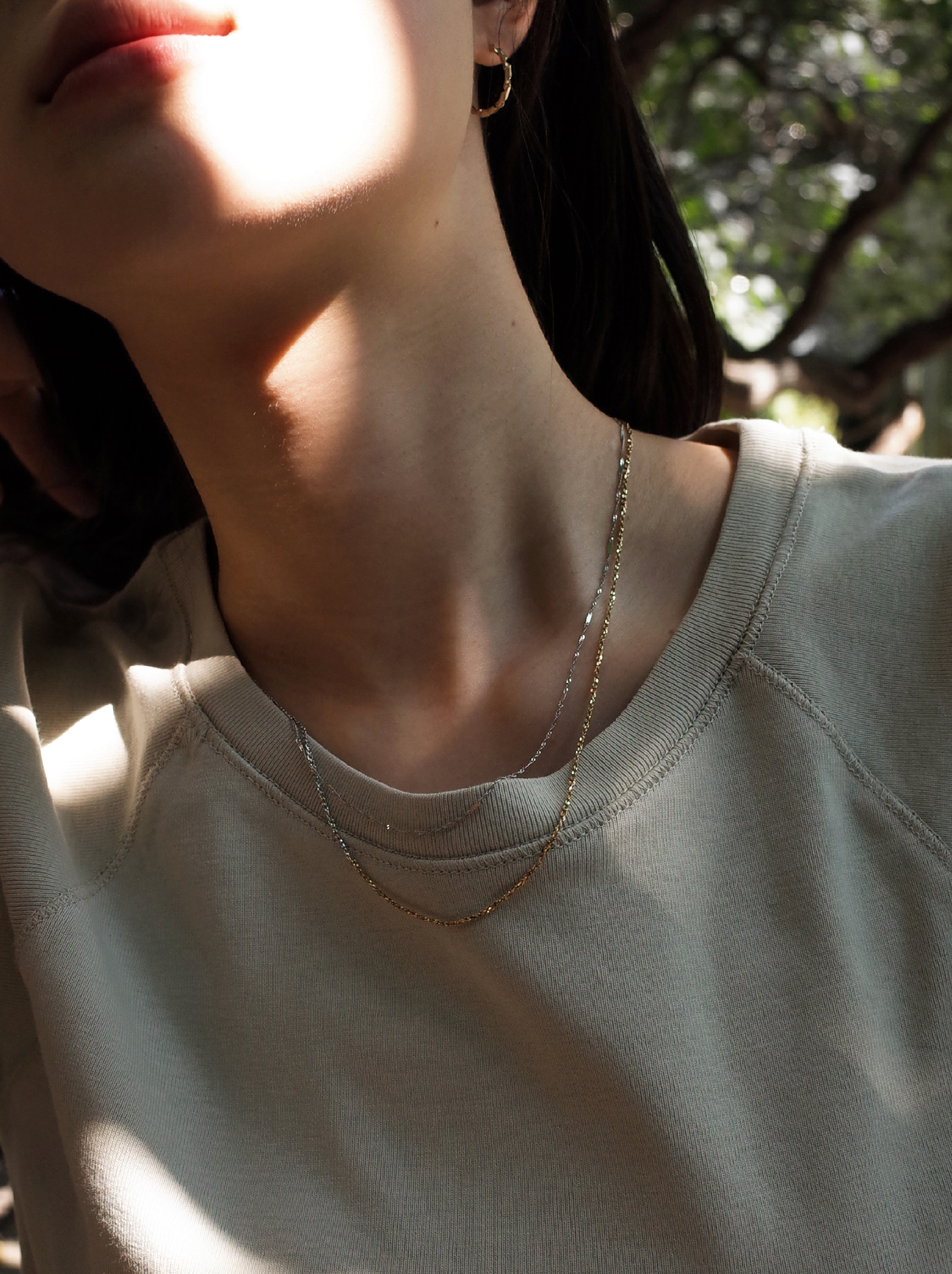 납작한 면과 커브 체인이 촘촘하게 엮인 이태리 수입 체인 네크리스입니다. 얇은 두께와 달리 이태리 특유 기술로 내구성이 매우 우수하며 착용한 느낌이 잘 느껴지지 않을 정도로 피부에 차분히 밀착되어 착용감이 매우 편안합니다. 고급스럽고 은은한 빛을 자아내 레이어드용 네크리스로도 추천드립니다.