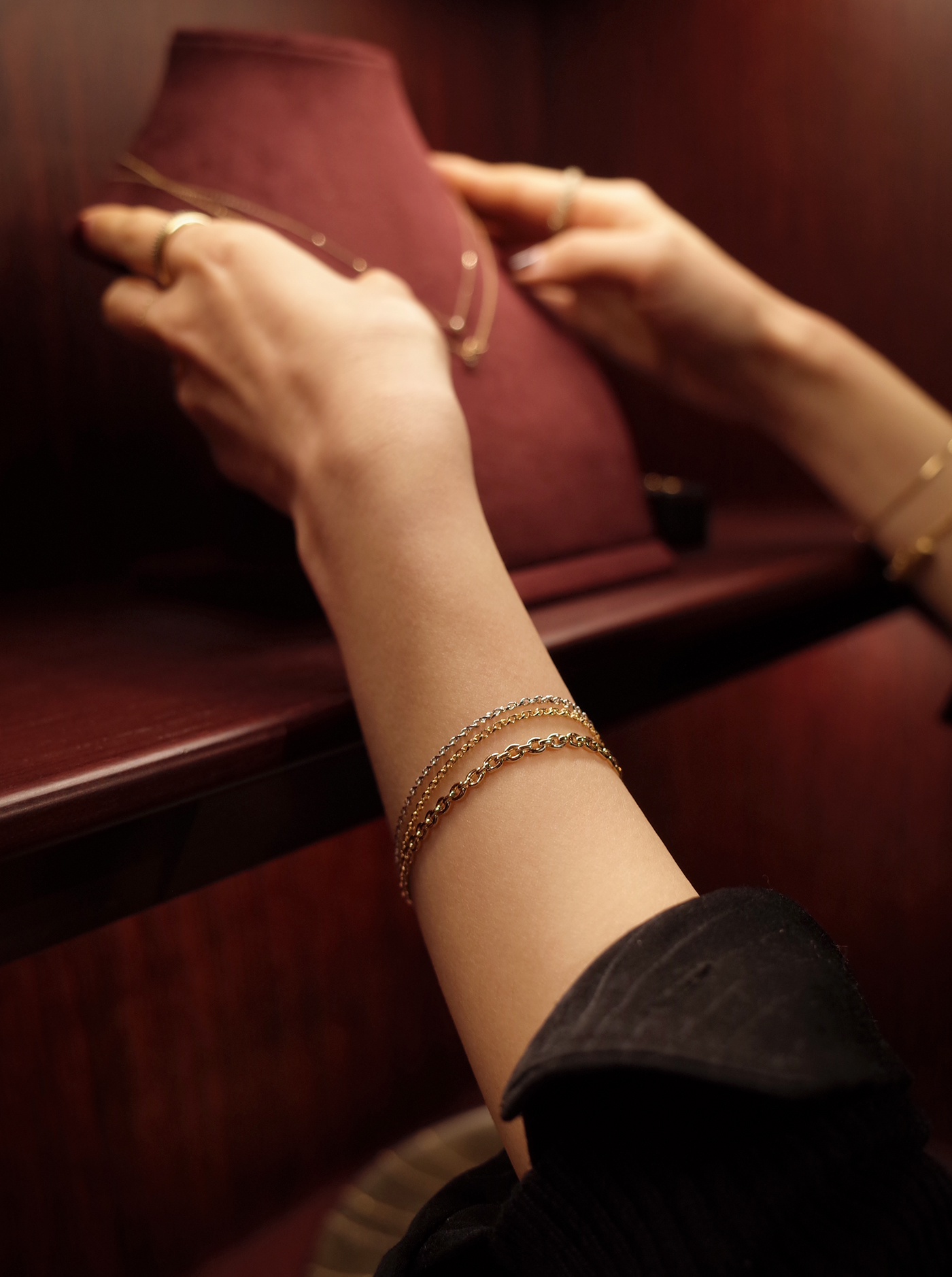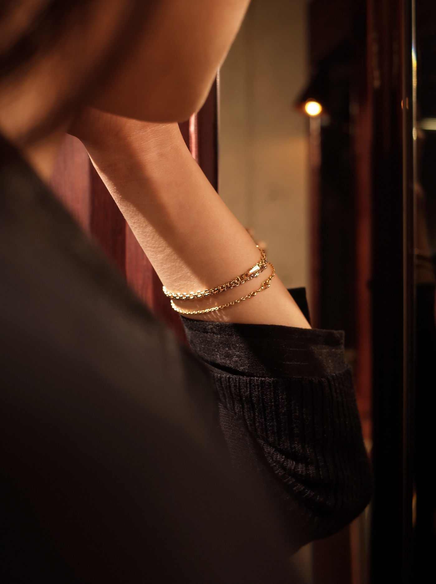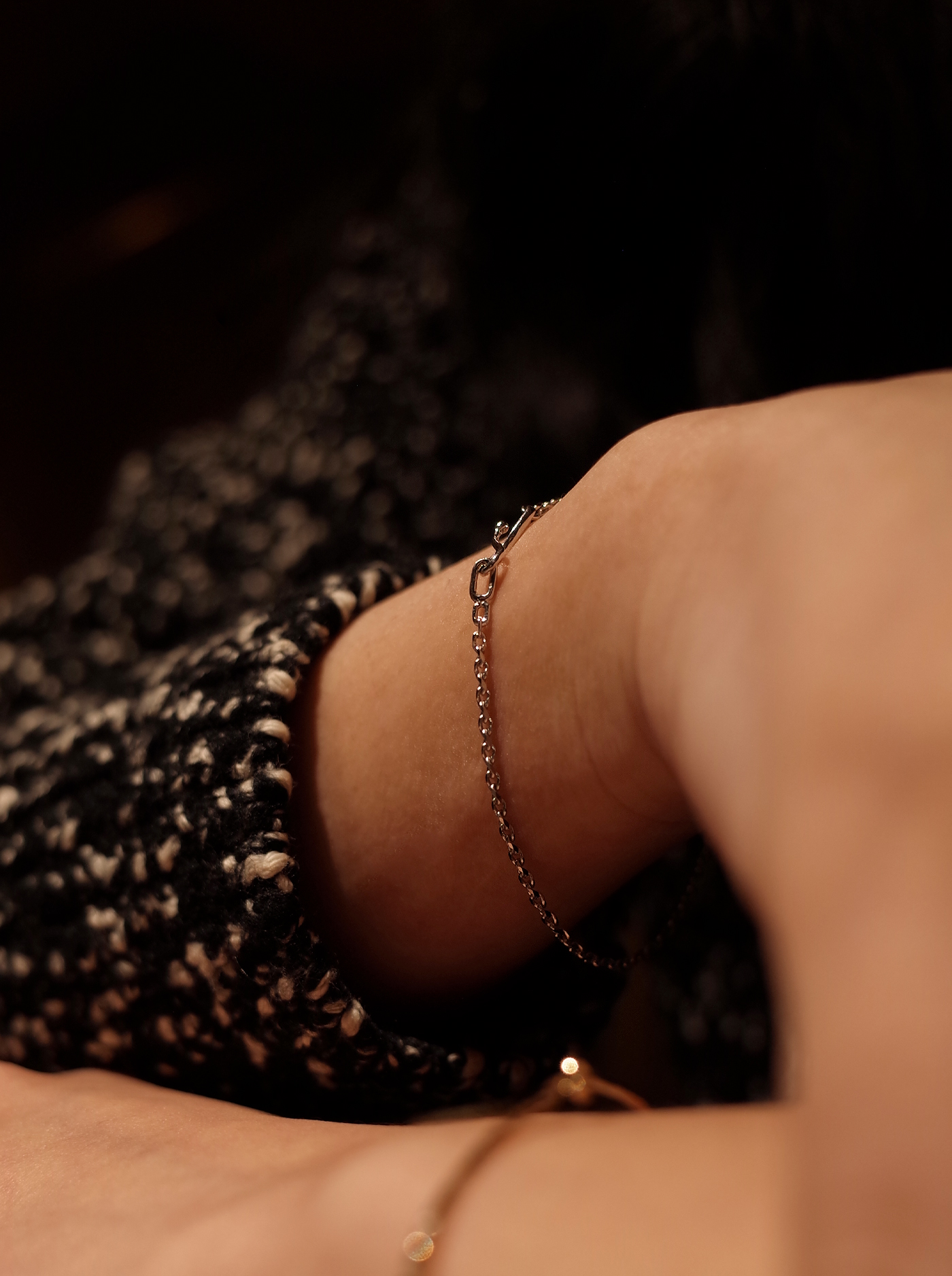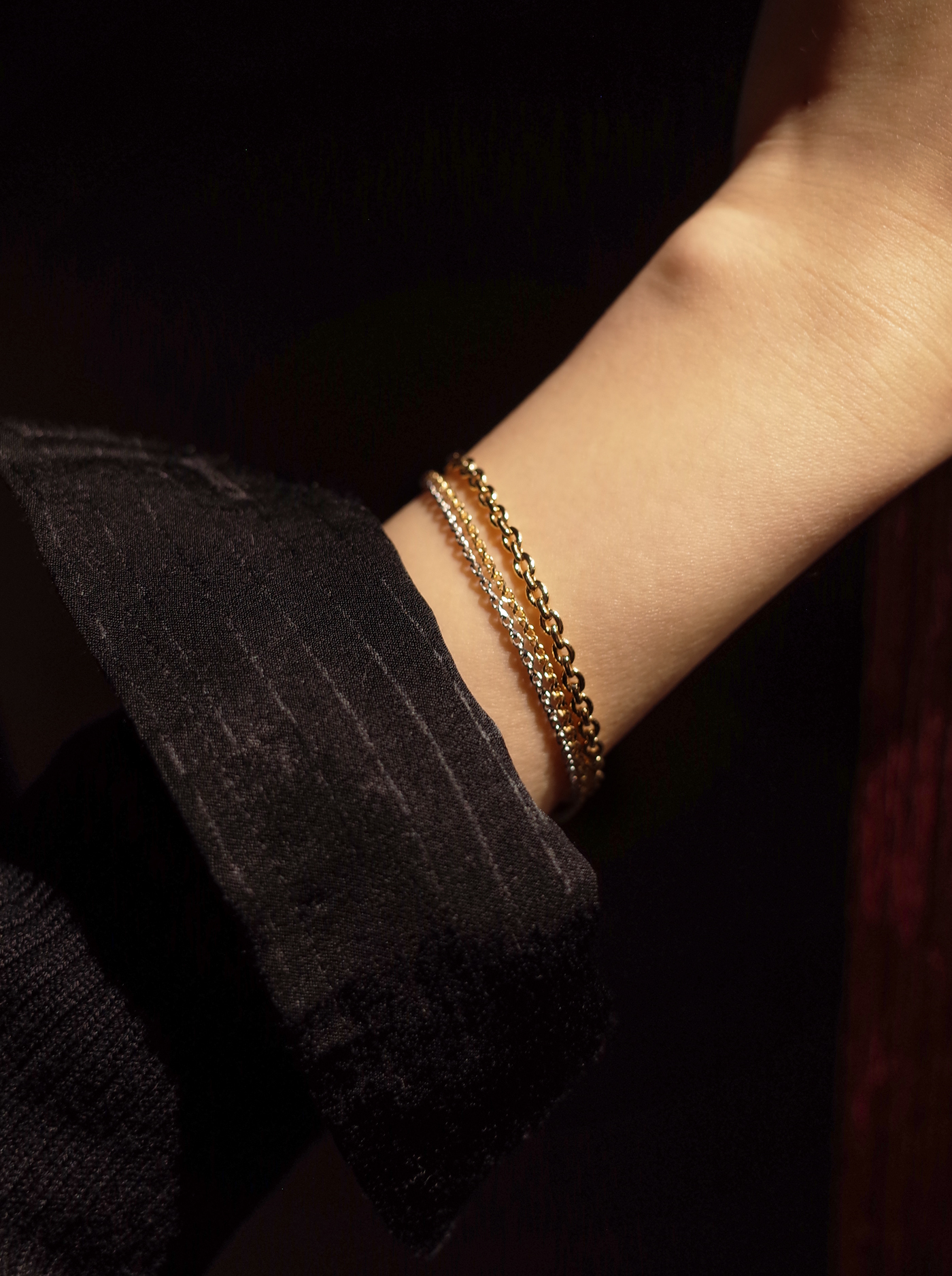 컷팅 체인으로 각도에 따라 은은한 반짝임이 매력적인 파인 체인 브라스렛은 단단한 유닛으로 단독 착용만으로도 고급스러움이 느껴지는 제품입니다. 매끈한 곡선의 걸쇠 장식은 체인과 대비되도록 하여 포인트를 주었습니다.