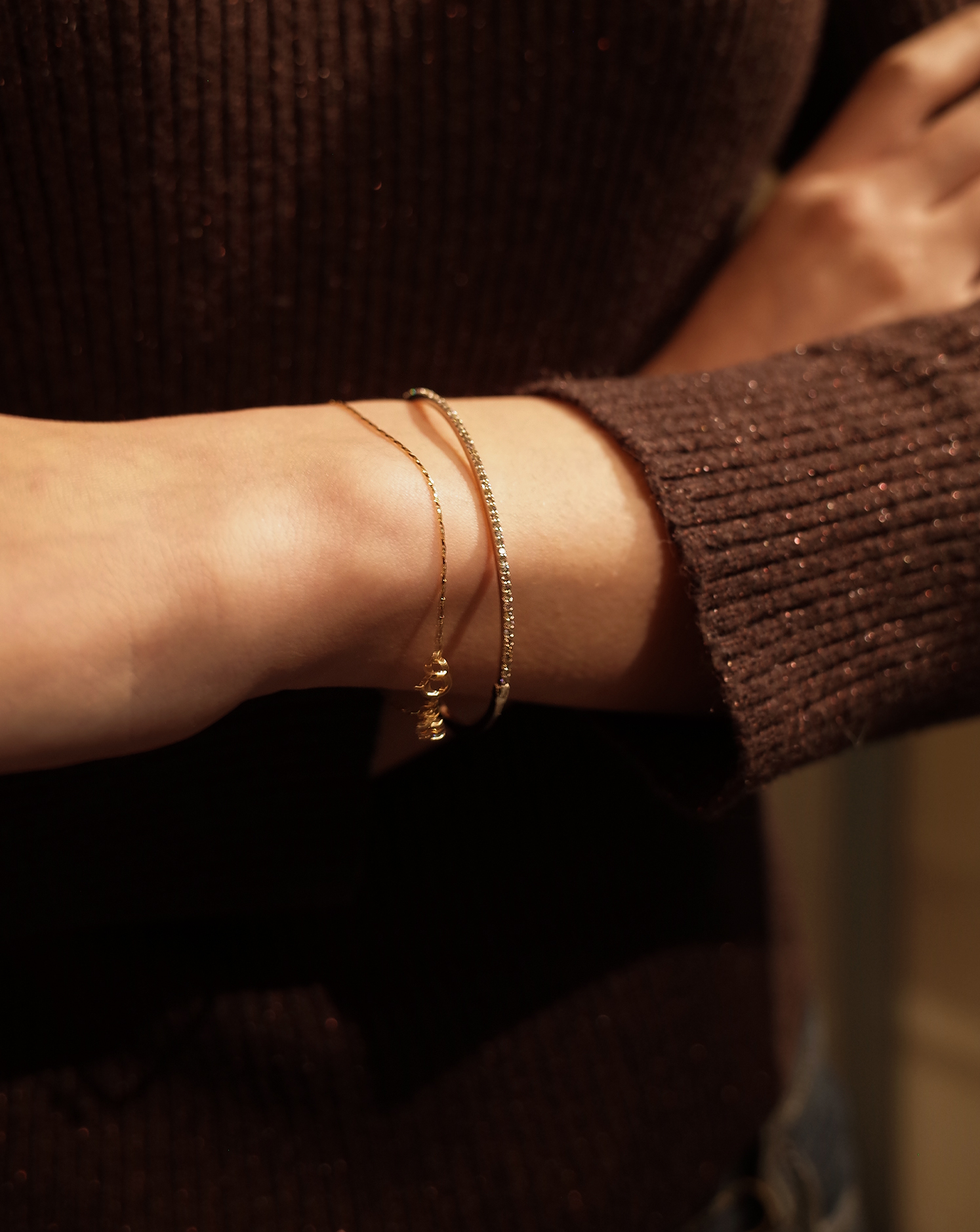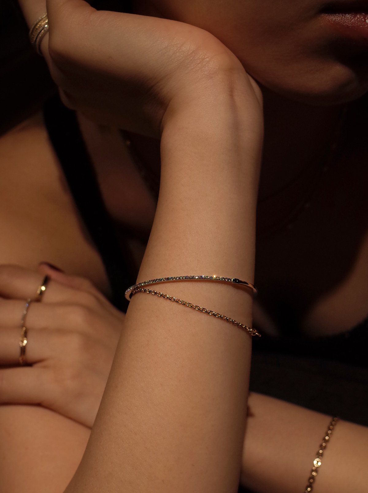 얇은 라인 위로 정교한 다이아 세팅이 돋보이는 에센셜 라인 뱅글
