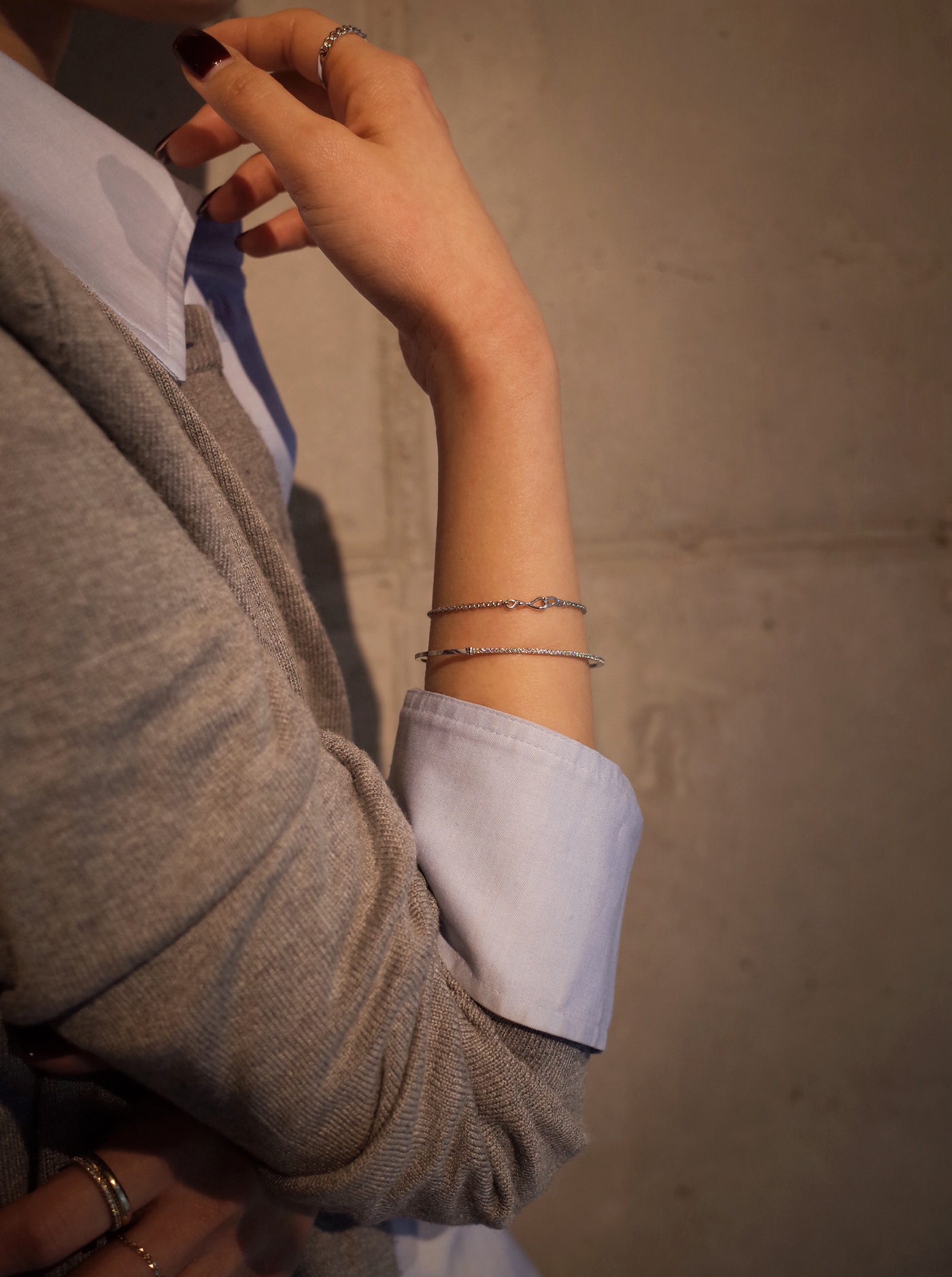 에센셜 라인 뱅글은 얇은 라인 위로 다이아를 촘촘히 세팅하여일상에서도 특별한 존재감을 선사합니다. 미감을 더해주는 더블 힌지로 섬세한 디테일과 절제된 아름다움을 담아냈습니다.