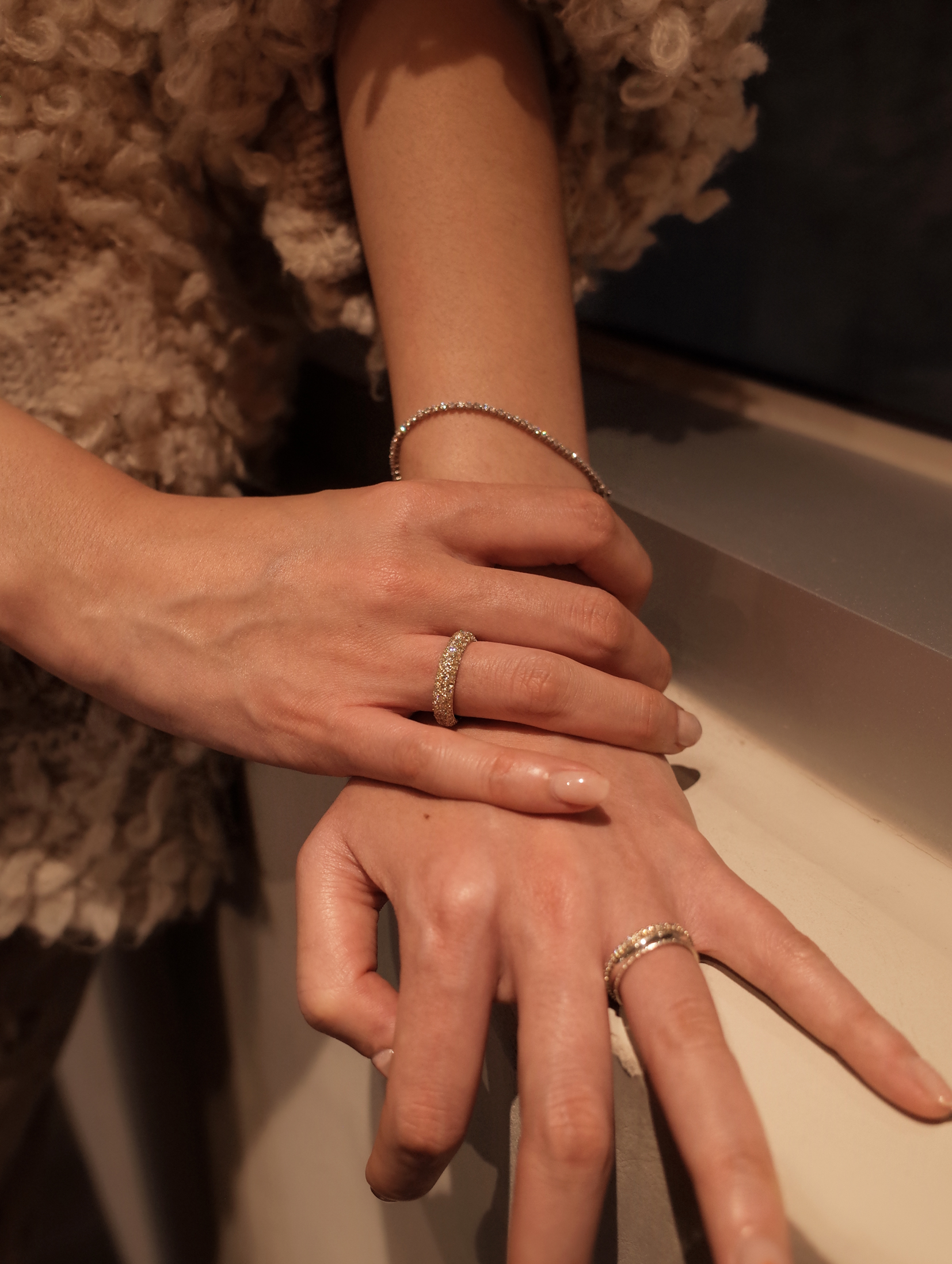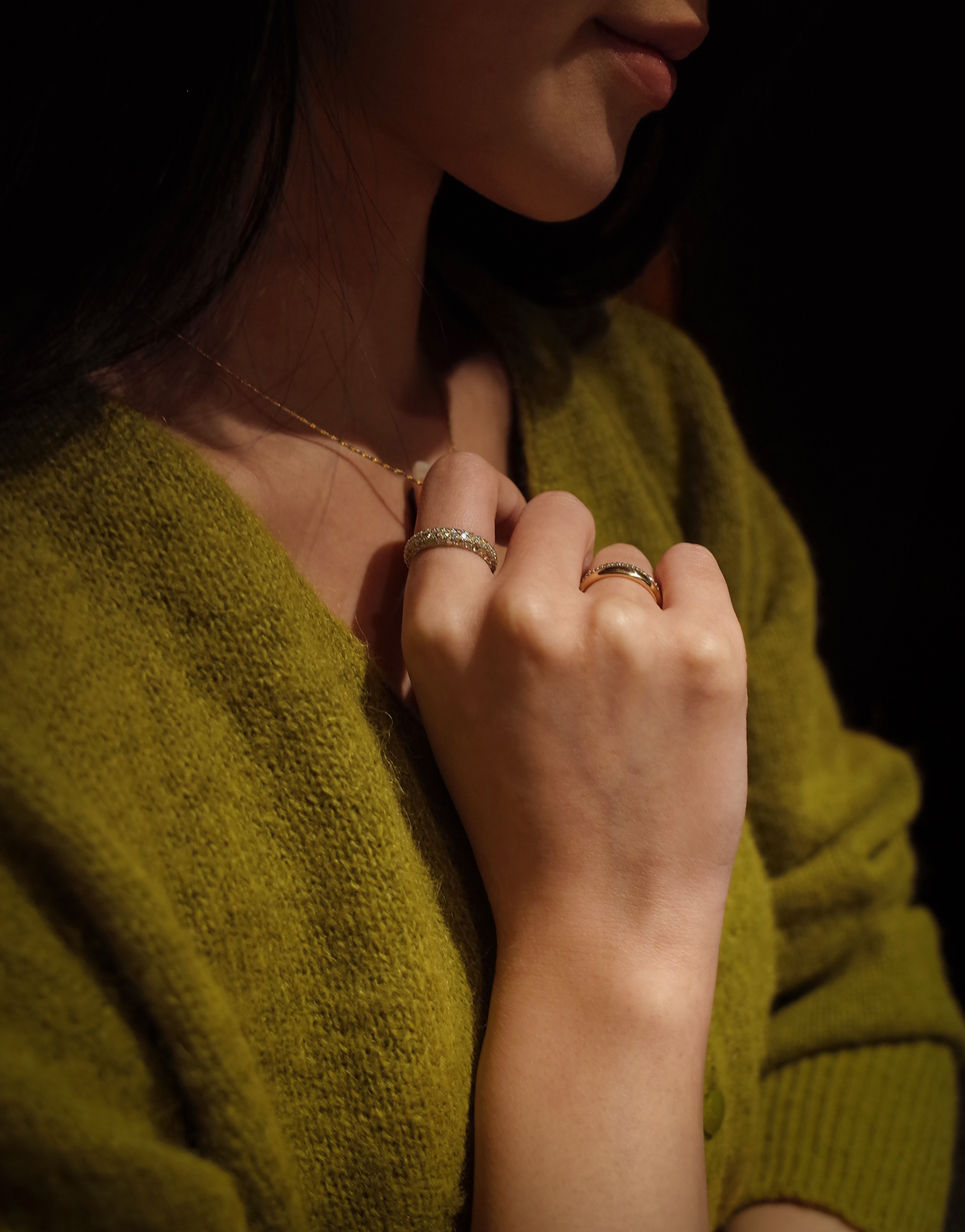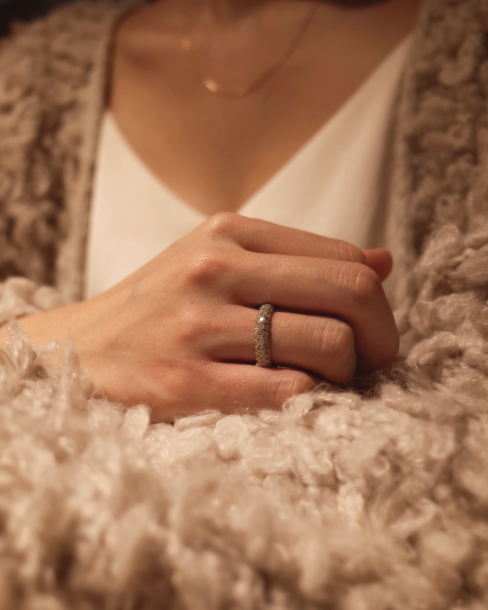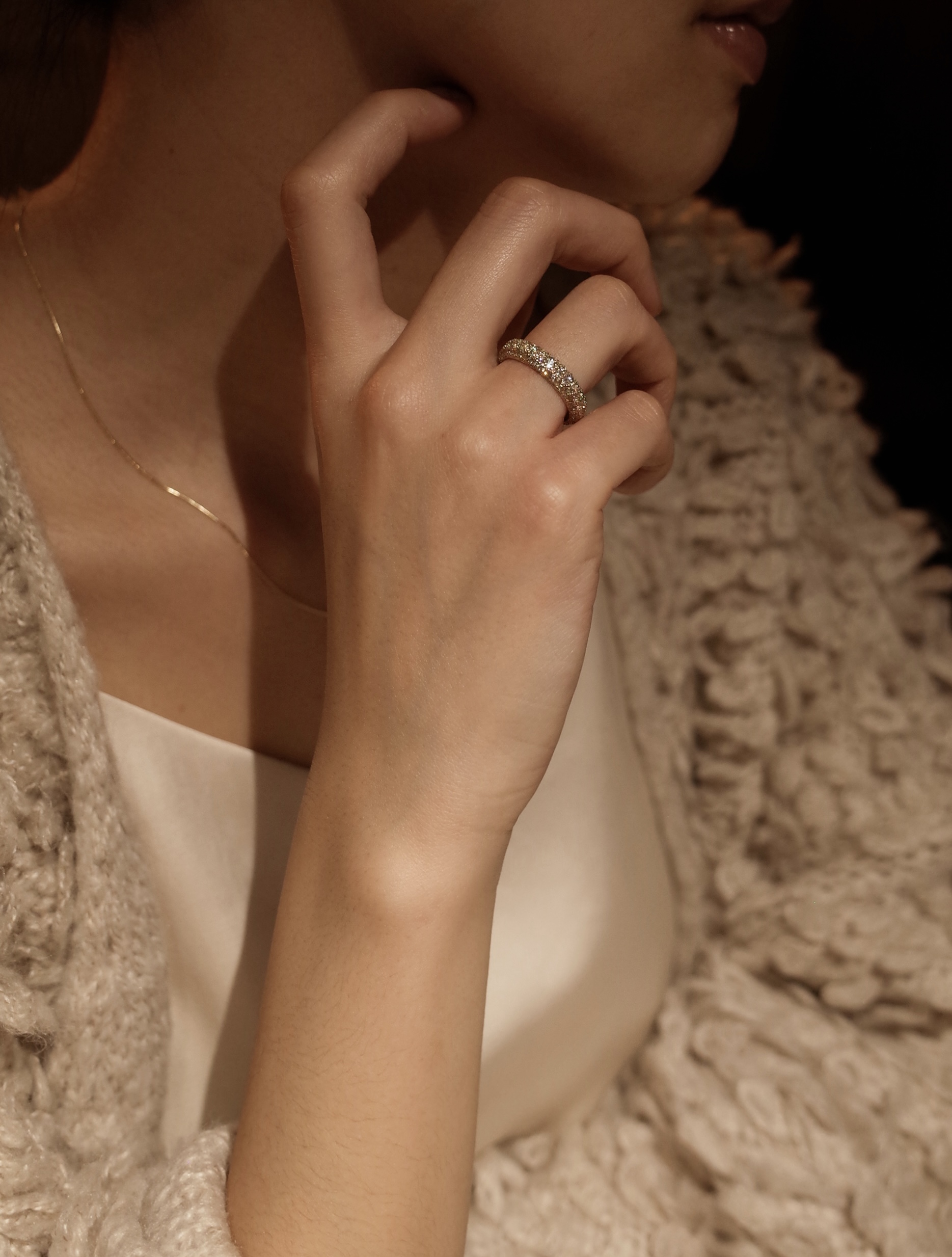 특정 음을 멈추고 순간의 여운을 음미하도록 허락하는 클래식 음악 기호 ‘Fermata’ 세련된 곡선 쉐입과 균형 잡힌 구조의 페르마타는 시대를 초월하는 아름다움으로 강렬한 존재감을 선사합니다. 샴페인 스톤이 정교하게 세팅된 풀 파베 디테일은 어느 각도에서나 부드러운 빛을 반사하며 단독 착용만으로도 독보적인 우아함을 드러냅니다.