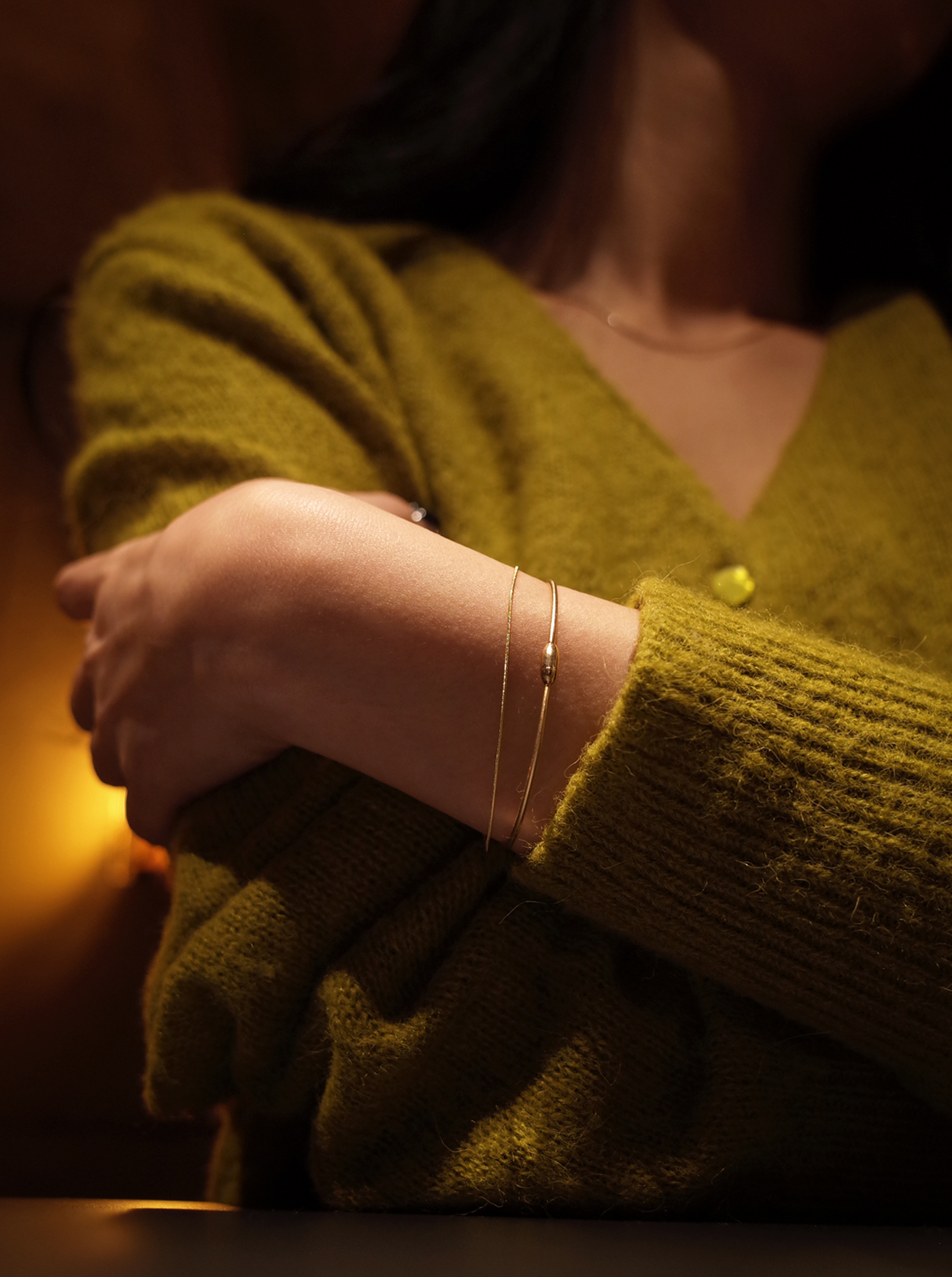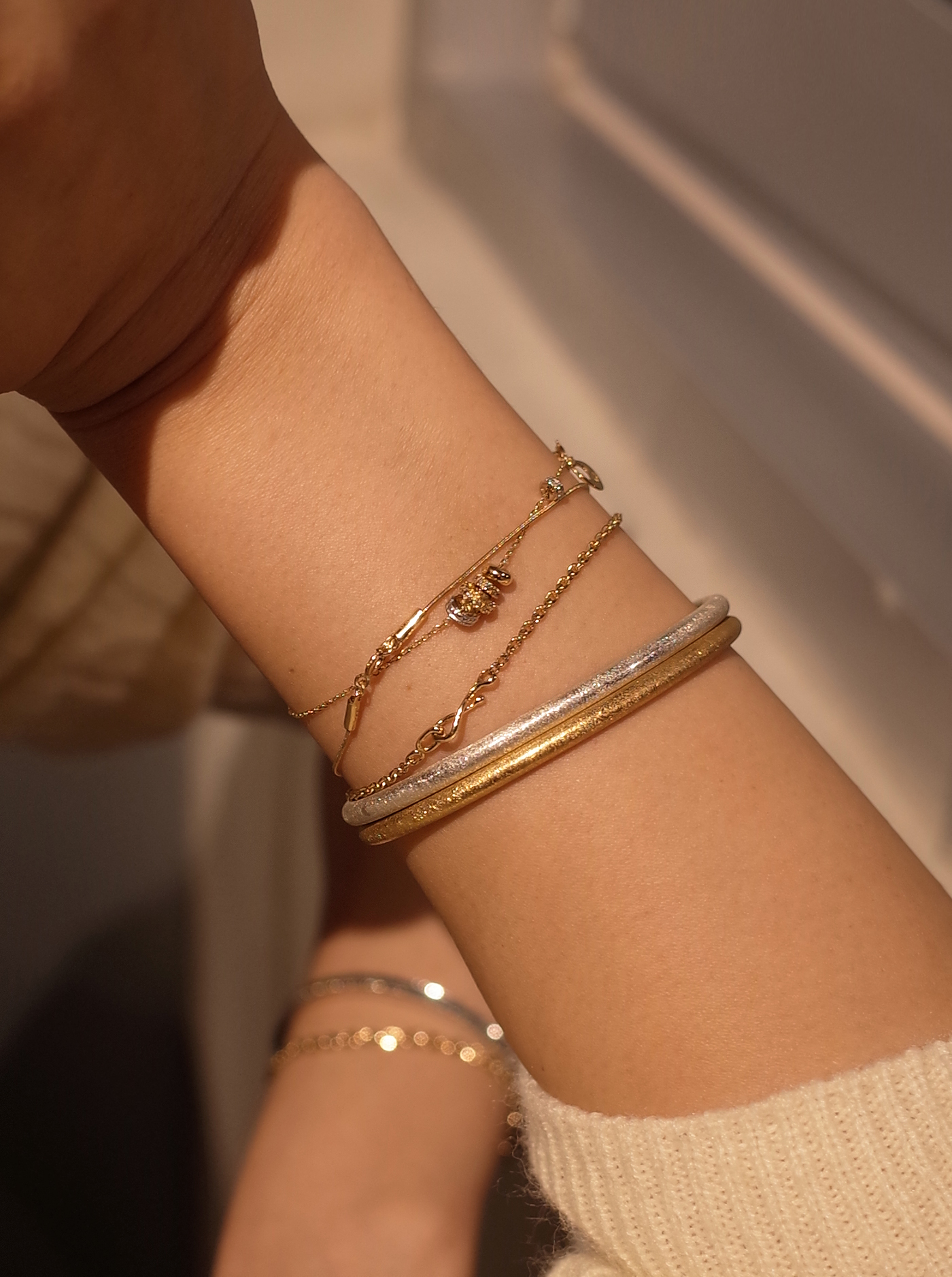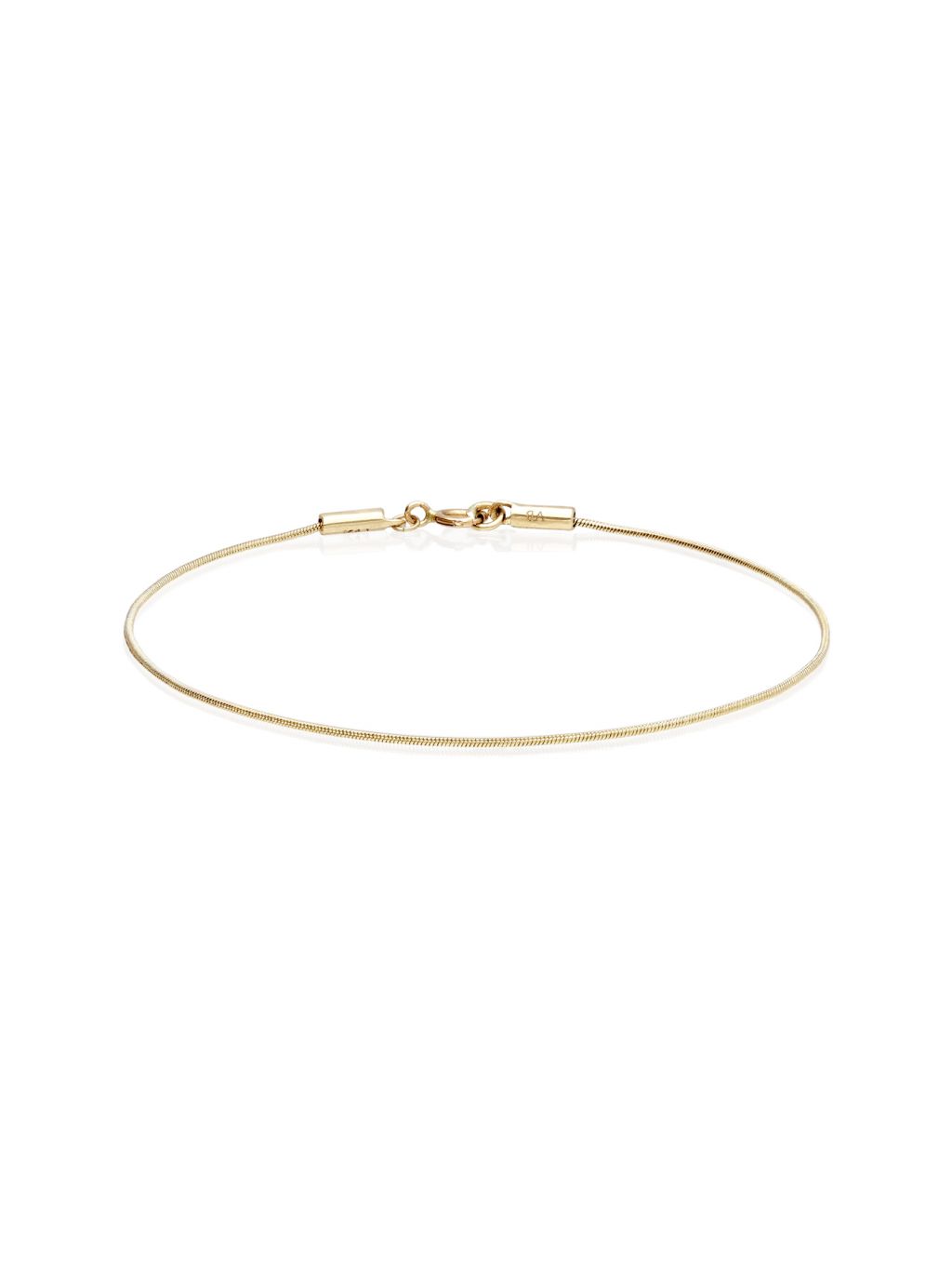 피부 위로 가느다란 실을 두른 듯한체인에 매끈한 바 장식으로 마감한 브라스렛