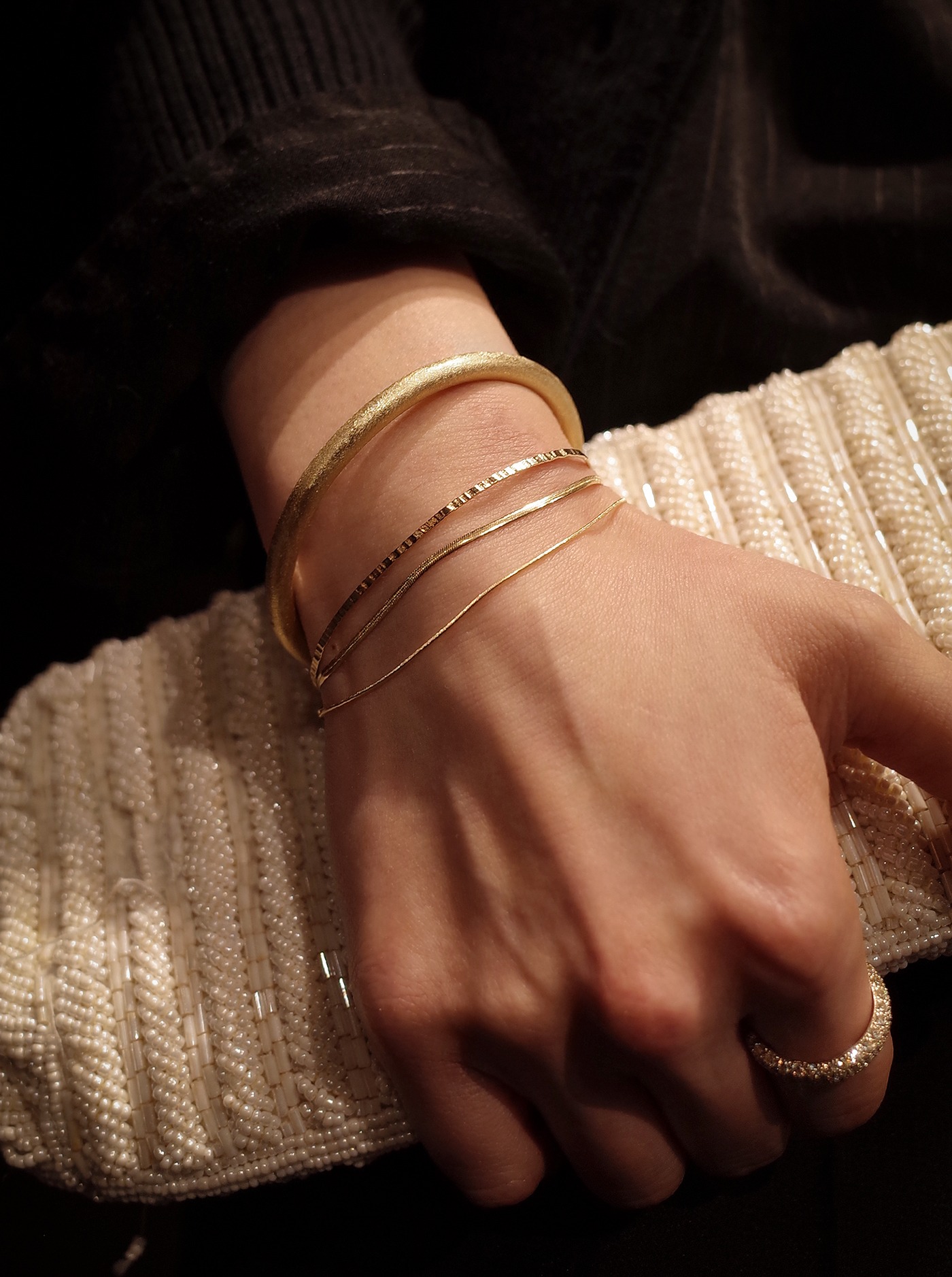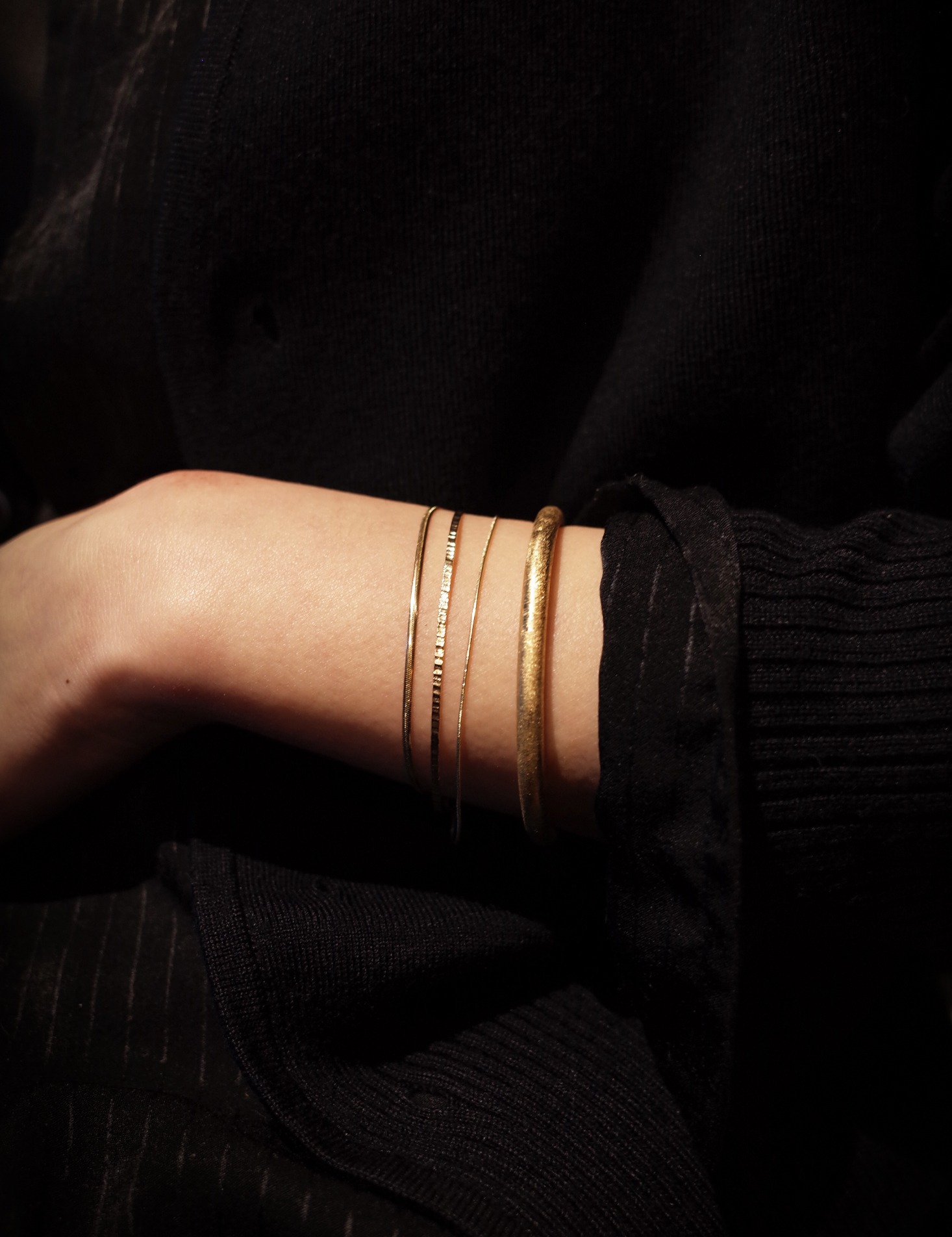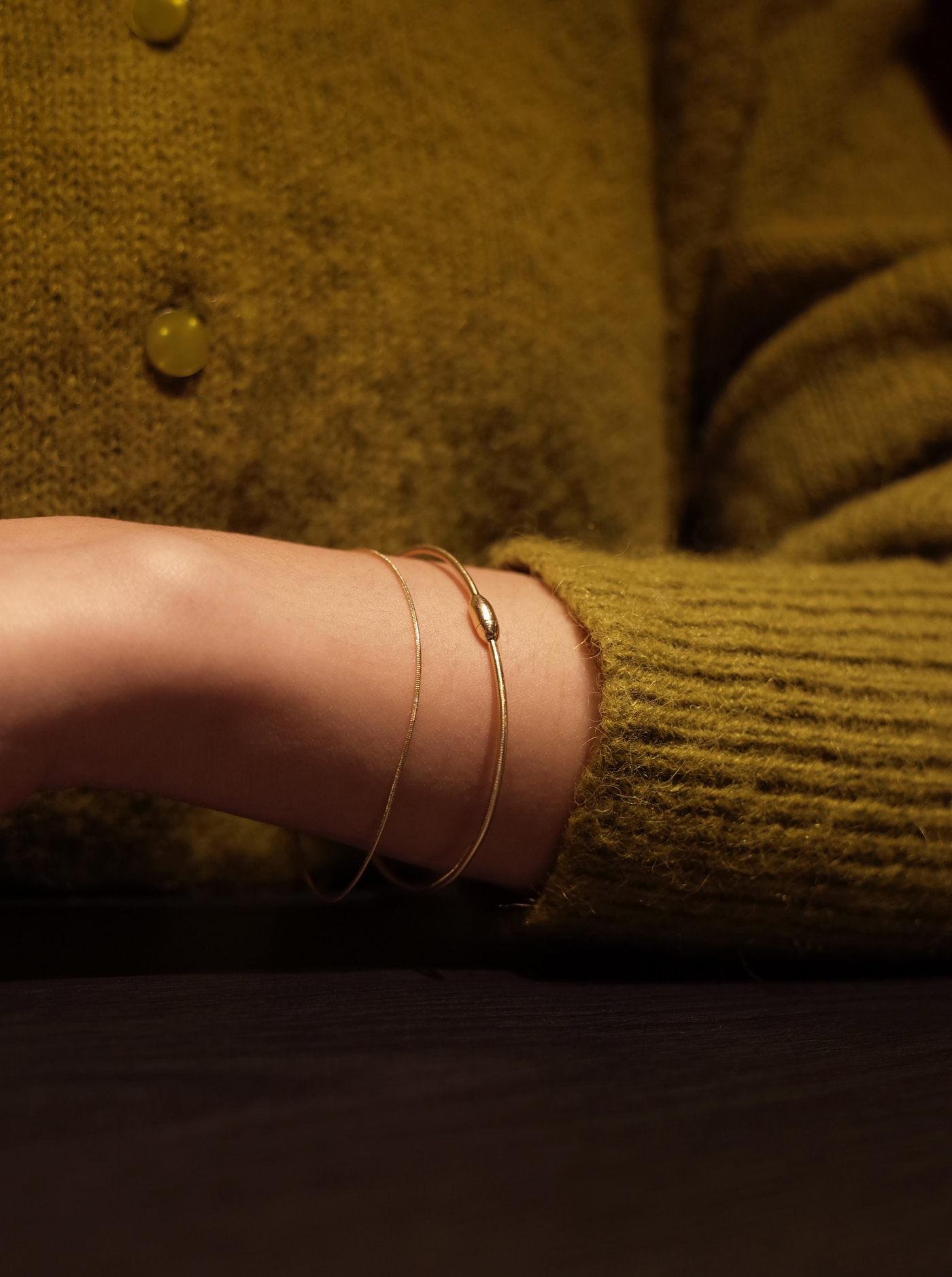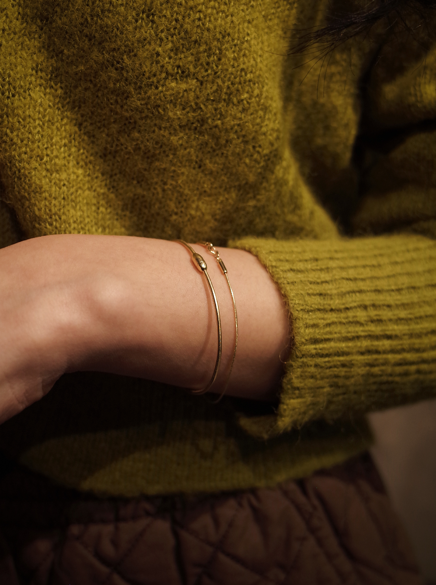 피부 위로 가느다란 실을 두른 듯한체인에 매끈한 바 장식으로 마감한 브라스렛