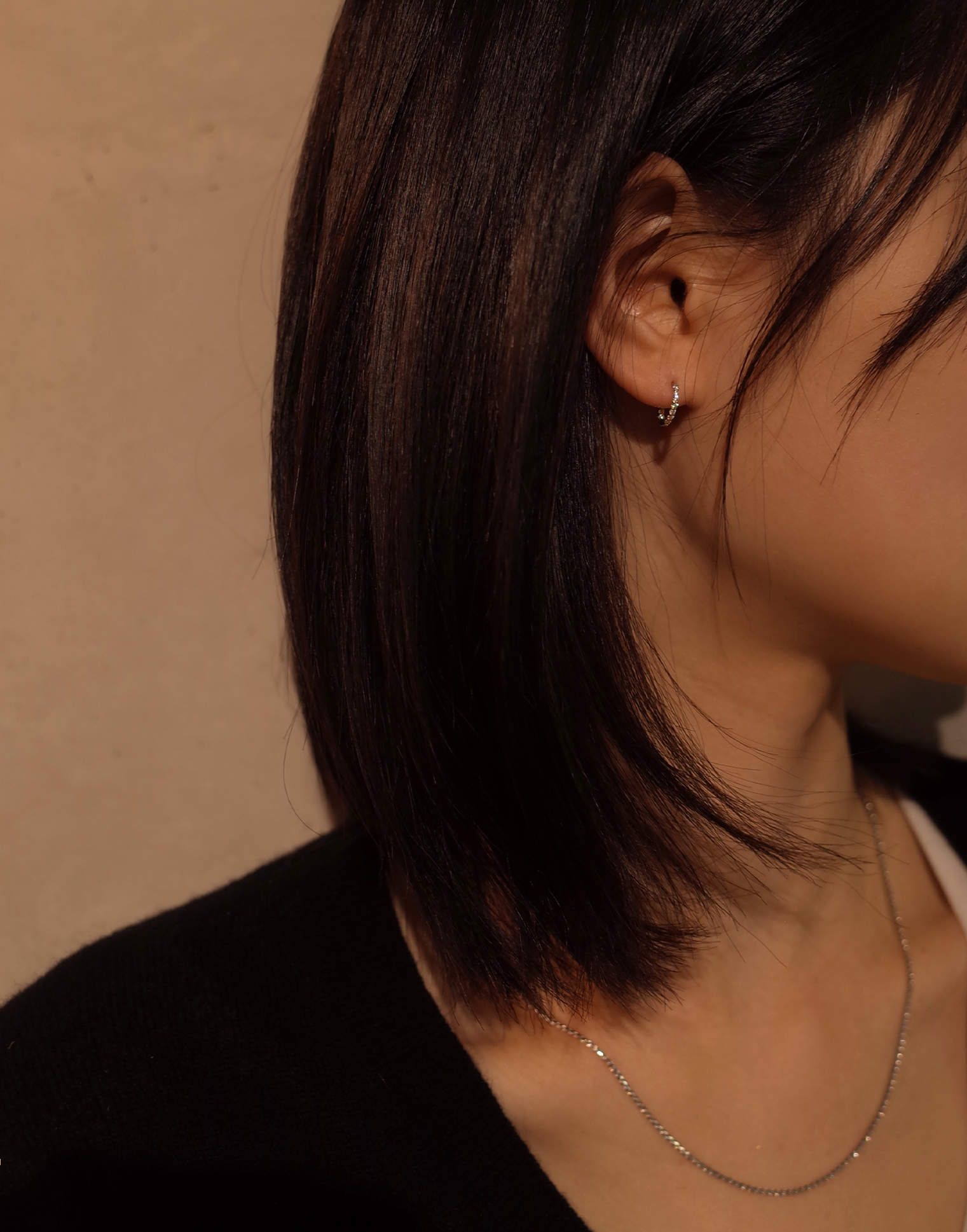 'Brisa'는 가볍게 살랑이는 바람을 의미합니다. 얇은 너비에 앞면의 내외부에 작은 스톤이 섬세하게 세팅되어 전체적으로 부드러운 빛을 발하며 얼굴에 화사함을 더해주는 원터치 방식의 후프형 이어링입니다. Brisa I은 미세한 타원형에 미니멀한 사이즈이며, Brisa II은 정원형으로 적당히 공간감이 느껴지는 사이즈입니다.