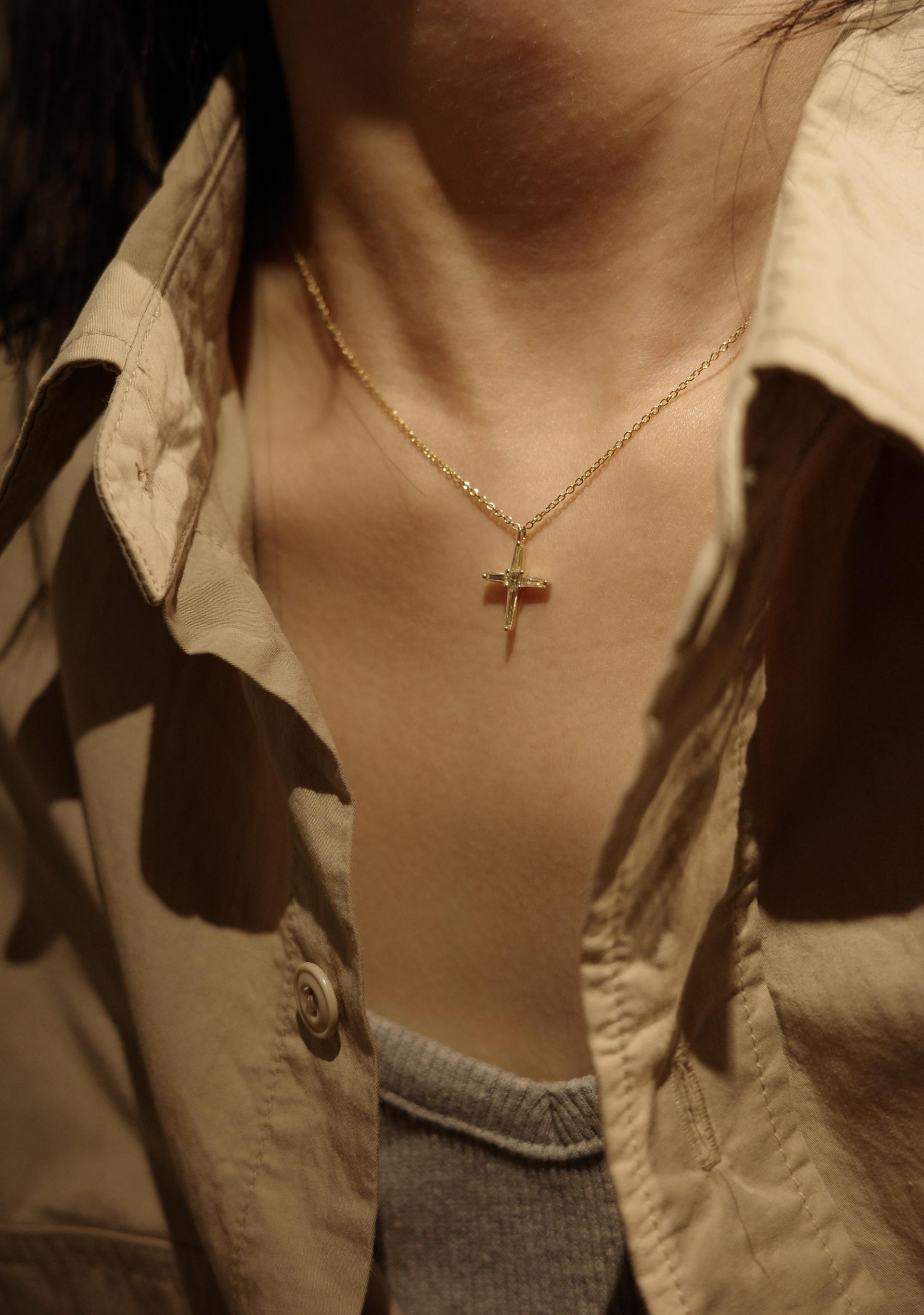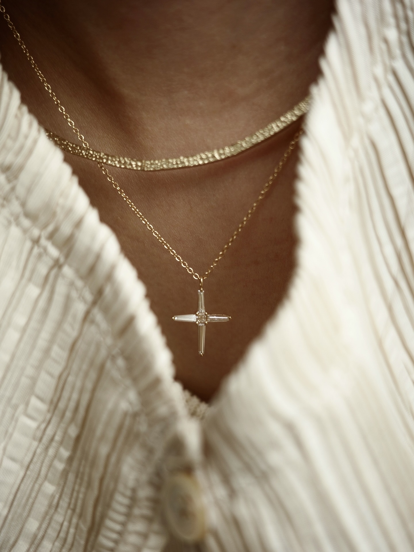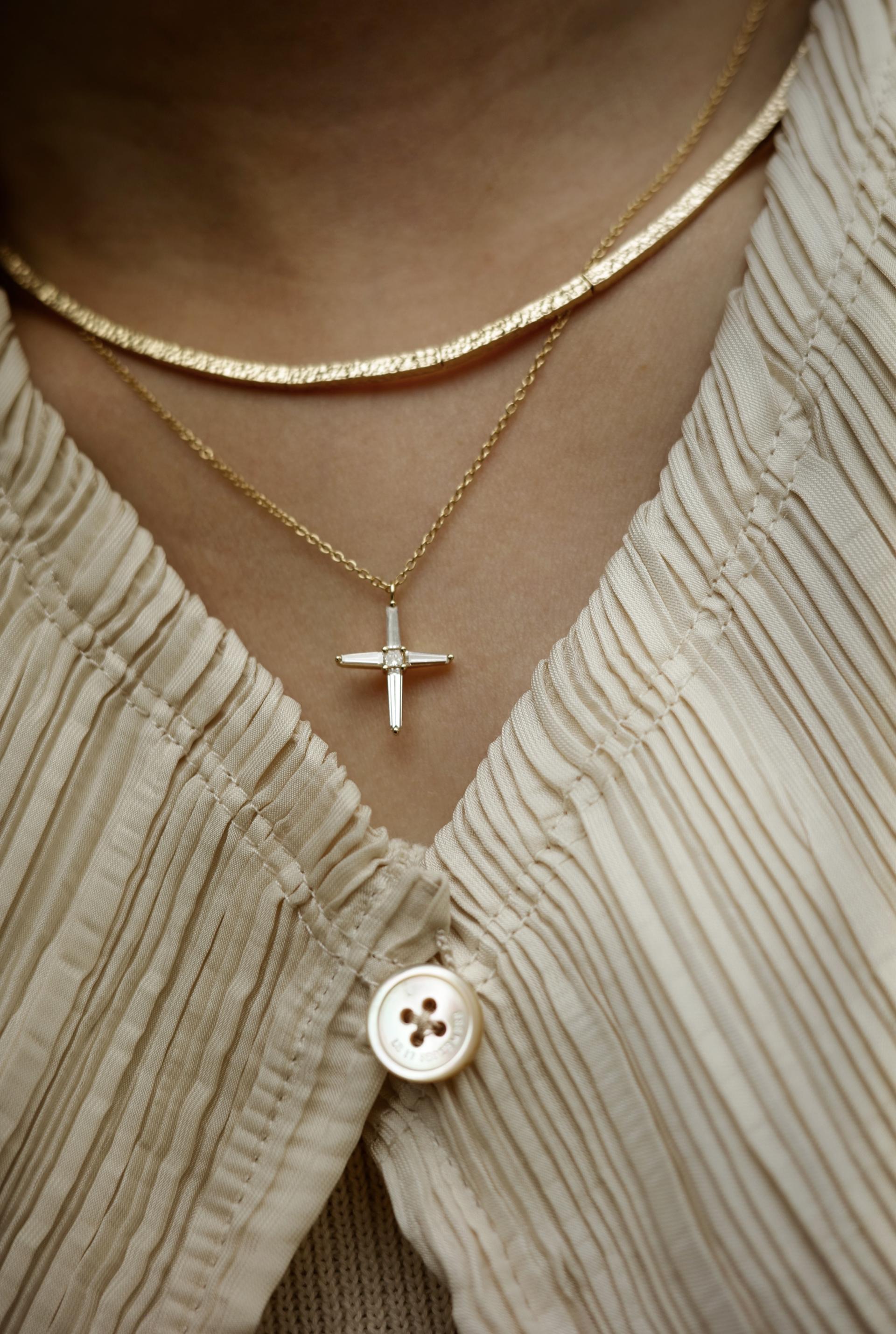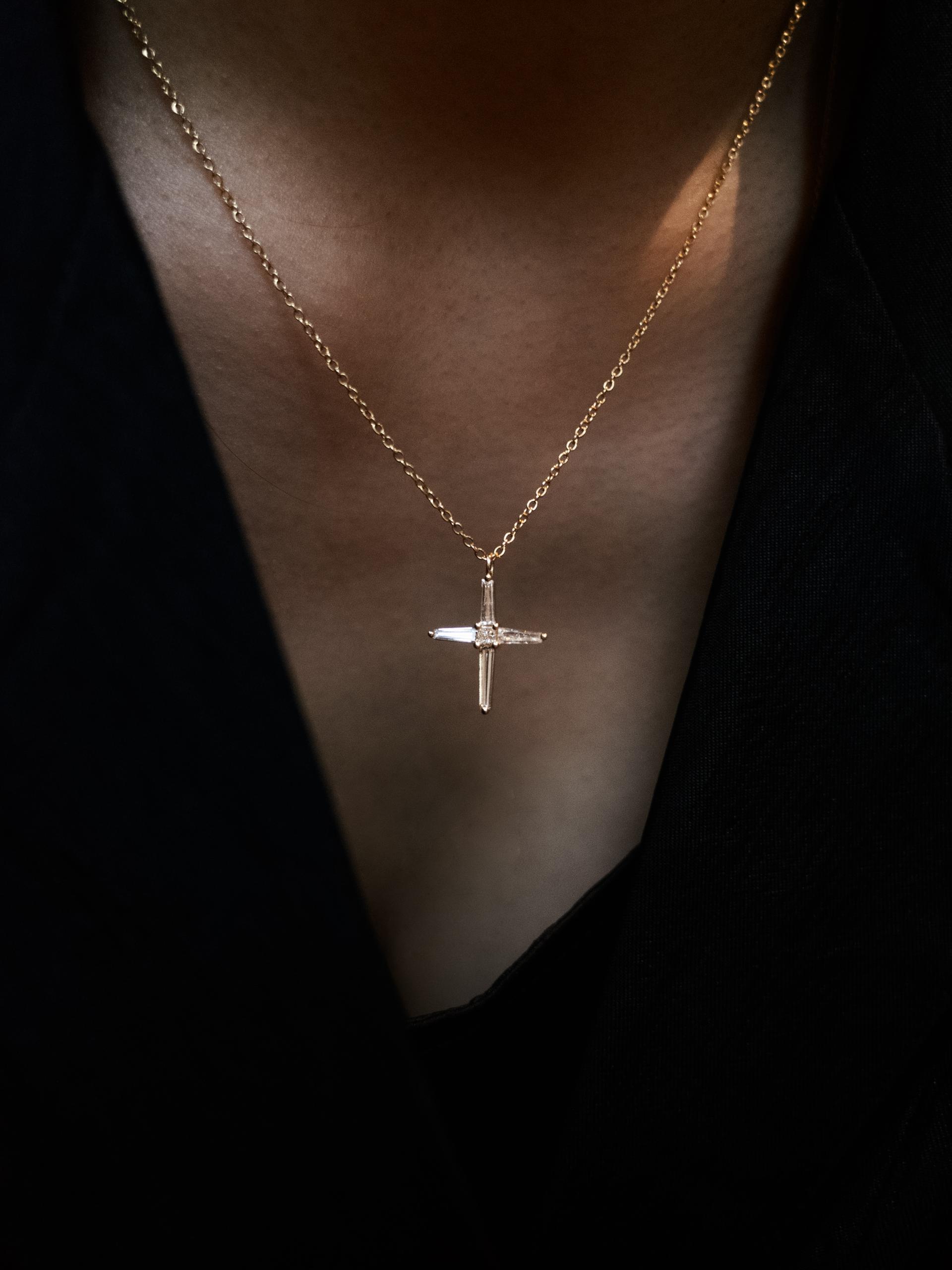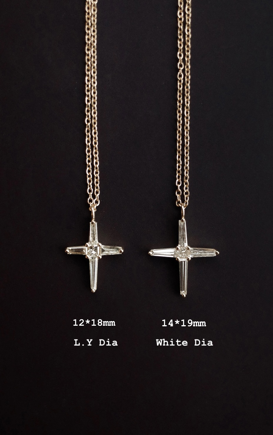 고유한 형태의 천연 테이퍼드 다이아가 세팅된 십자가 네크리스입니다. 정교한 세공을 거쳐 마치 결점없는 거울처럼 투명한 빛을 반사하며, 고요하지만 강렬한 존재감을 드러냅니다.