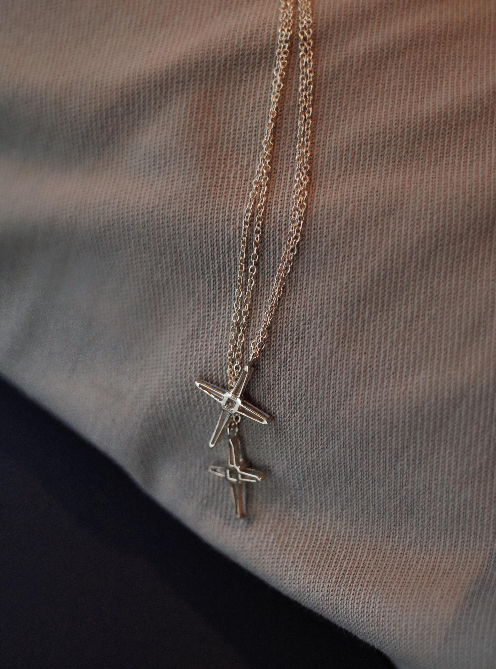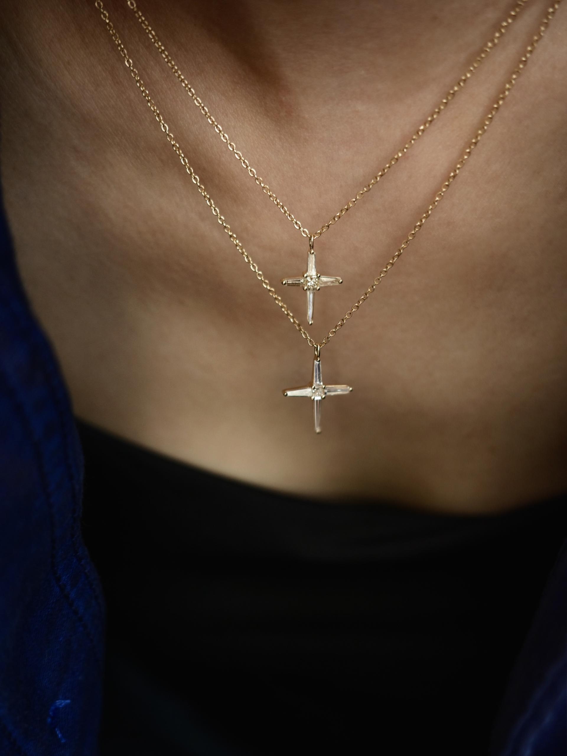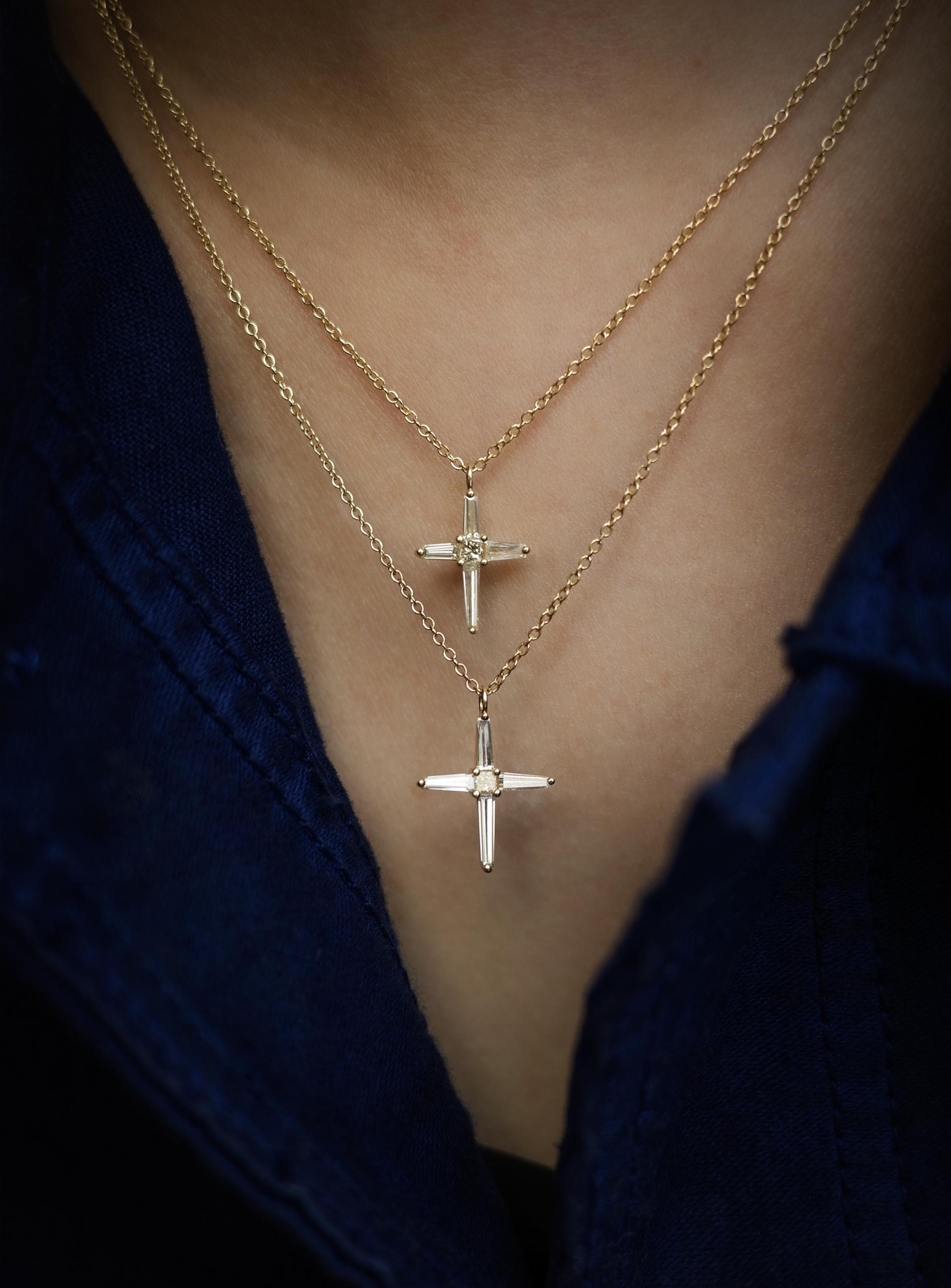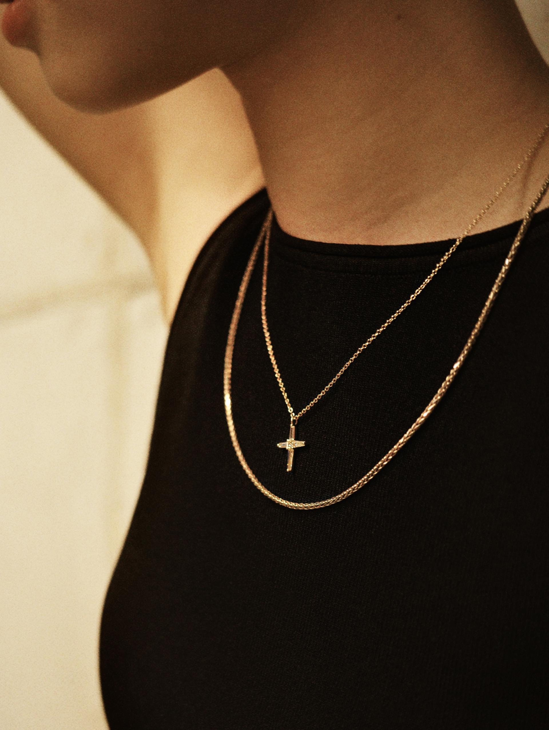고유한 형태의 천연 테이퍼드 다이아가 세팅된 십자가 네크리스입니다. 정교한 세공을 거쳐 마치 결점없는 거울처럼 투명한 빛을 반사하며, 고요하지만 강렬한 존재감을 드러냅니다.