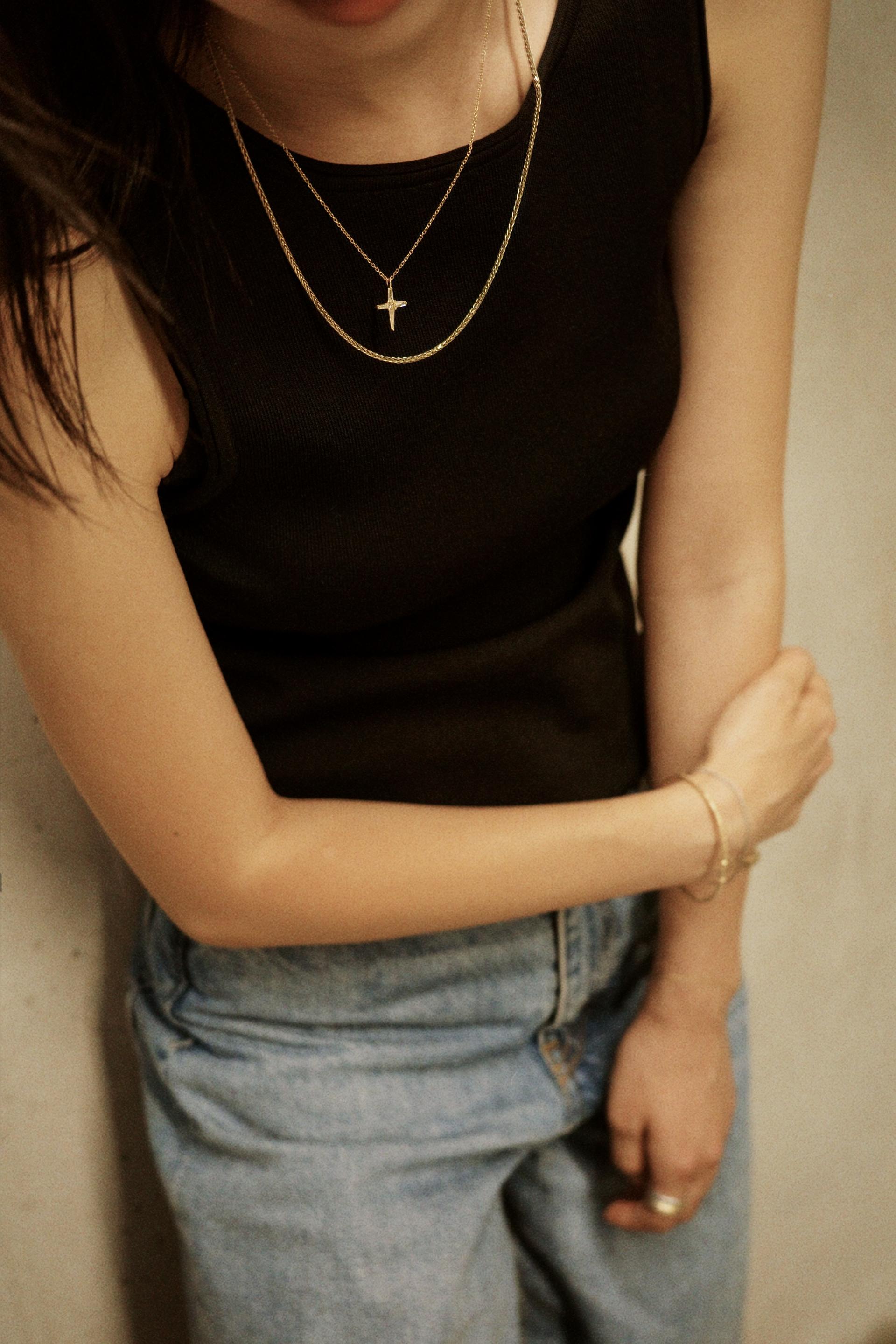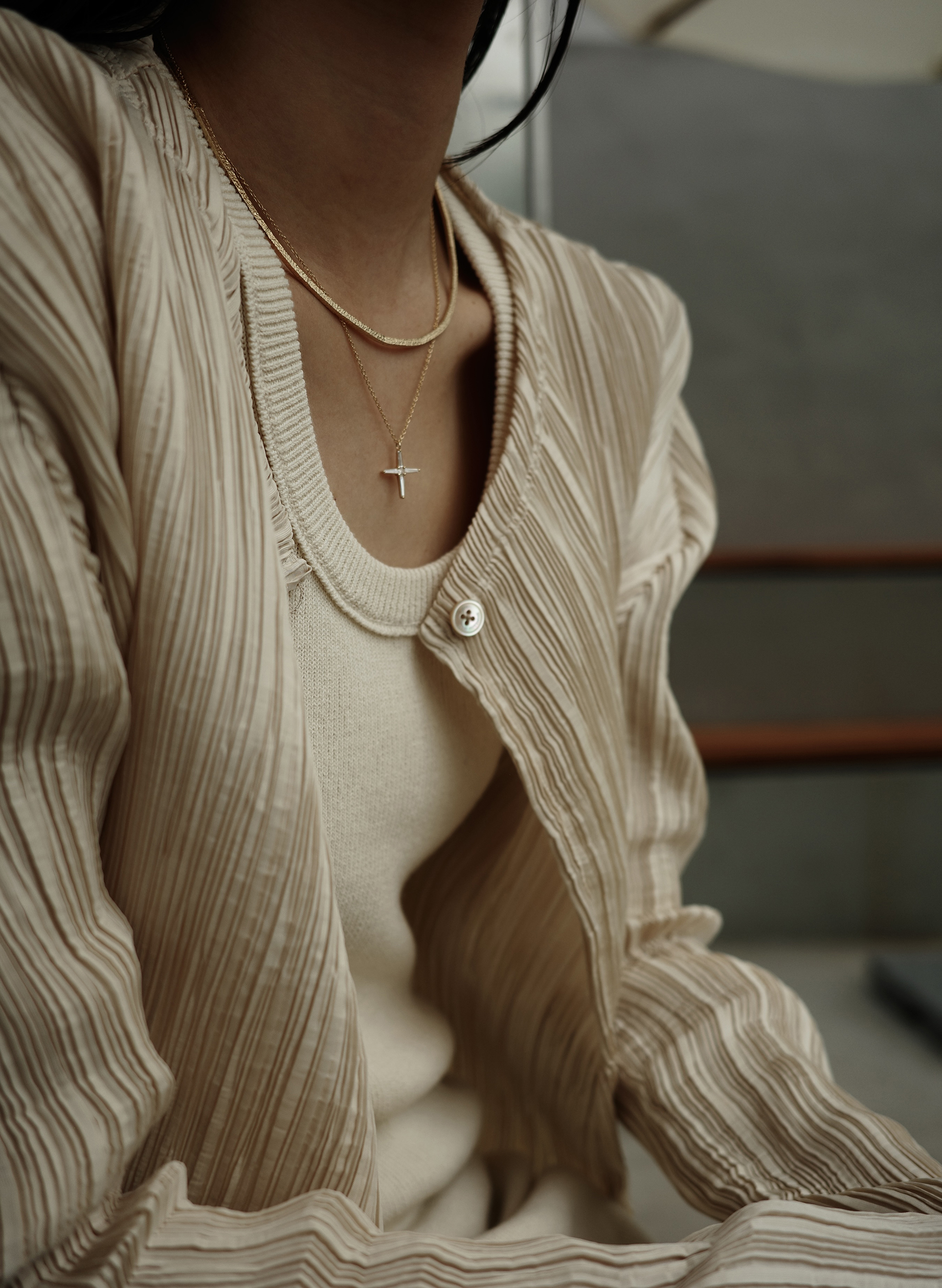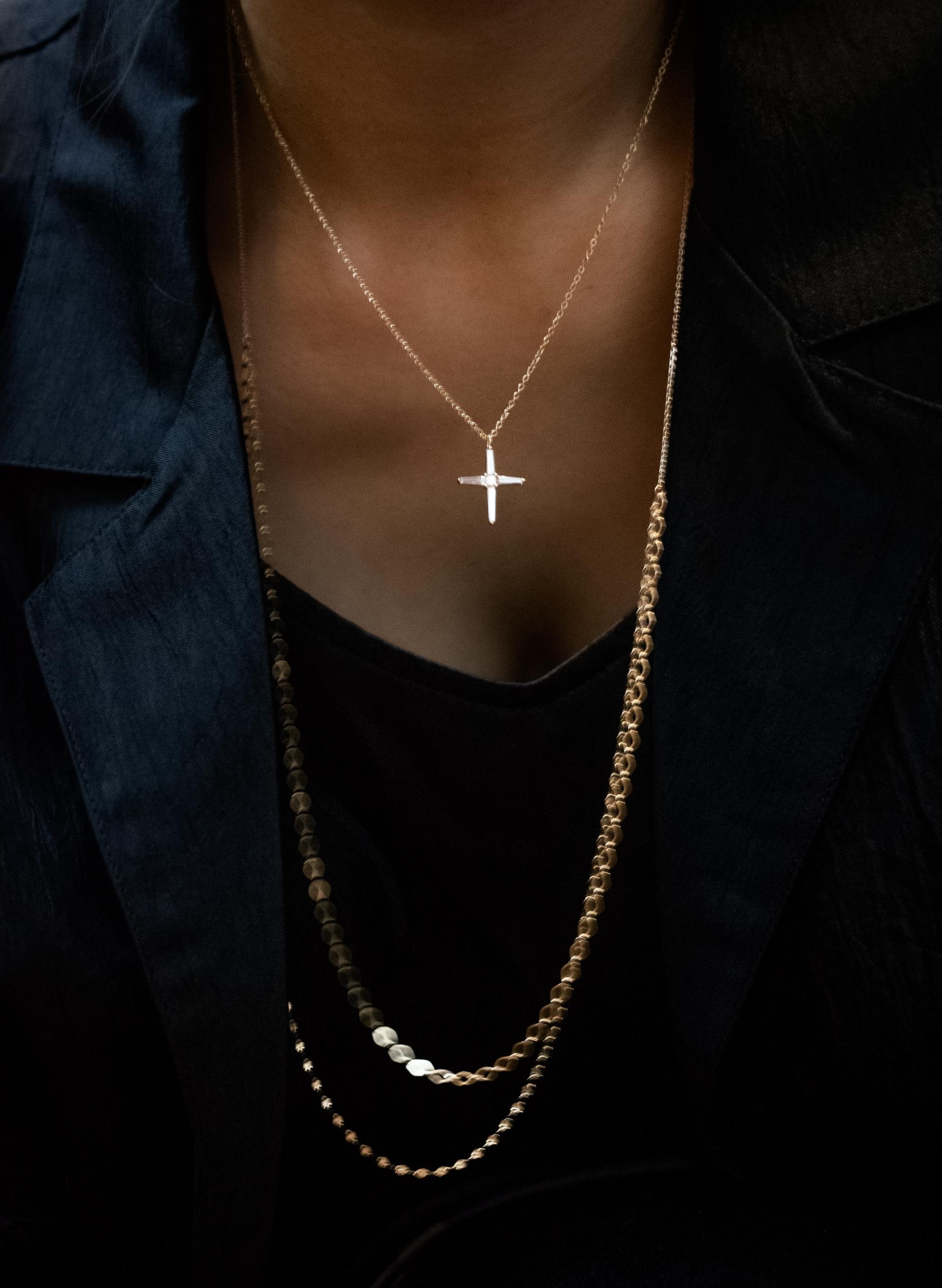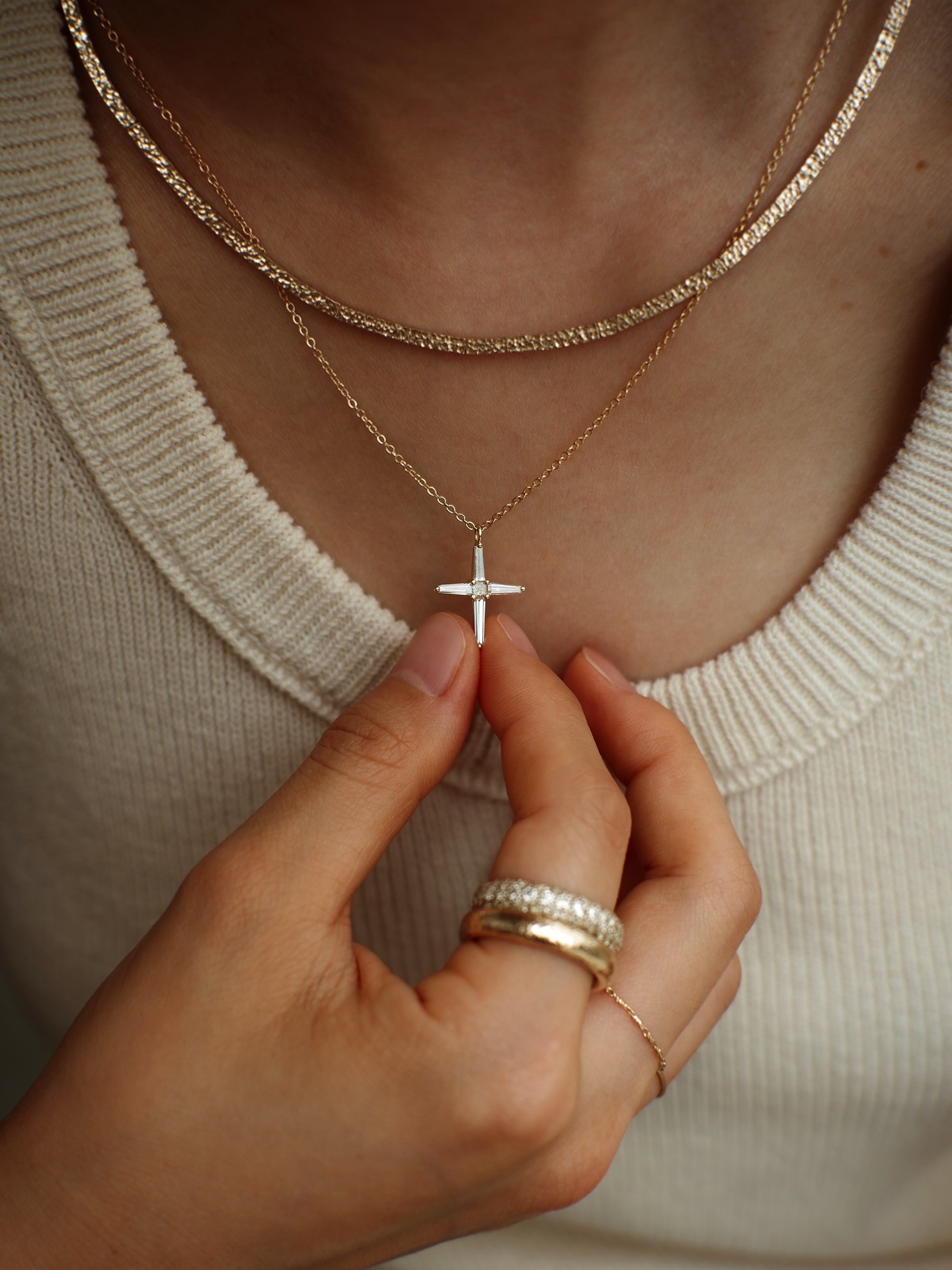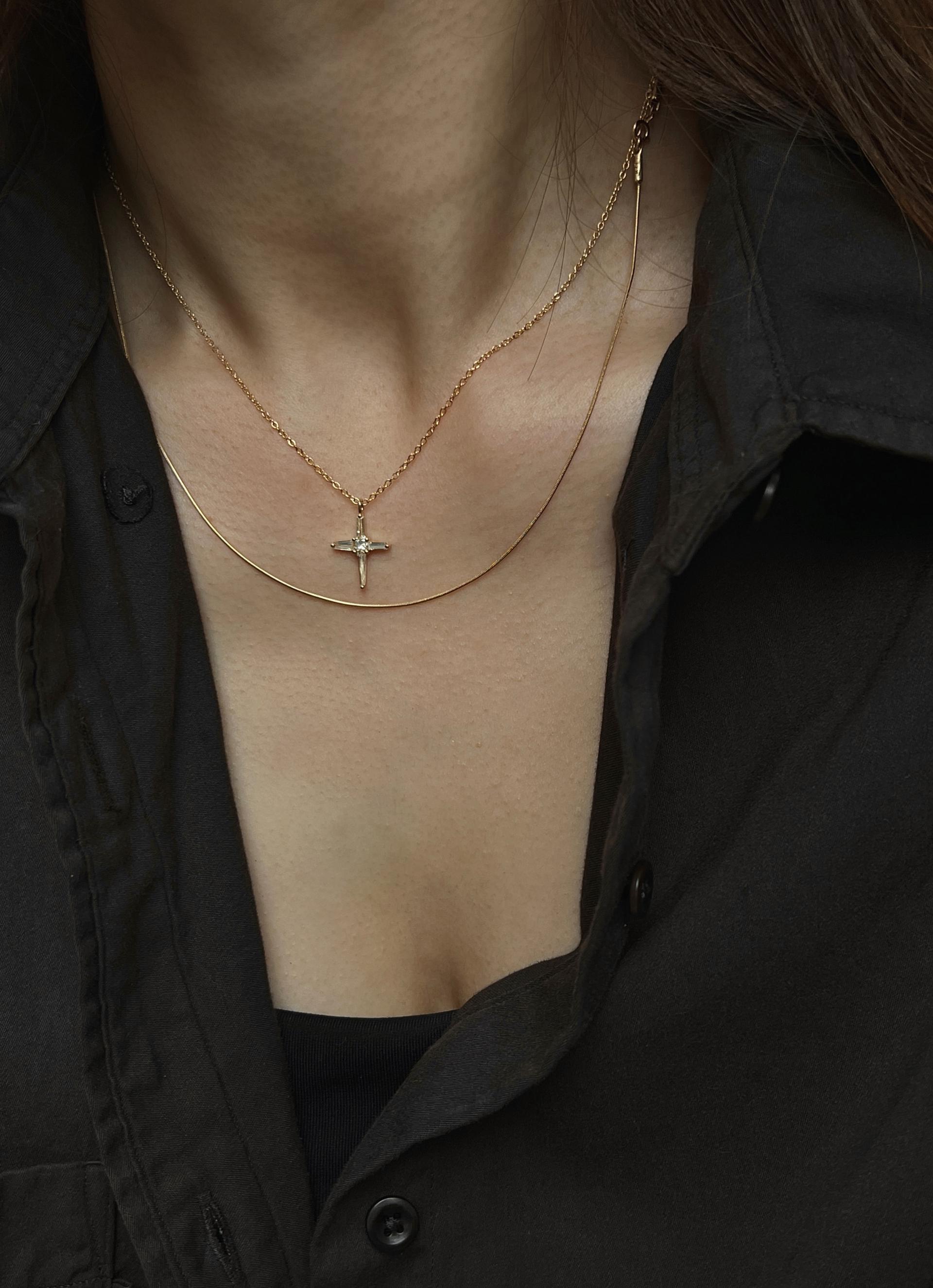 고유한 형태의 천연 테이퍼드 다이아가 세팅된 십자가 네크리스입니다. 정교한 세공을 거쳐 마치 결점없는 거울처럼 투명한 빛을 반사하며, 고요하지만 강렬한 존재감을 드러냅니다.