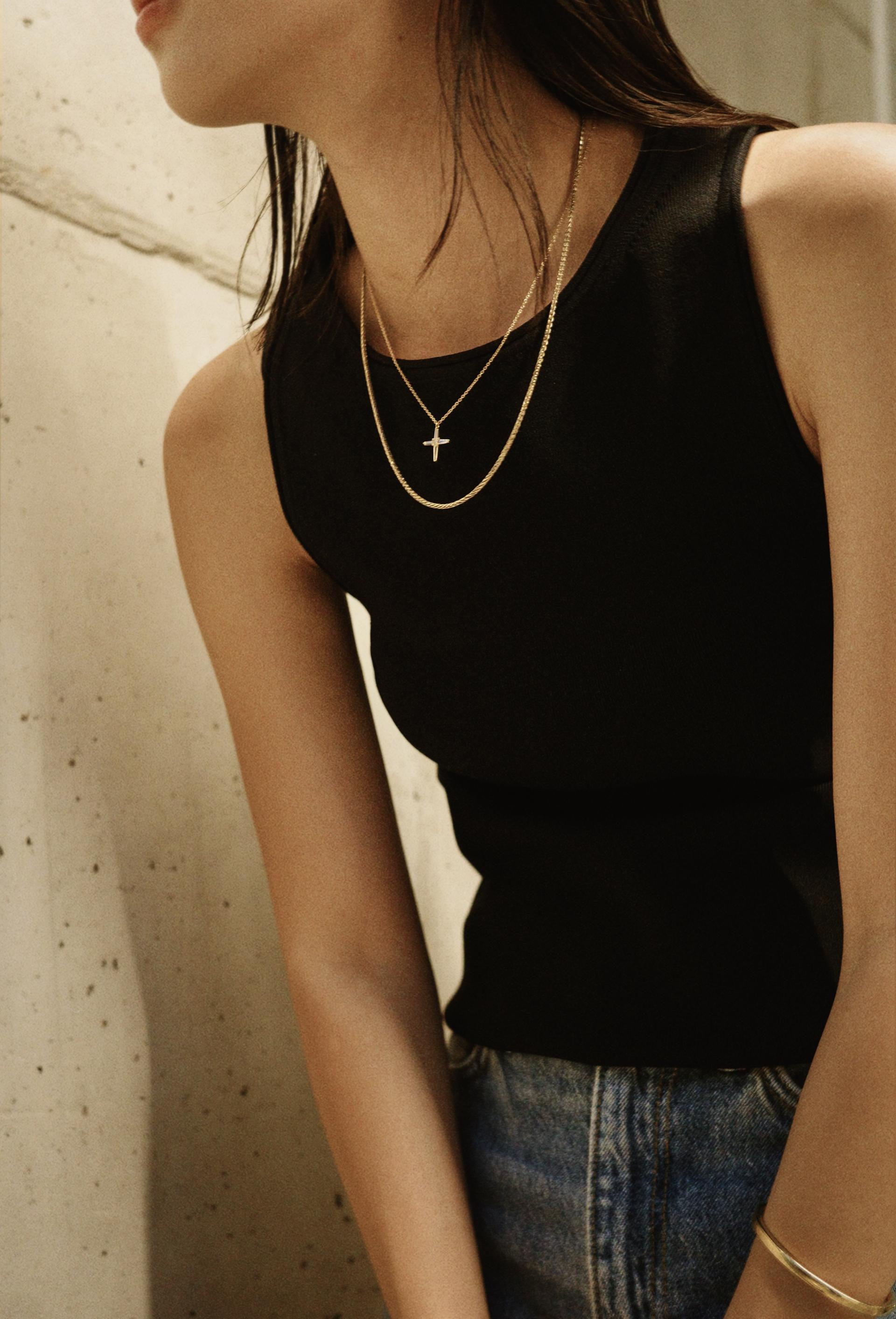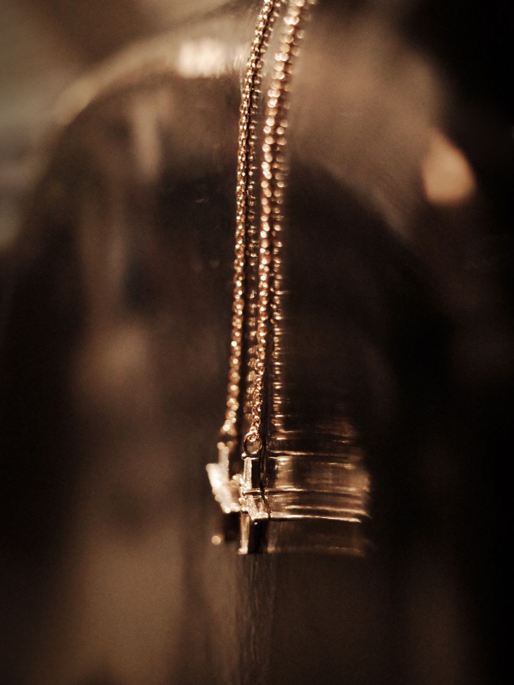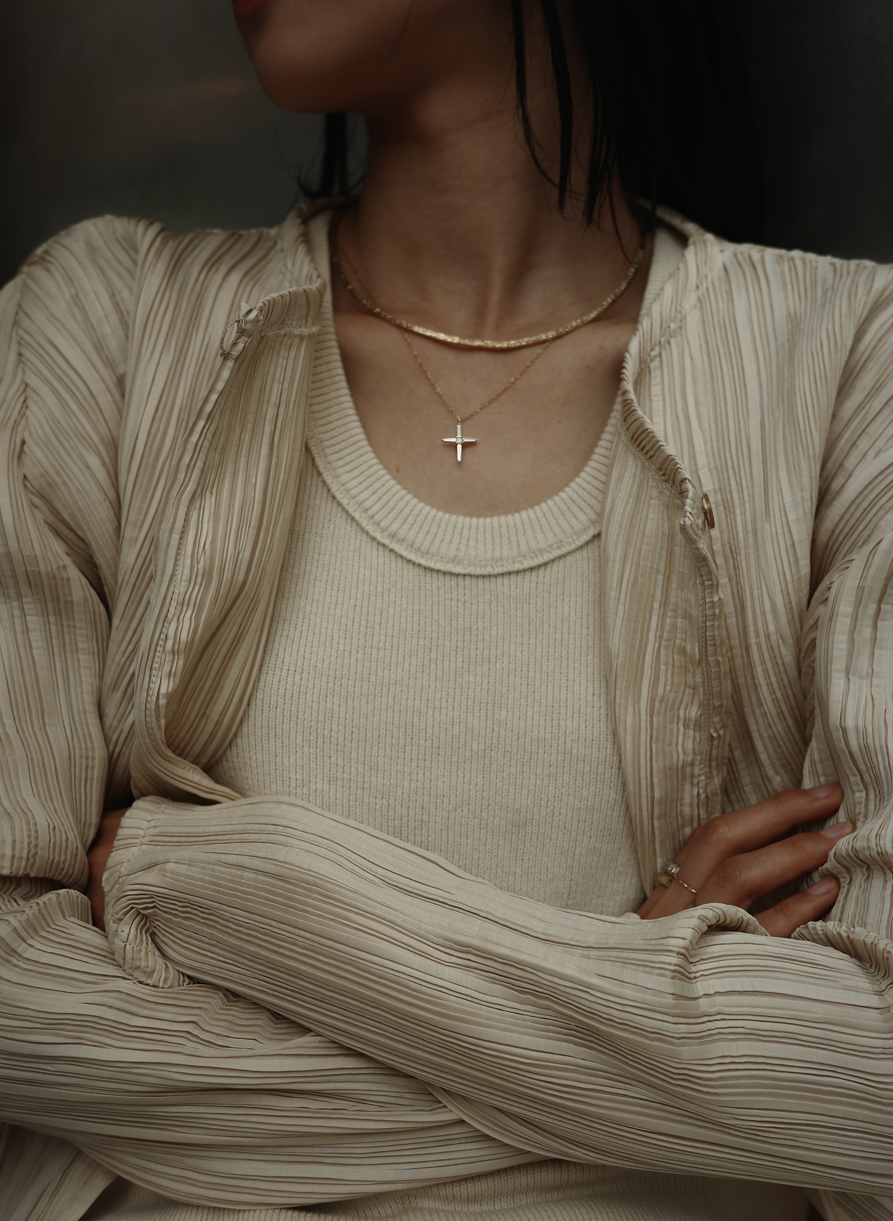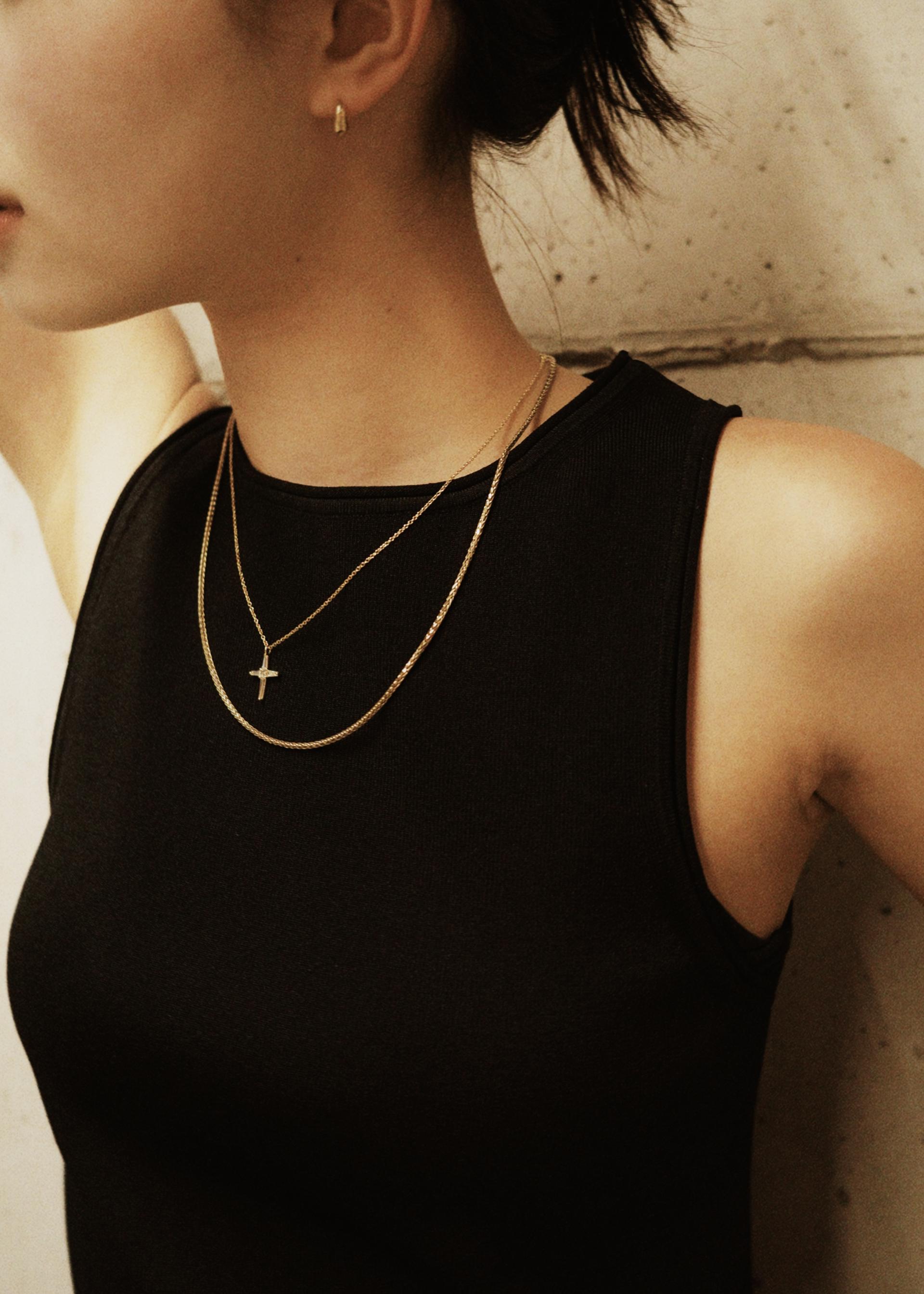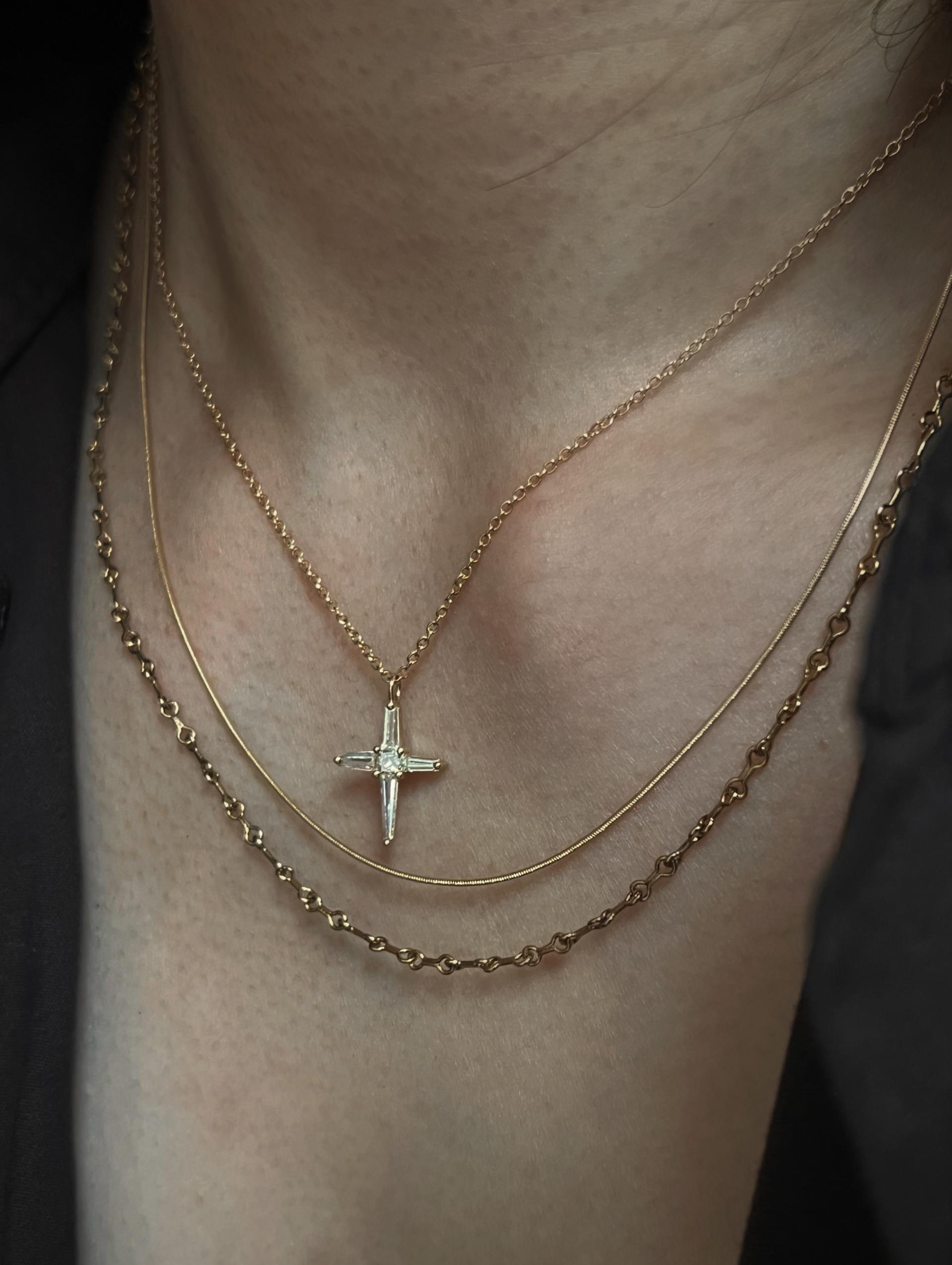 고유한 형태의 천연 테이퍼드 다이아가 세팅된 십자가 네크리스입니다. 정교한 세공을 거쳐 마치 결점없는 거울처럼 투명한 빛을 반사하며, 고요하지만 강렬한 존재감을 드러냅니다.