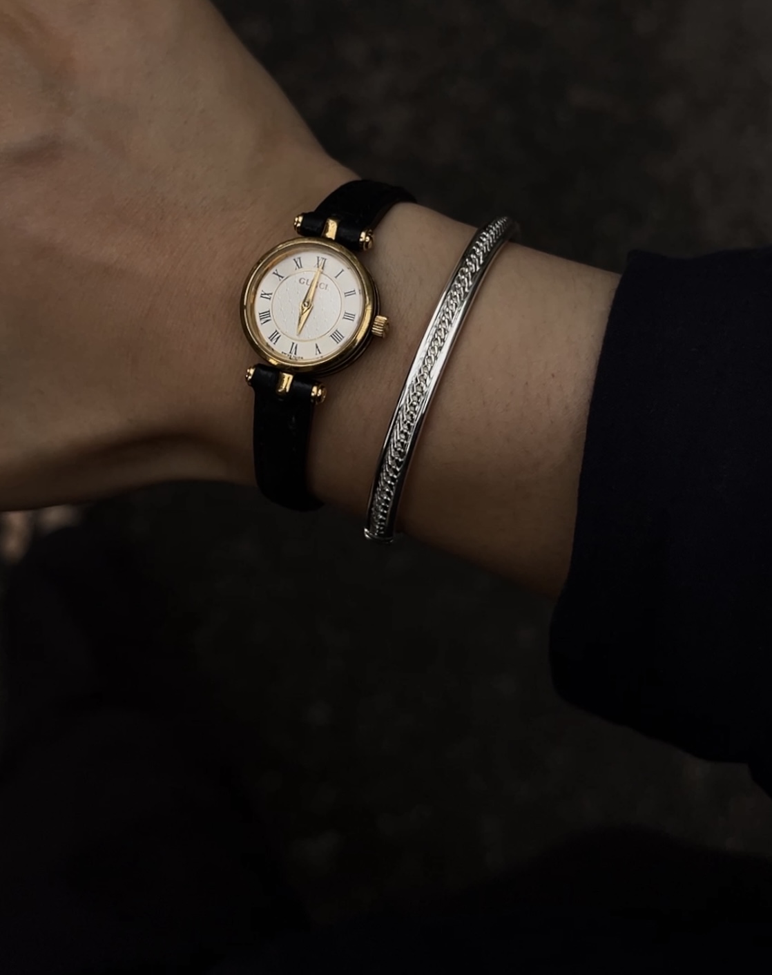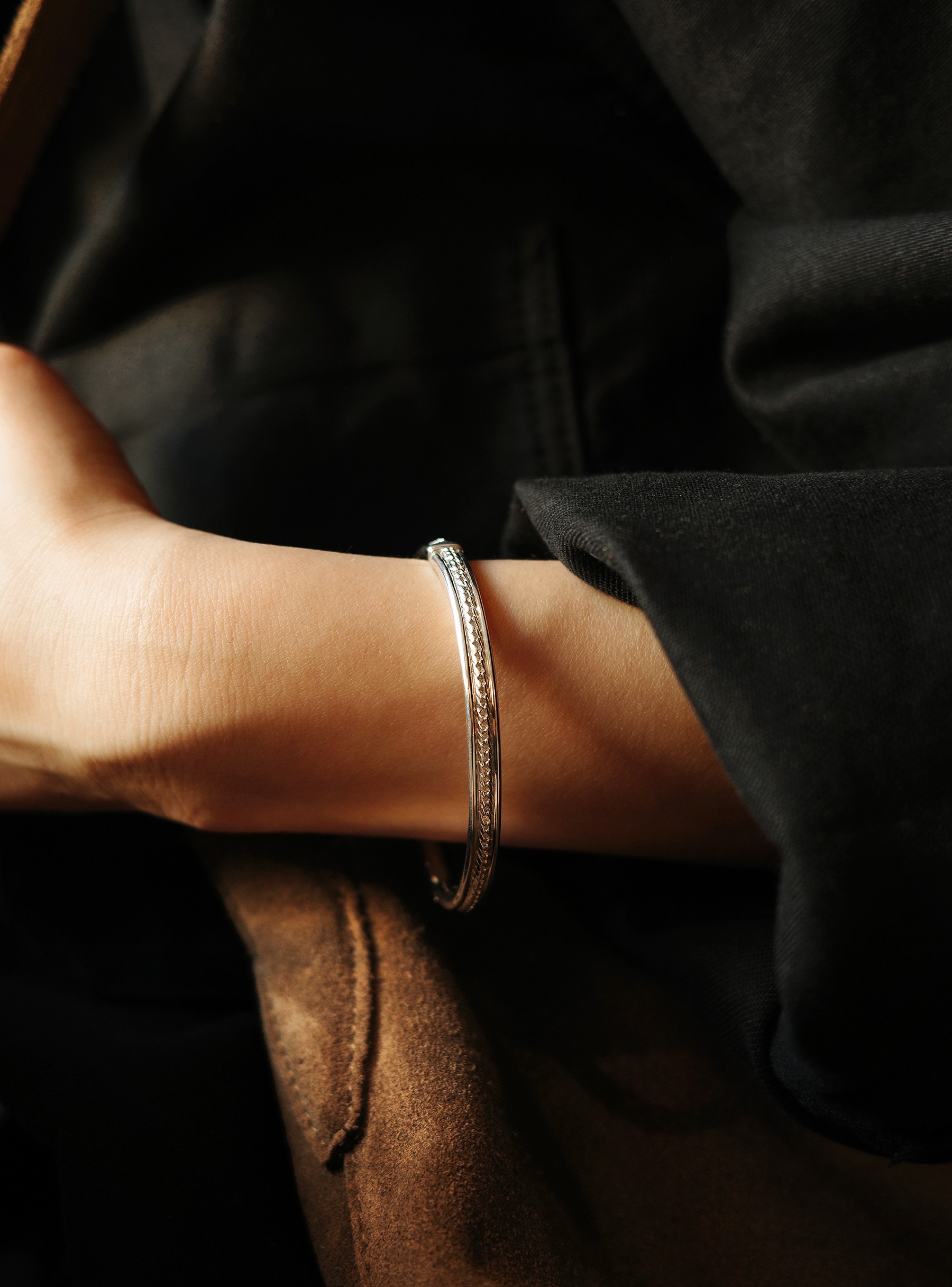 유려한 곡선으로 양 끝을 마감한 구조적 실루엣 위에 매듭 디테일이 정교하게 얹힌 힌지형 뱅글입니다. 묵직한 두께에 견고한 힌지 마감으로 손목을 안정감있게 감싸며, 미니멀한 룩에 단독 착용만으로도 인상적인 분위기를 완성합니다.