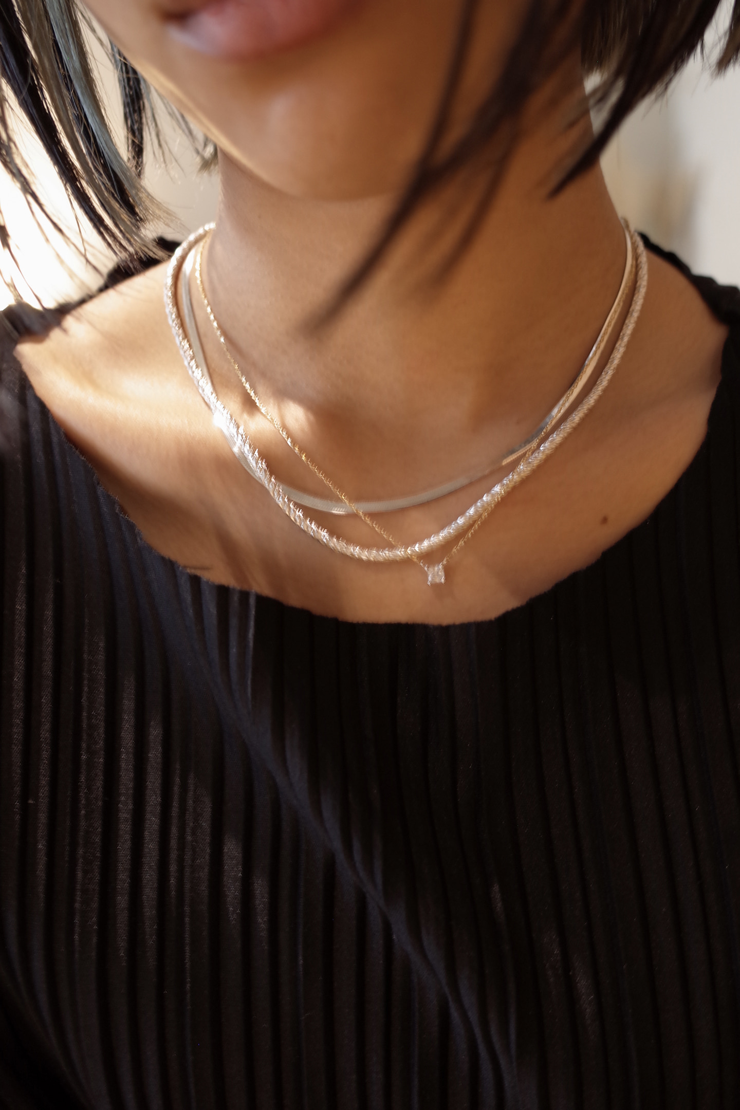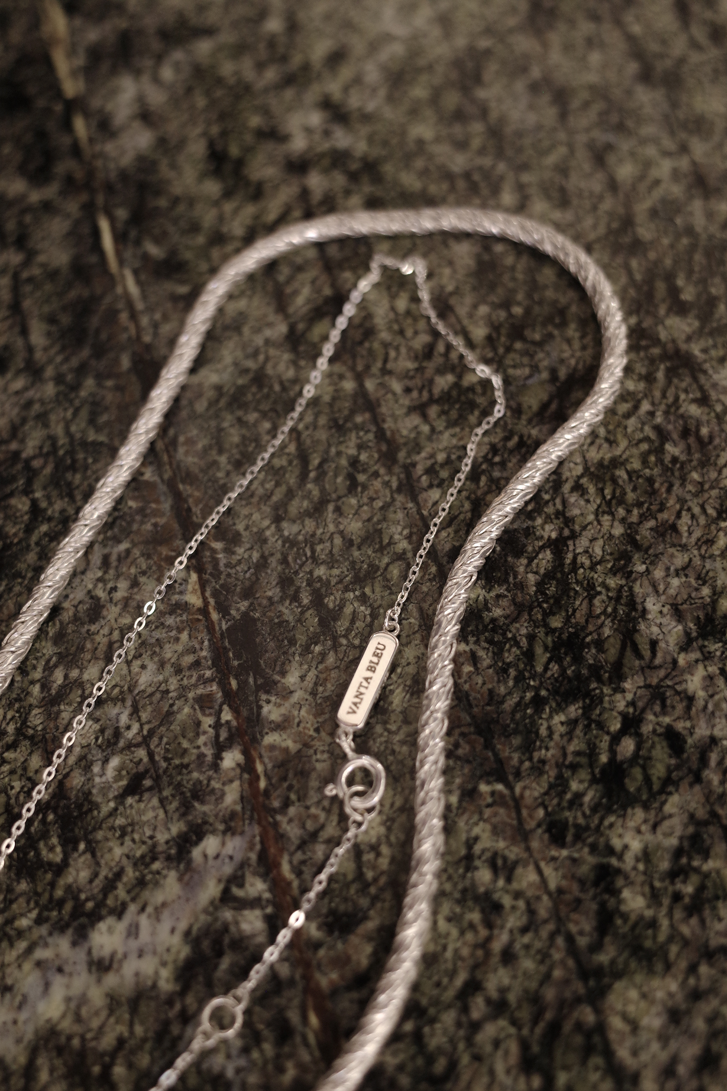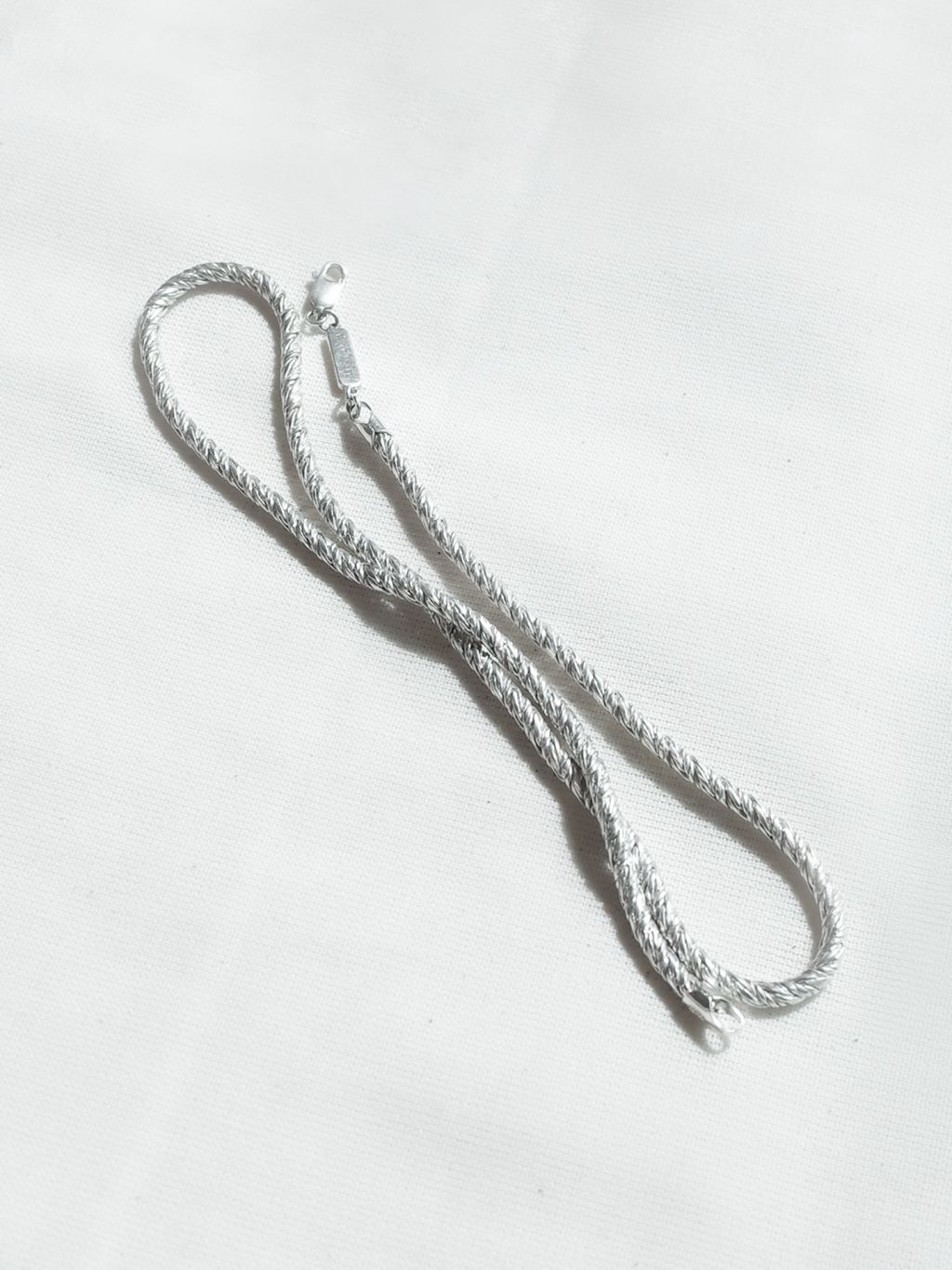 가느다란 실을 촘촘히 엮어 땋은 듯 만듦새가 정교한 두께감있는 반무광 로프 체인 네크리스
