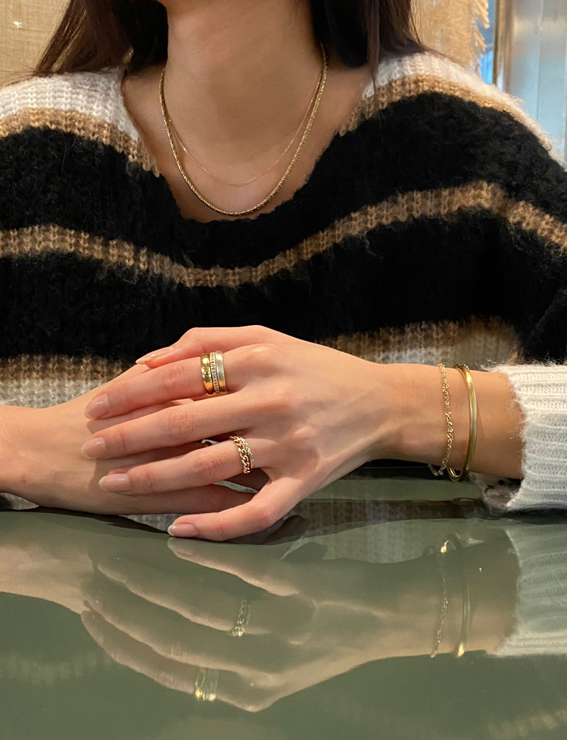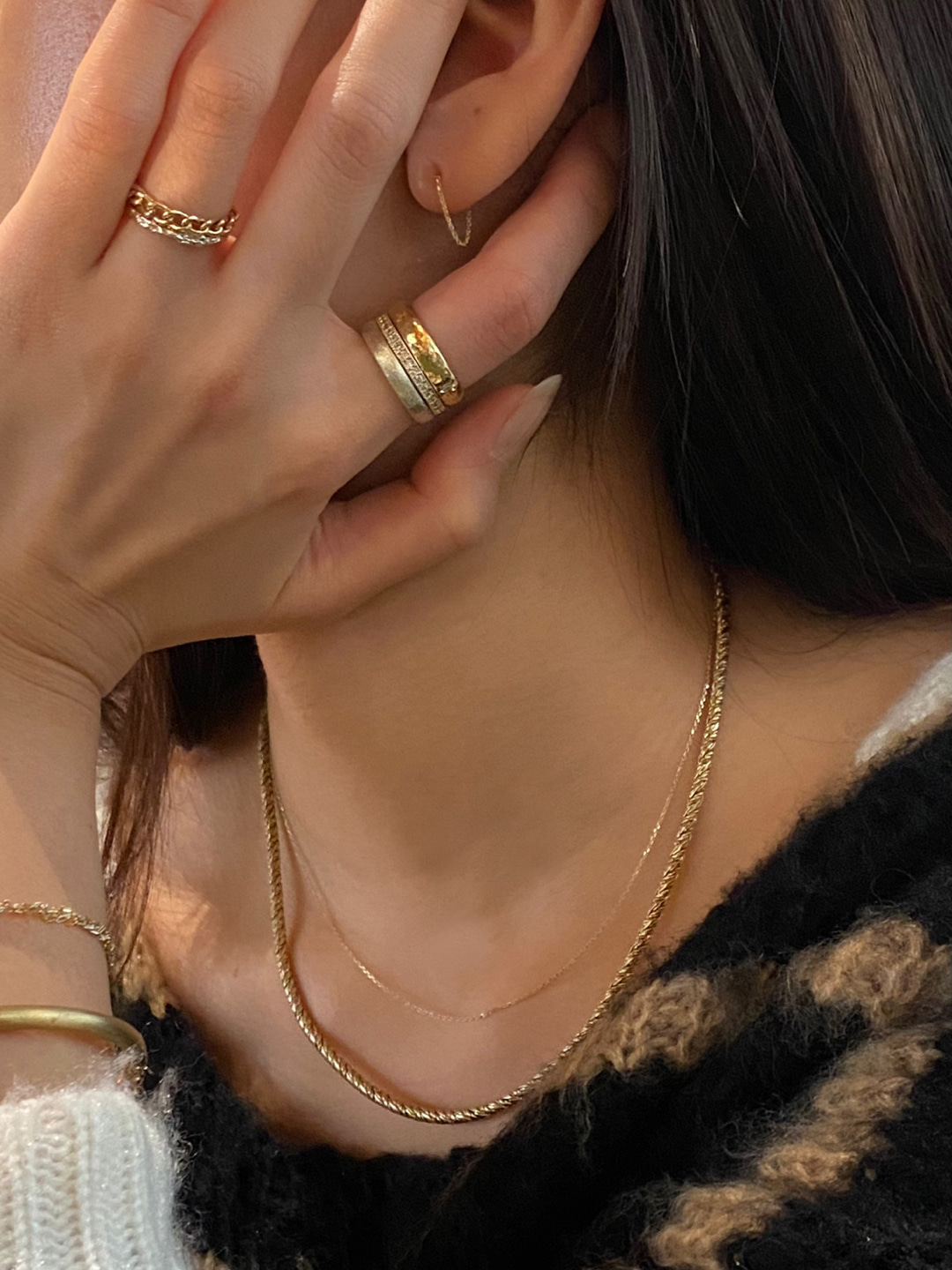 두께감있는 원형의 로프 체인 네크리스는 얇은 실같은 체인들로 이루어져 유동적인 흐름을 지닌 제품입니다. 촘촘하게 엮인 체인 사이로 은은하게 빛나는 광택감이 매력적인 제품입니다.