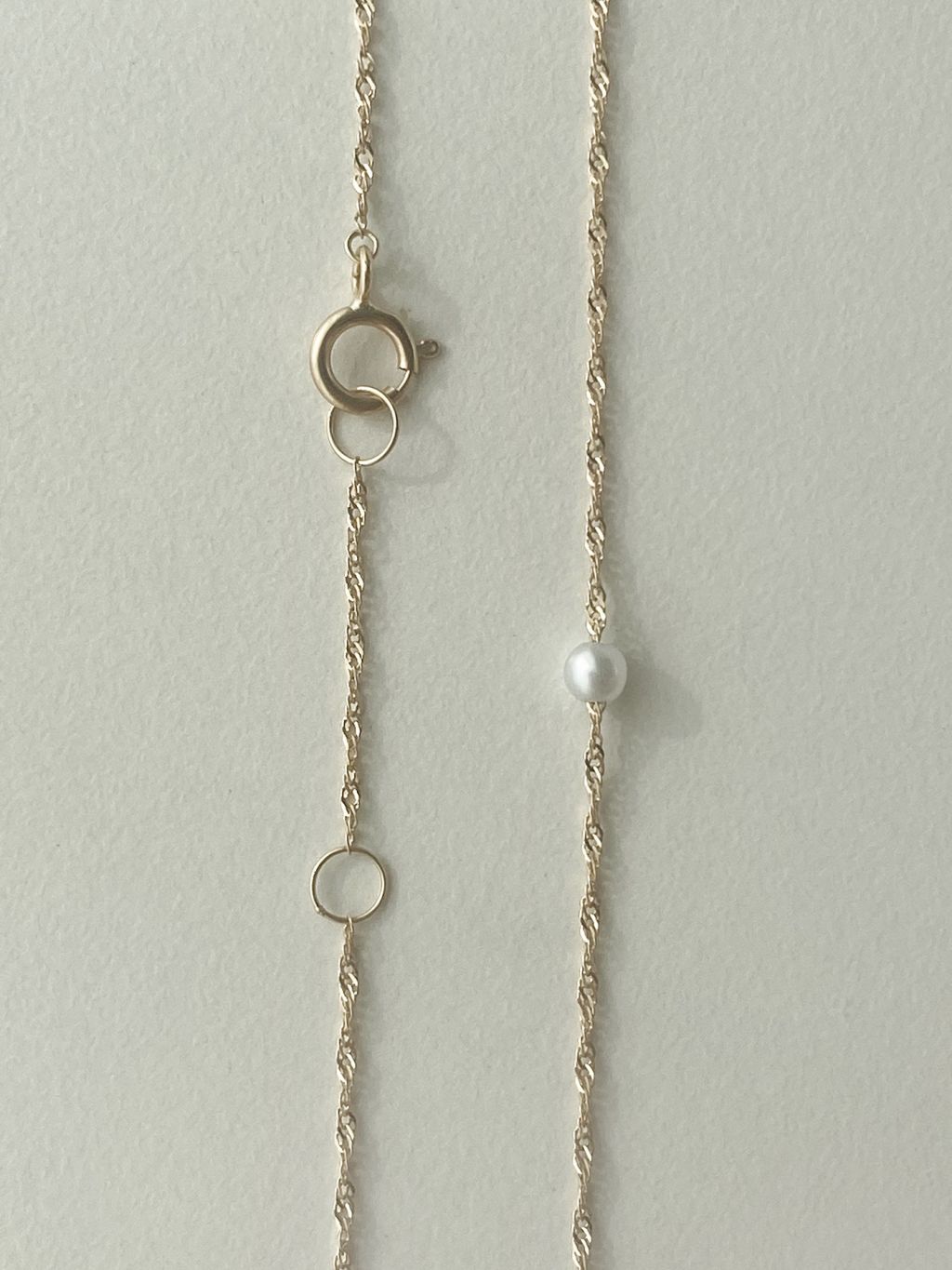 얇은 트위스트 체인에 아담한 담수 진주가 통과된 페미닌 무드 네크리스