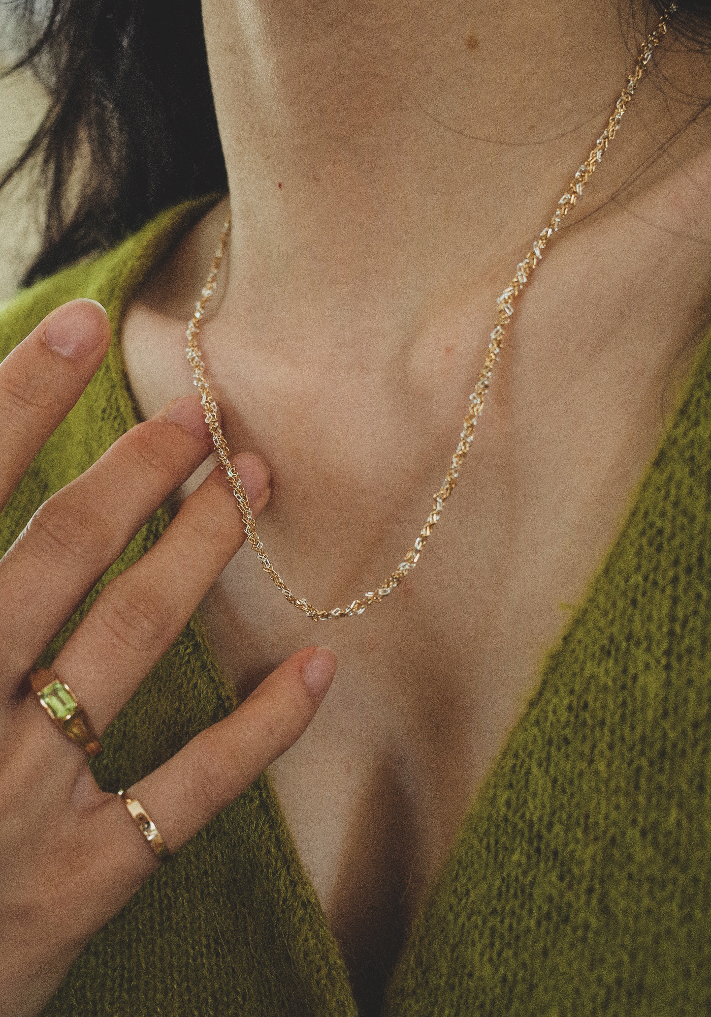 불꽃, 정열을 의미하는 피아마 시리즈는 살갗에 자연스럽게 흐르는 잔잔한 반짝임이 특징입니다. Fiamma II은 Fiamma I 보다 성글게 짜여 중성적인 무드를 선호하시는 분들께 추천드립니다.