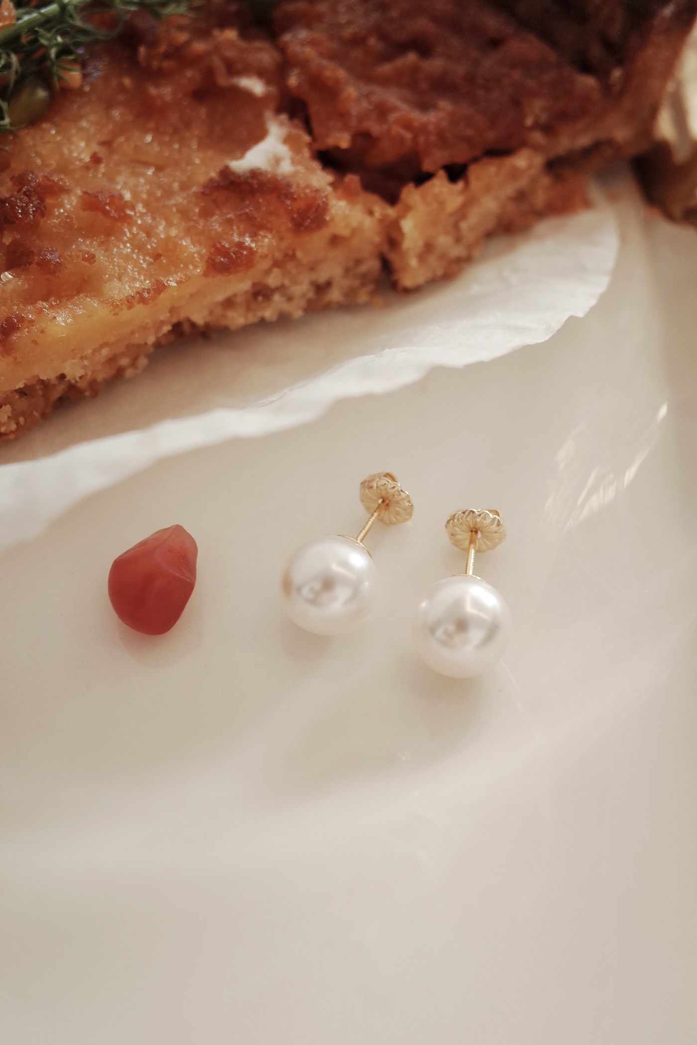 간결한 침 형태의 진주 귀걸이에 꽃잎 형태의 마감 장식 디테일이 돋보이는 정통 클래식 이어링