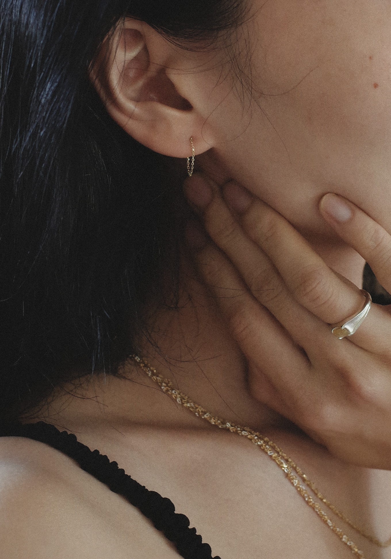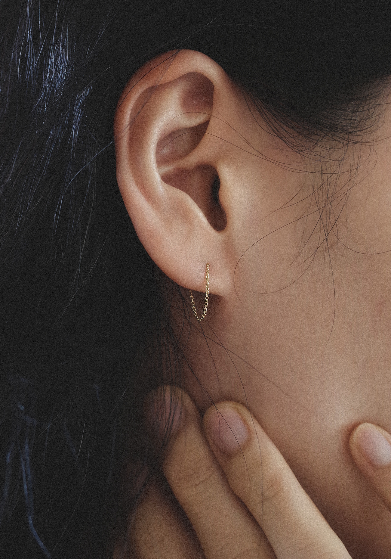 귓볼 앞에서 떨어지는 체인이 뒷장식과 연결된 심플한 드롭형 이어링