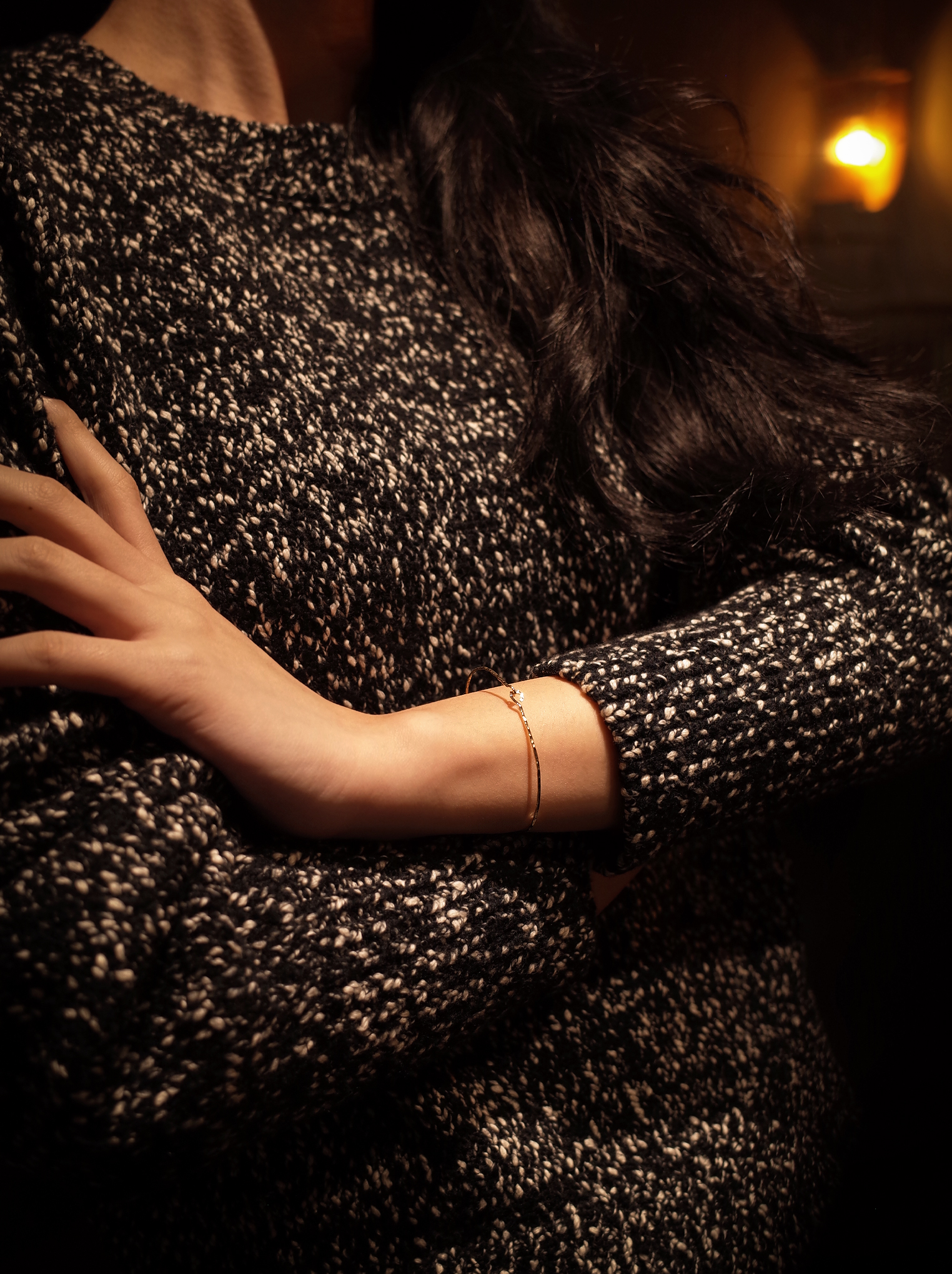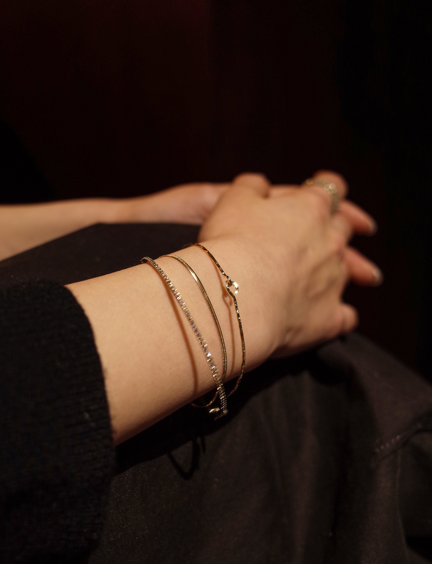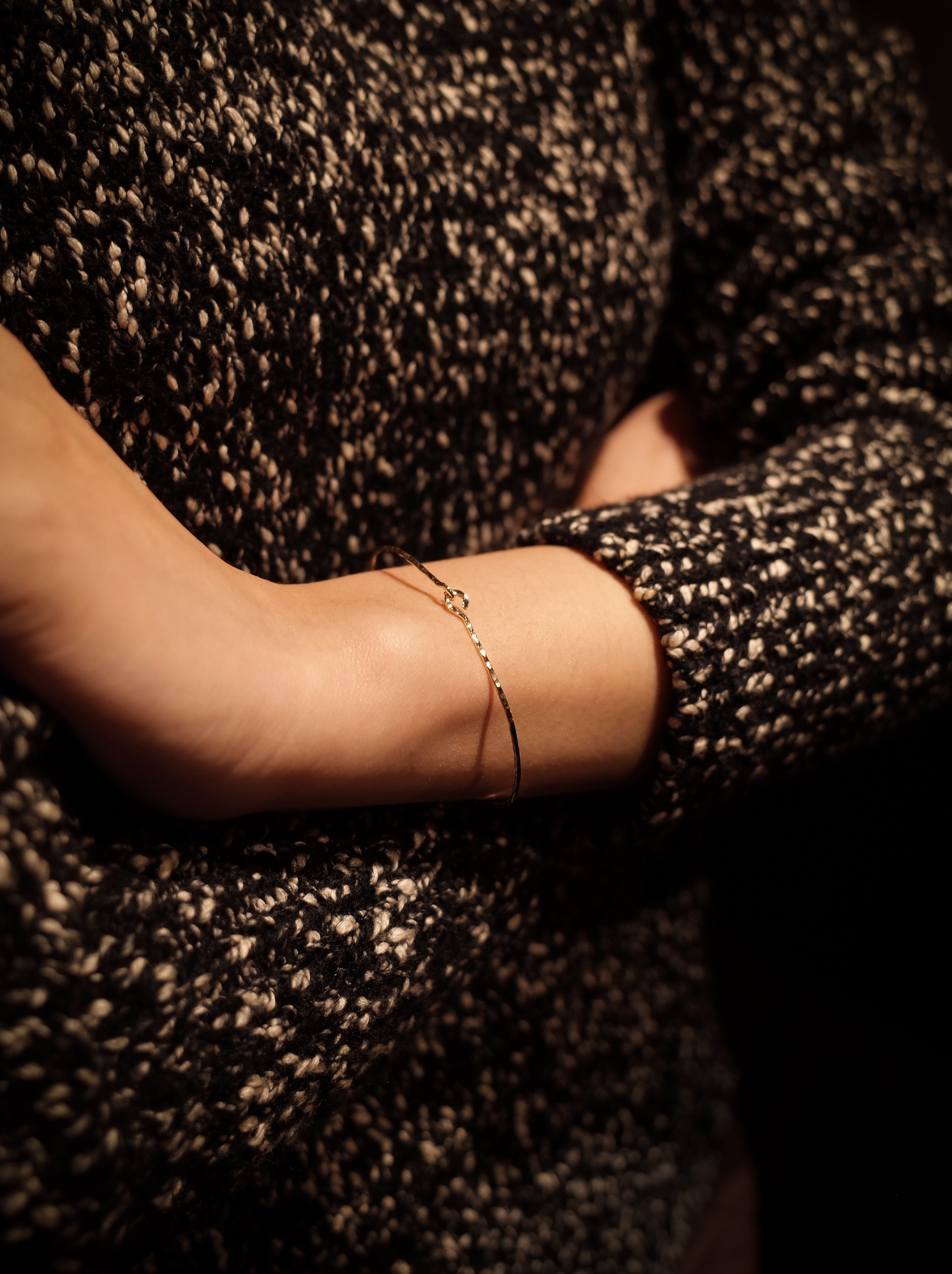 덧붙임없이 하나의 금선에서 시작되어 마무리되는 후크형 뱅글입니다. 단순한 외형이지만 수공예 특유의 러프한 질감과 빈티지한 걸쇠의 형태만으로도 작은 위트를 충분히 느낄 수 있는 제품입니다. 착용감이 편안하고 탈착이 용이하여 데일리웨어로 추천드립니다.